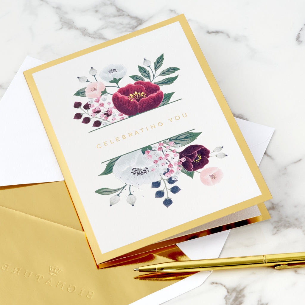 Printed on high-quality board, this card pops-up into a 3D diorama of a bouquet of flowers. This card features metallic gold foil details, die-cut details, with the message 'Celebrating you' on the front and comes complete with a Hallmark branded, white envelope with gold foil lining.