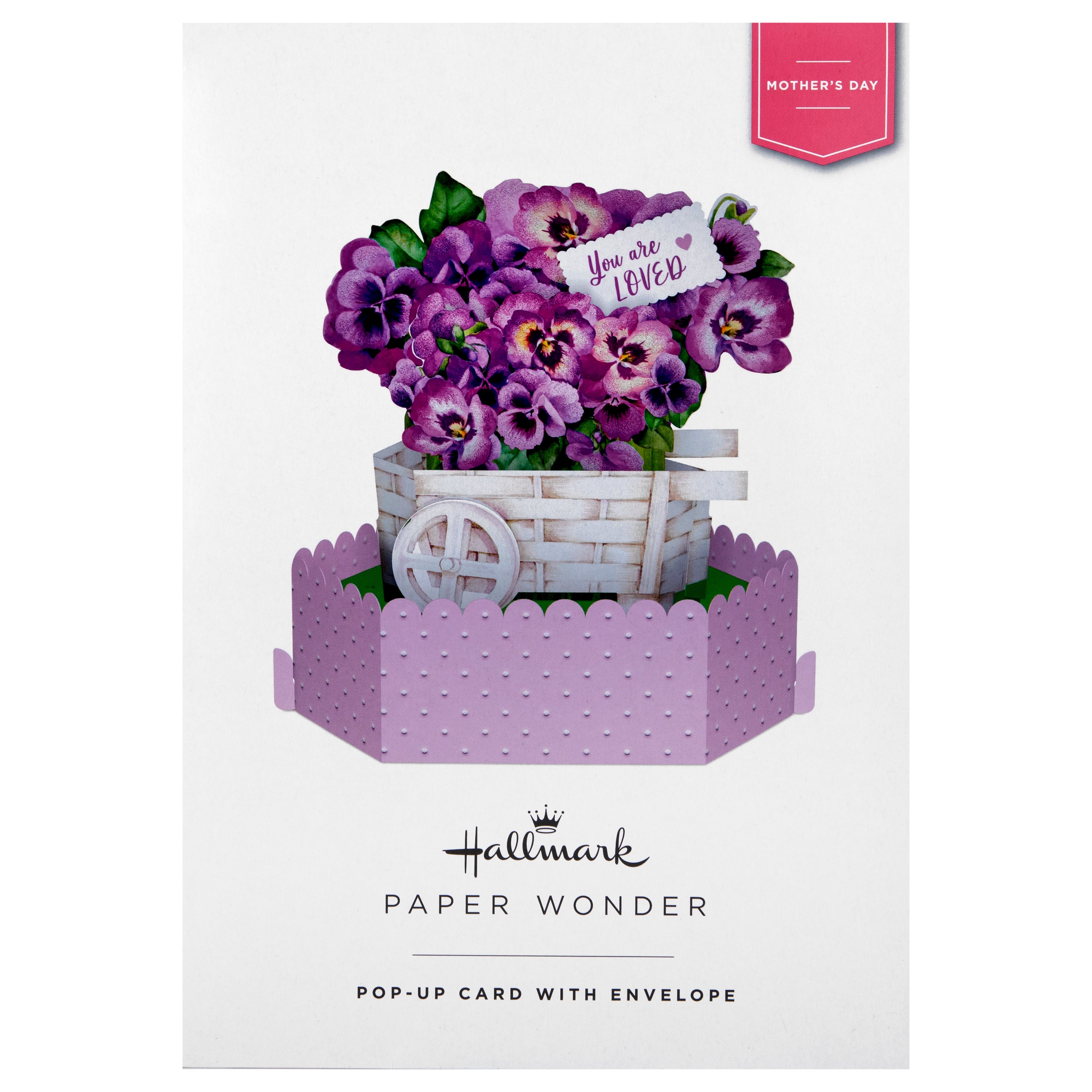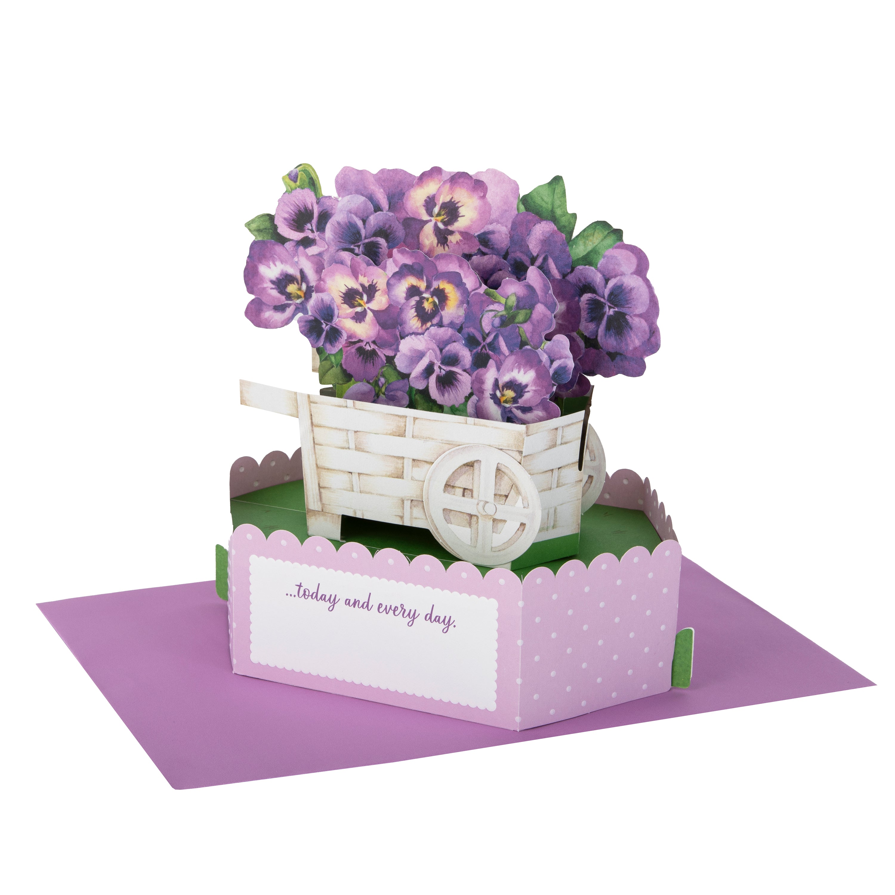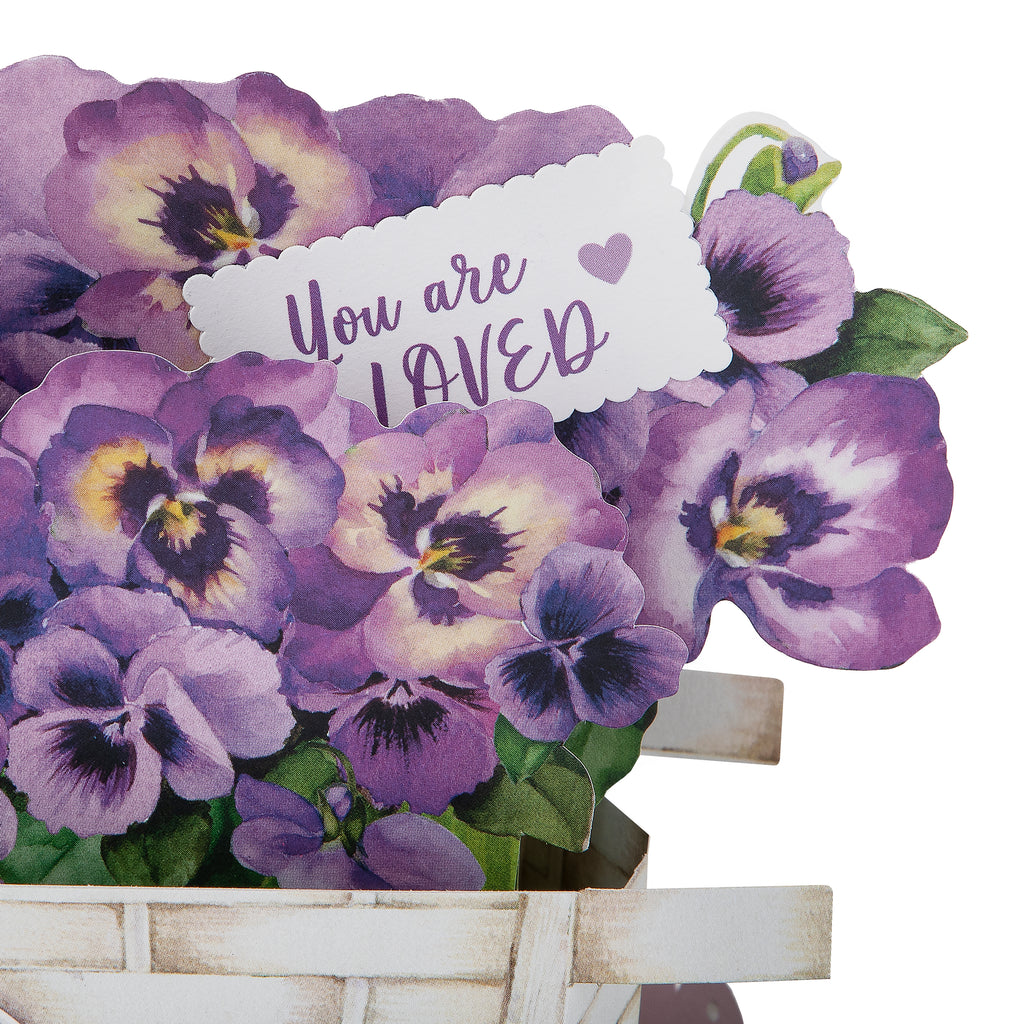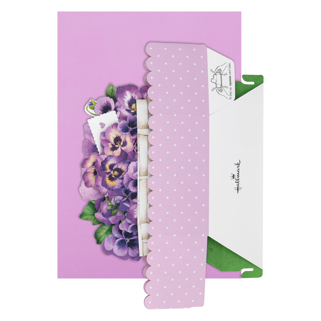 Printed on high-quality board, this card pops up into a 3D diorama of a flower cart with beautiful purple pansy florals. This card features a die-cut details, embossed elements, and comes complete with a co-ordinating Hallmark branded, purple envelope.