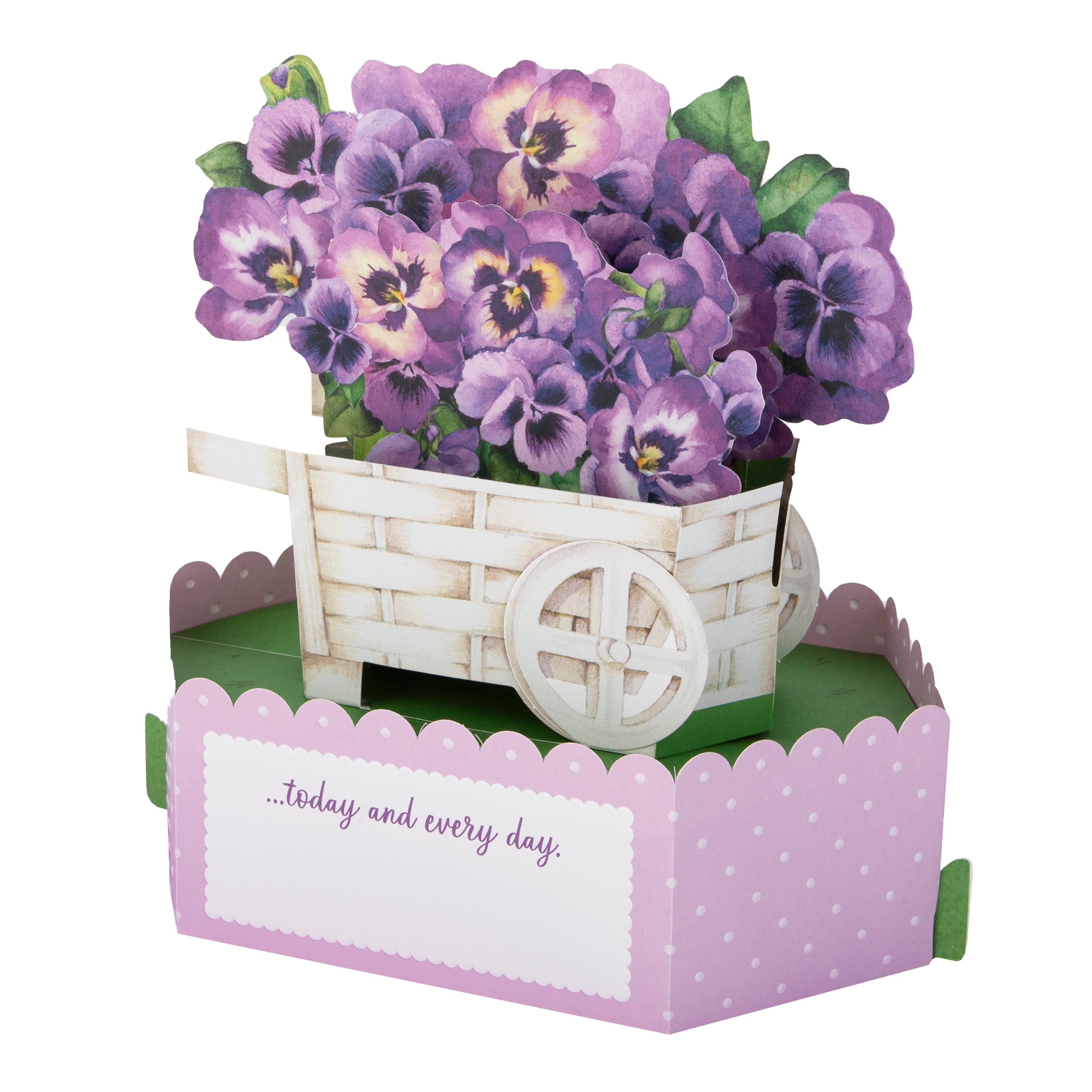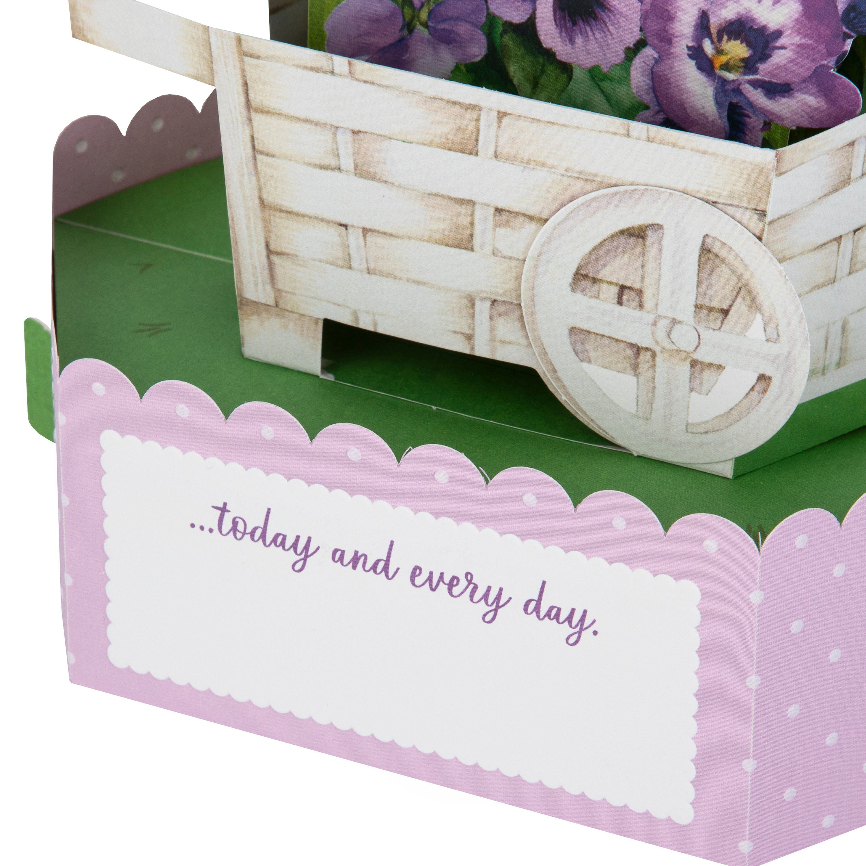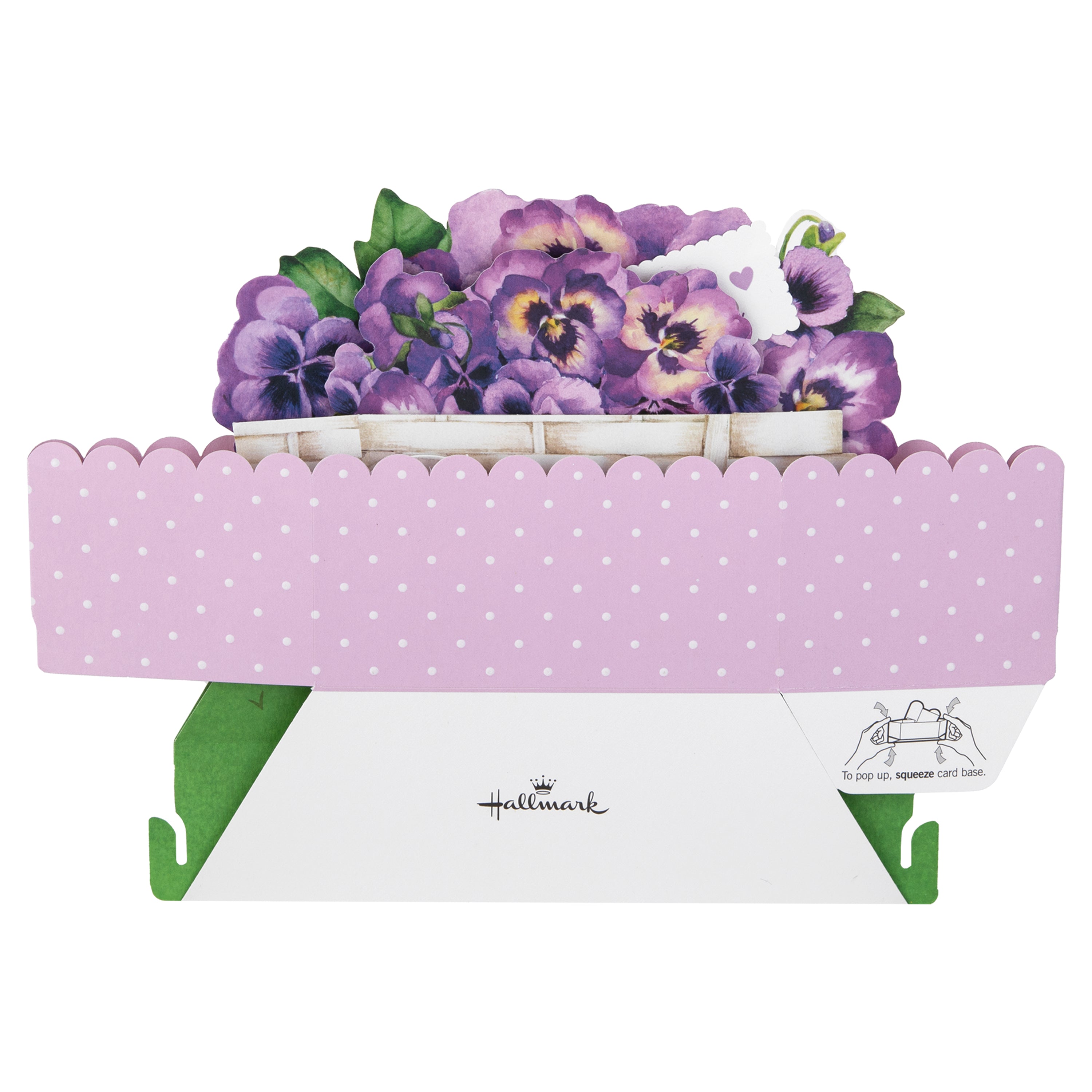 Printed on high-quality board, this card pops up into a 3D diorama of a flower cart with beautiful purple pansy florals. This card features a die-cut details, embossed elements, and comes complete with a co-ordinating Hallmark branded, purple envelope.