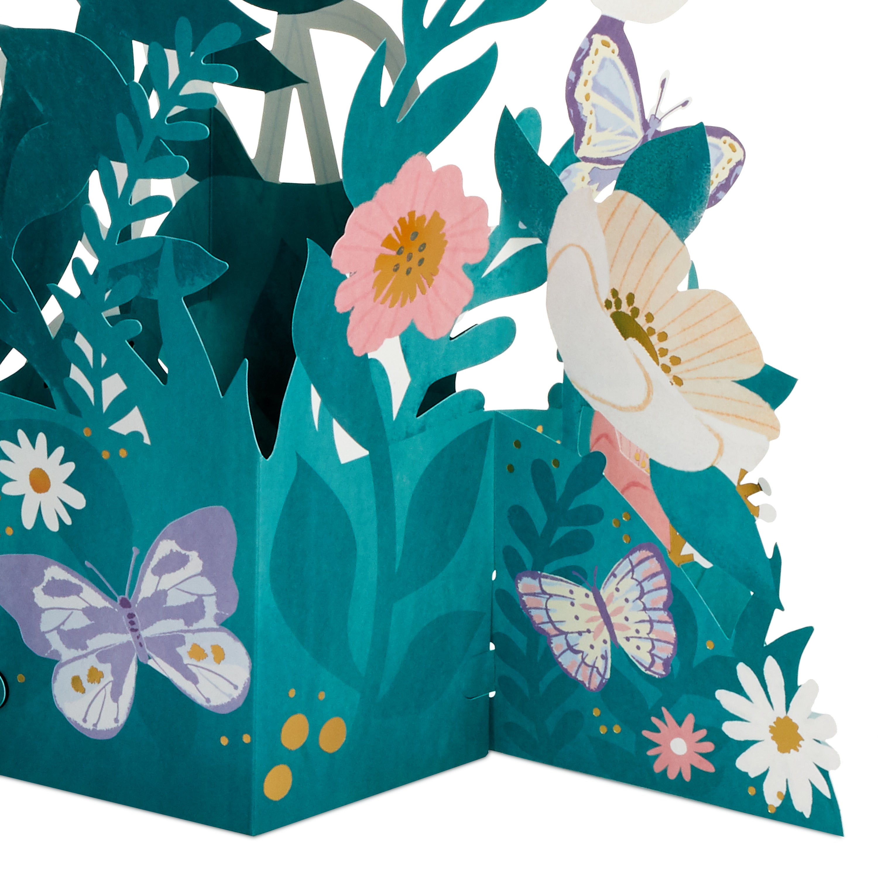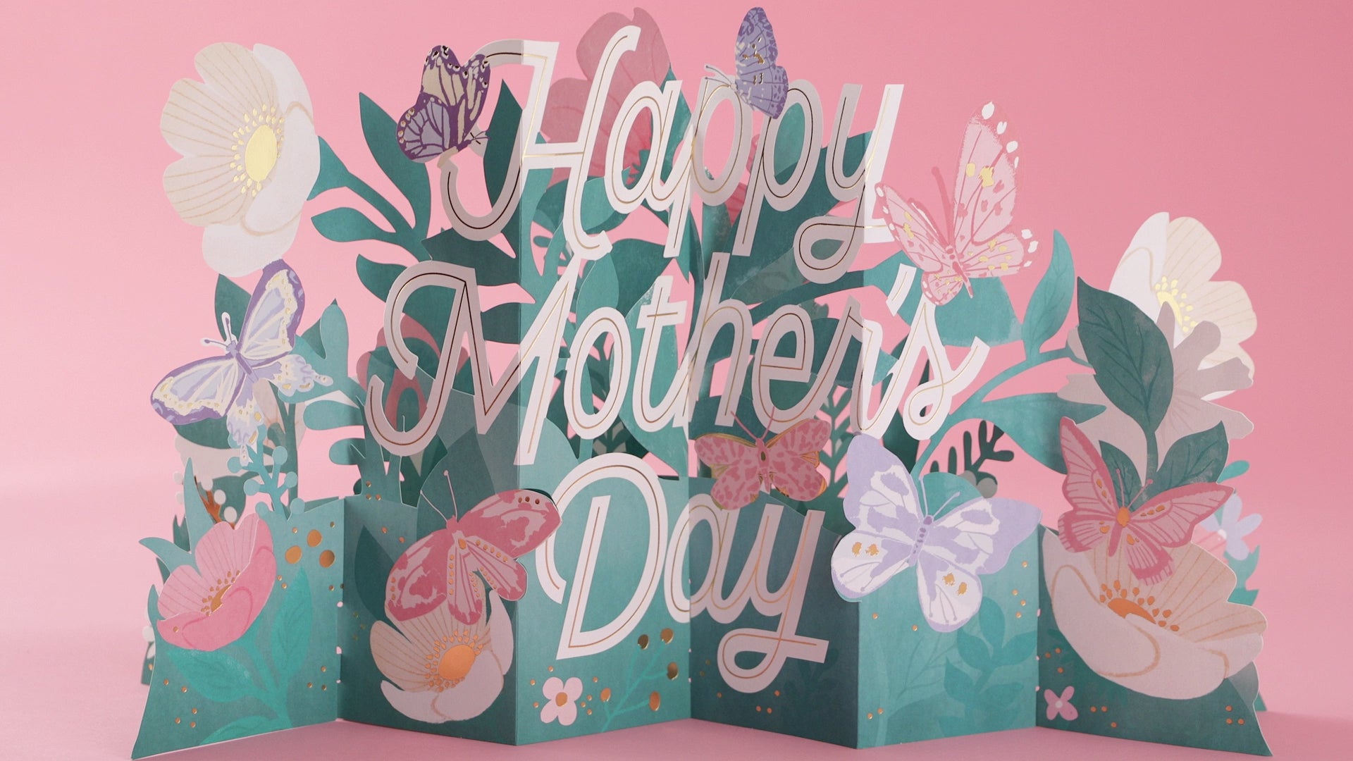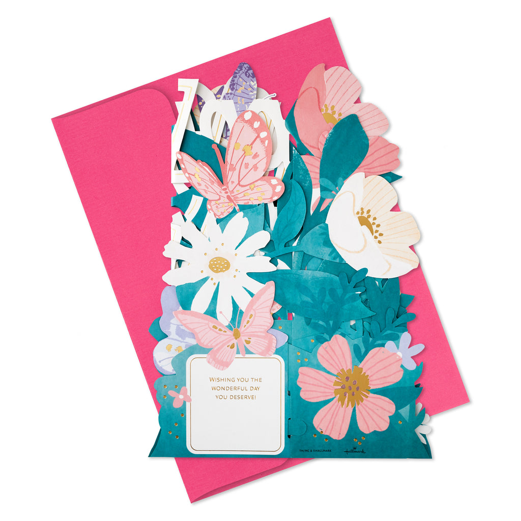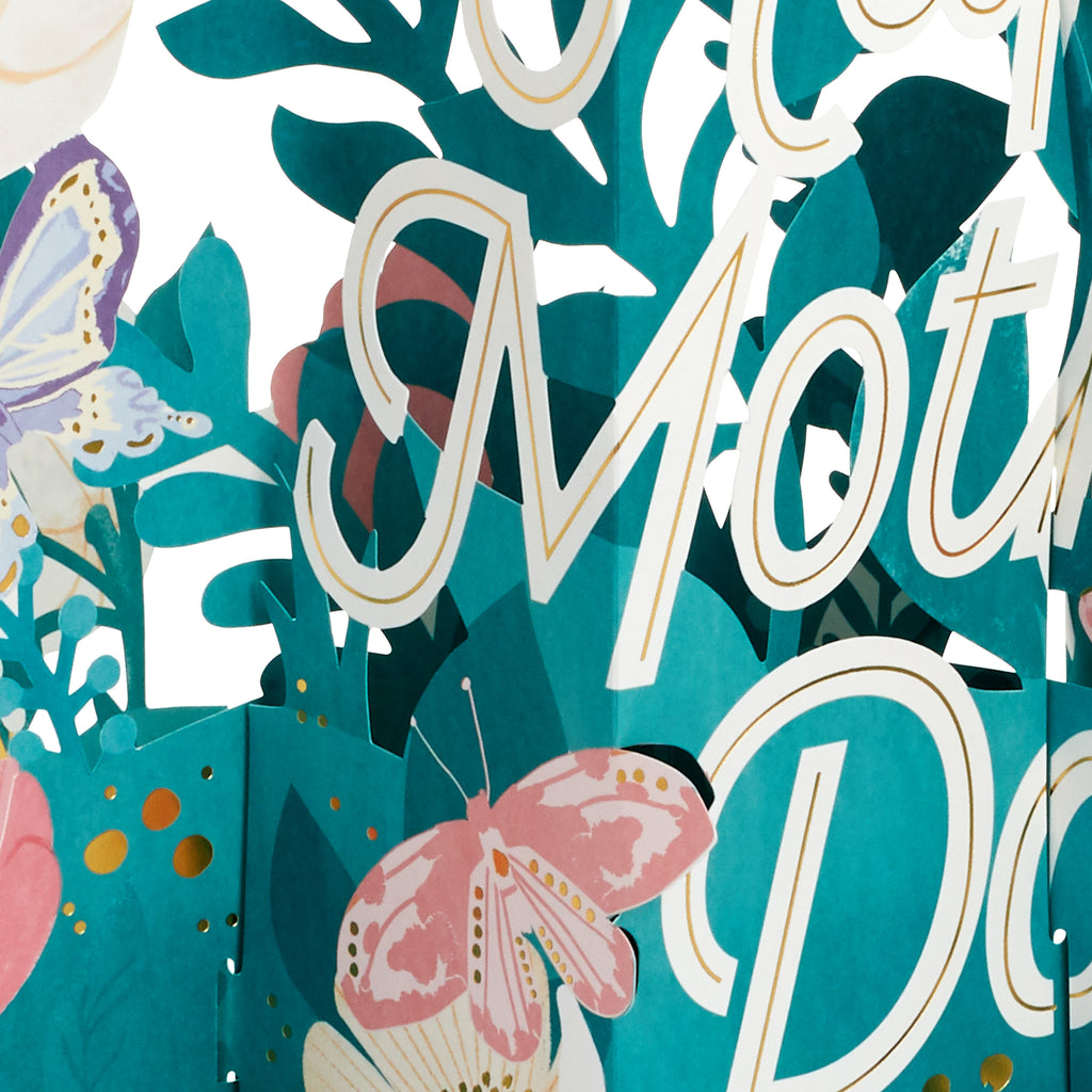 Printed on high-quality board, this card pops-up into a 3D diorama of a jumbo banner with flowers design. This card features die-cut details, metallic gold foil details, with the message 'Happy Mother's Day' on the front and comes complete with a Hallmark branded, Pink envelope.