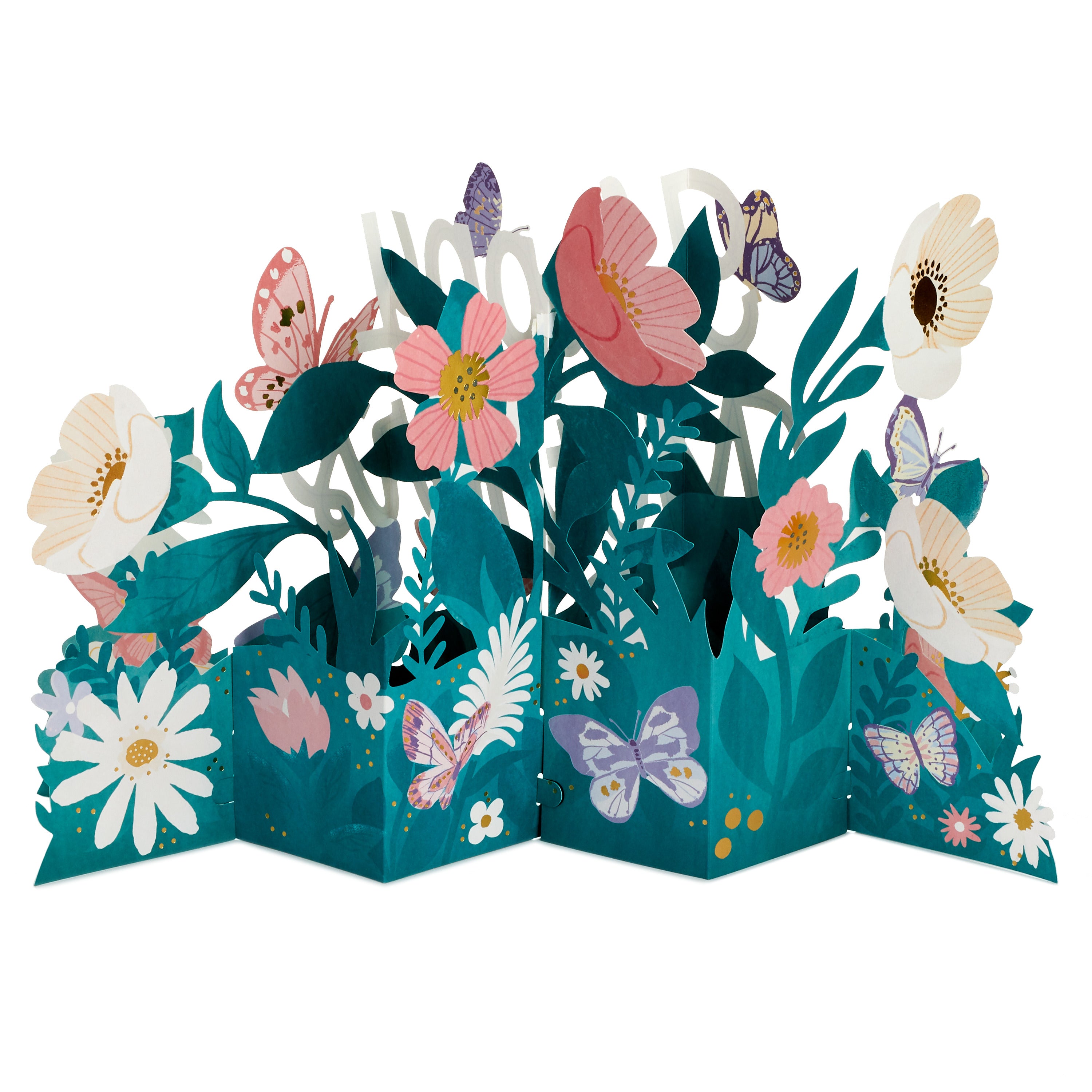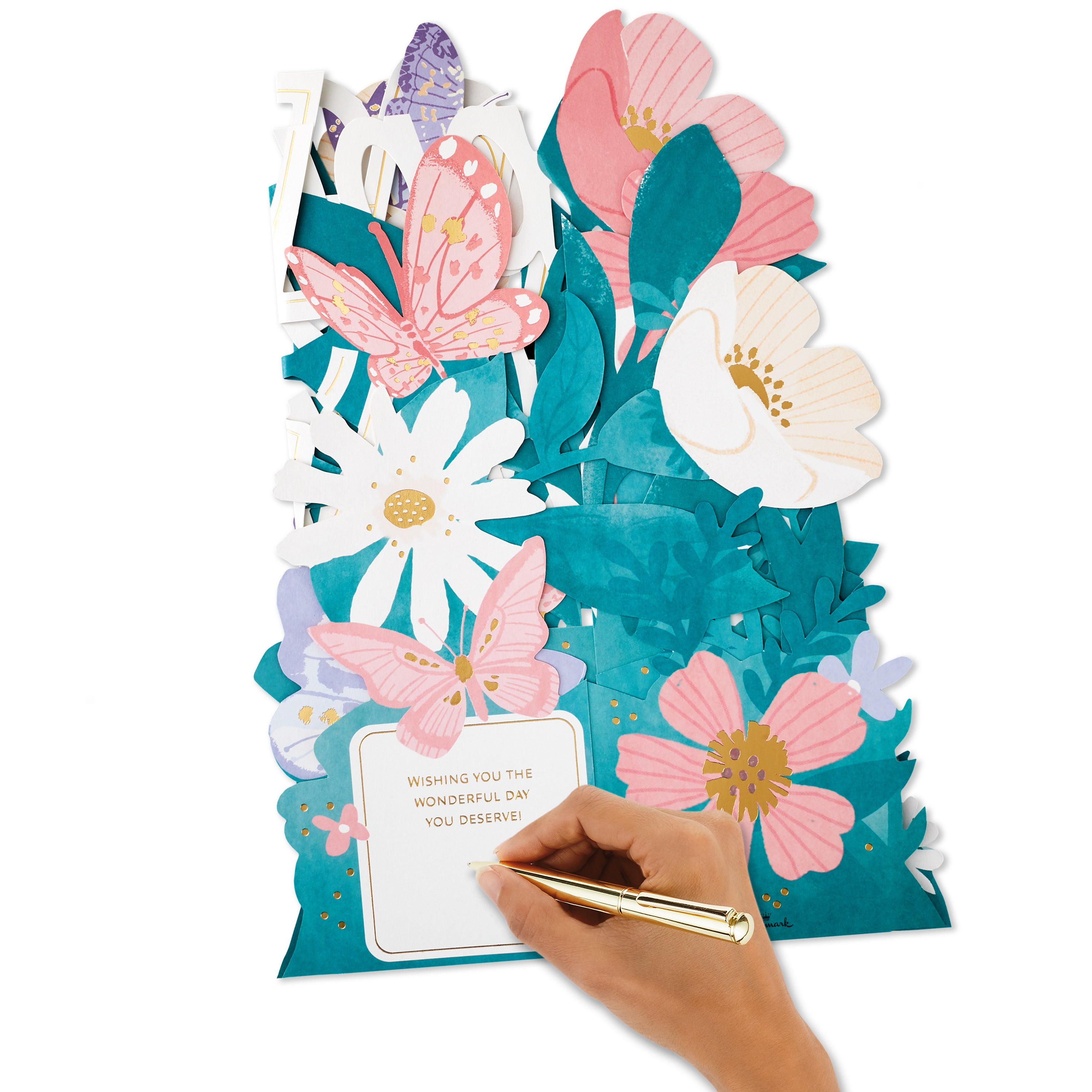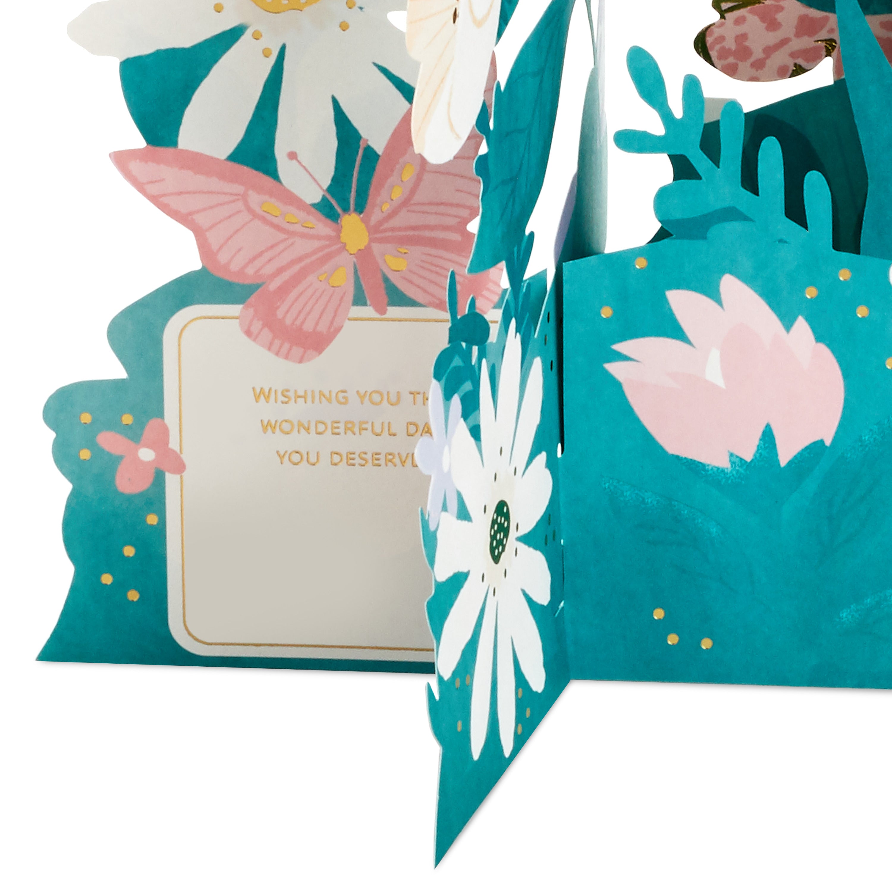 Printed on high-quality board, this card pops-up into a 3D diorama of a jumbo banner with flowers design. This card features die-cut details, metallic gold foil details, with the message 'Happy Mother's Day' on the front and comes complete with a Hallmark branded, Pink envelope.