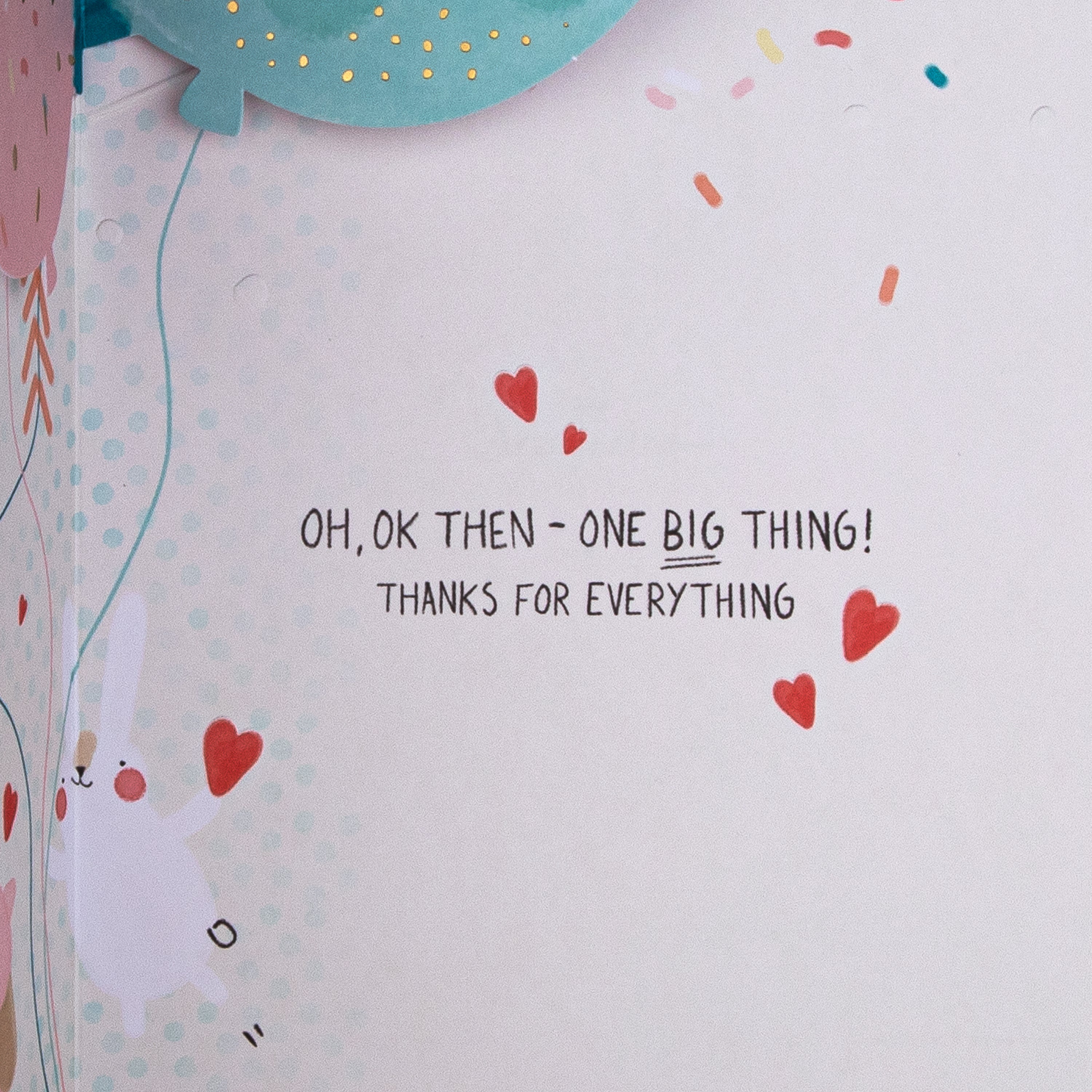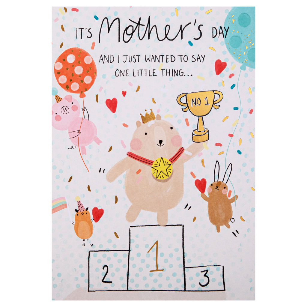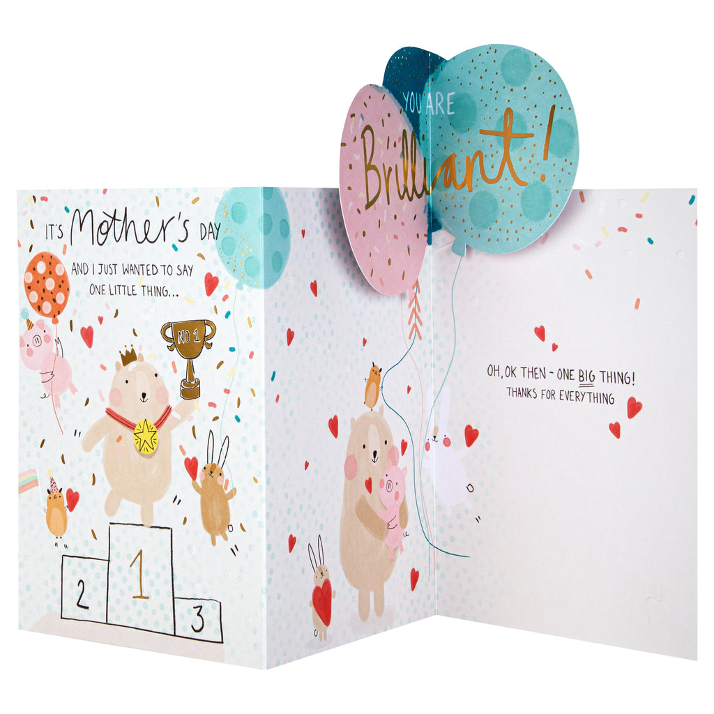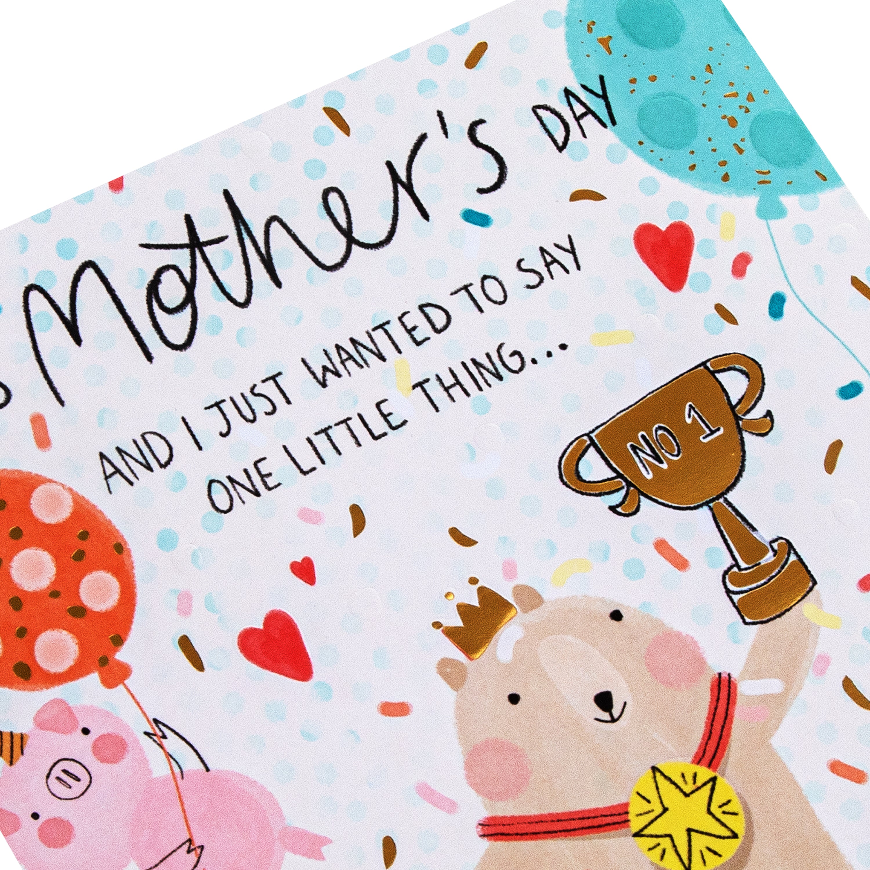 Printed on high-quality board, this card is fully recyclable and features cute animals including, a bear, pig, bunny and hamster, embossed elements, metallic gold foil details, the message 'It's Mother's Day and I just wanted to say one little thing…' on the front, and opens up to reveal a 3D pop-up die-cut balloon display. This card comes complete with a co-ordinating Hallmark branded, white confetti patterned envelope.