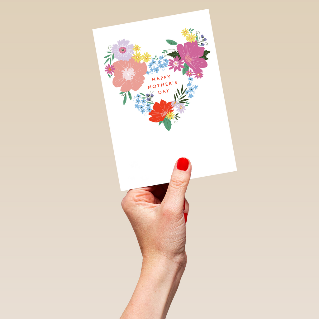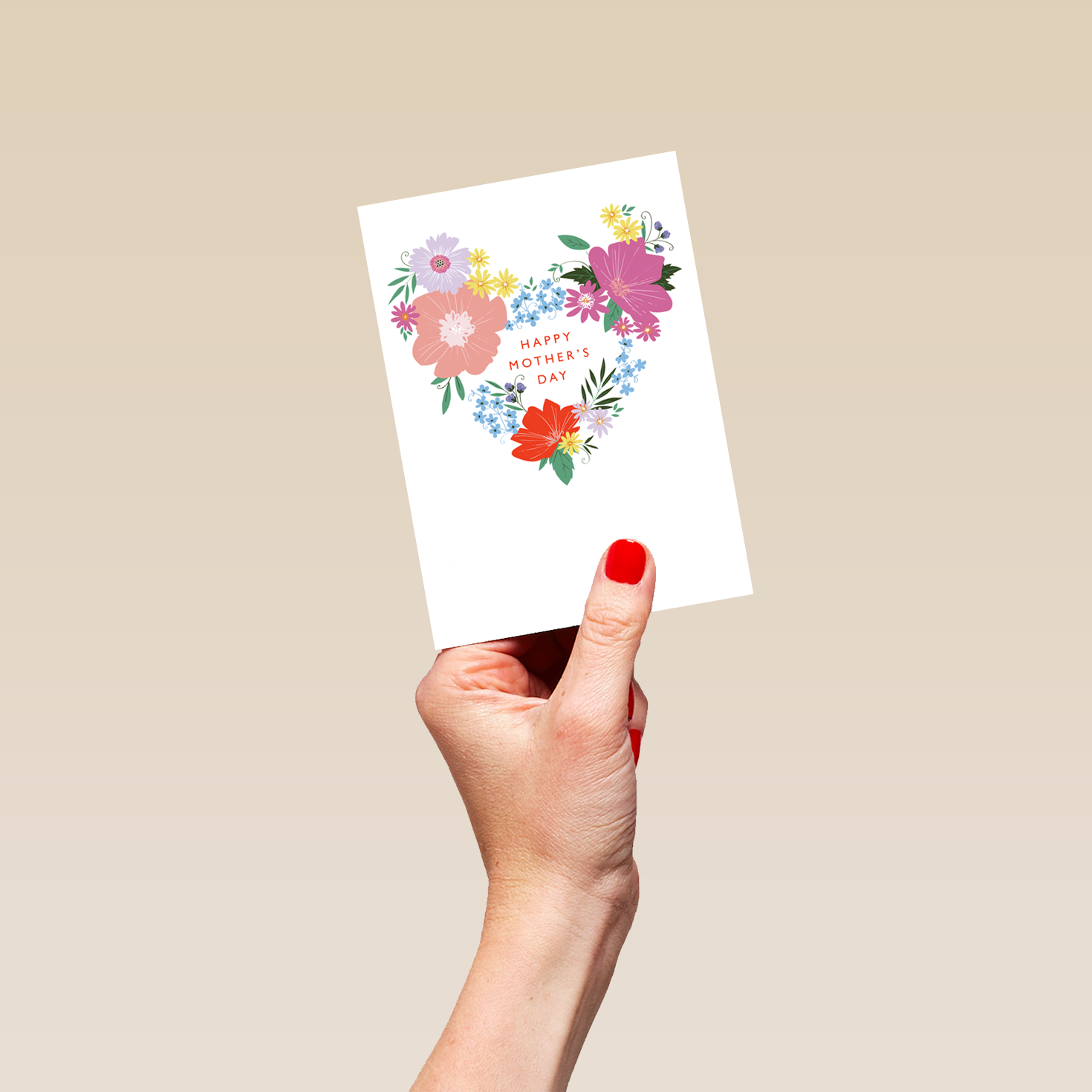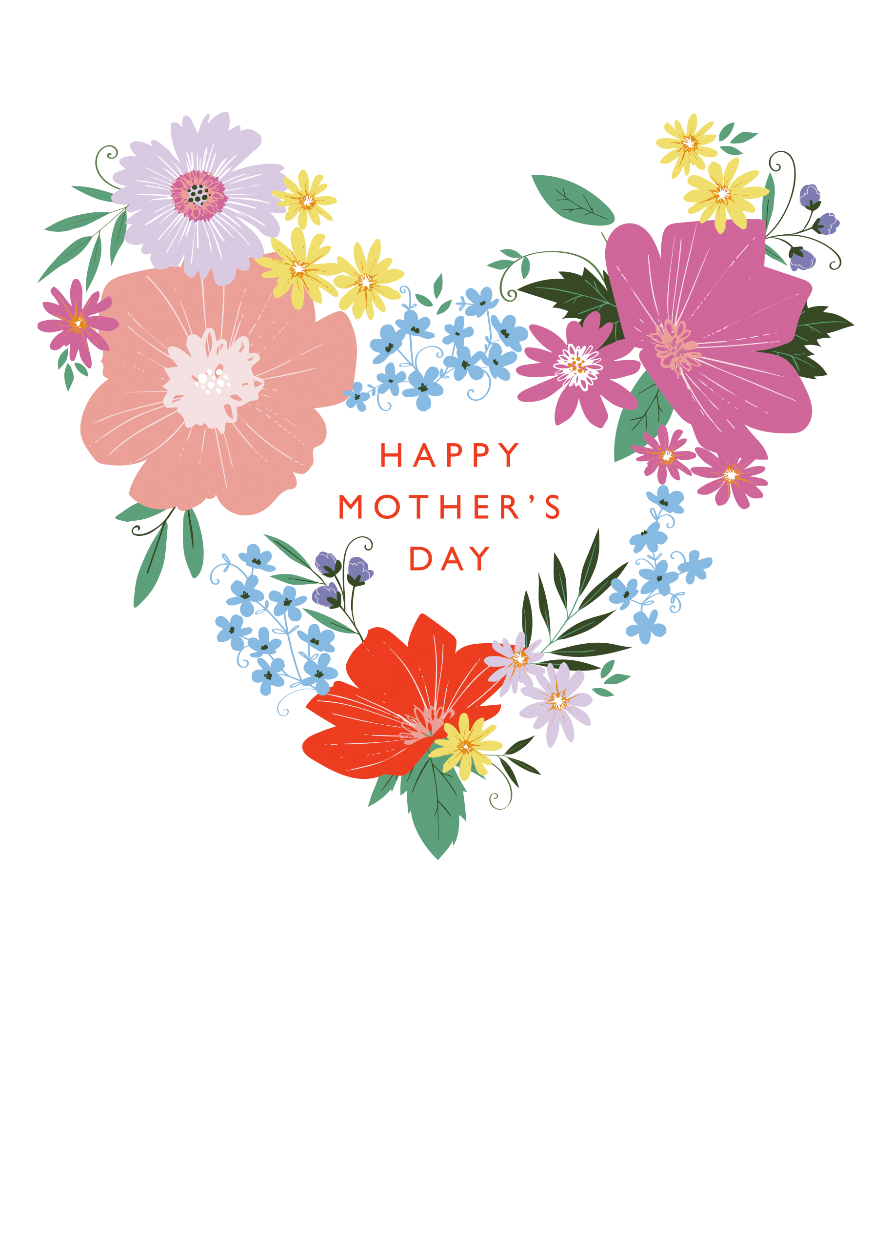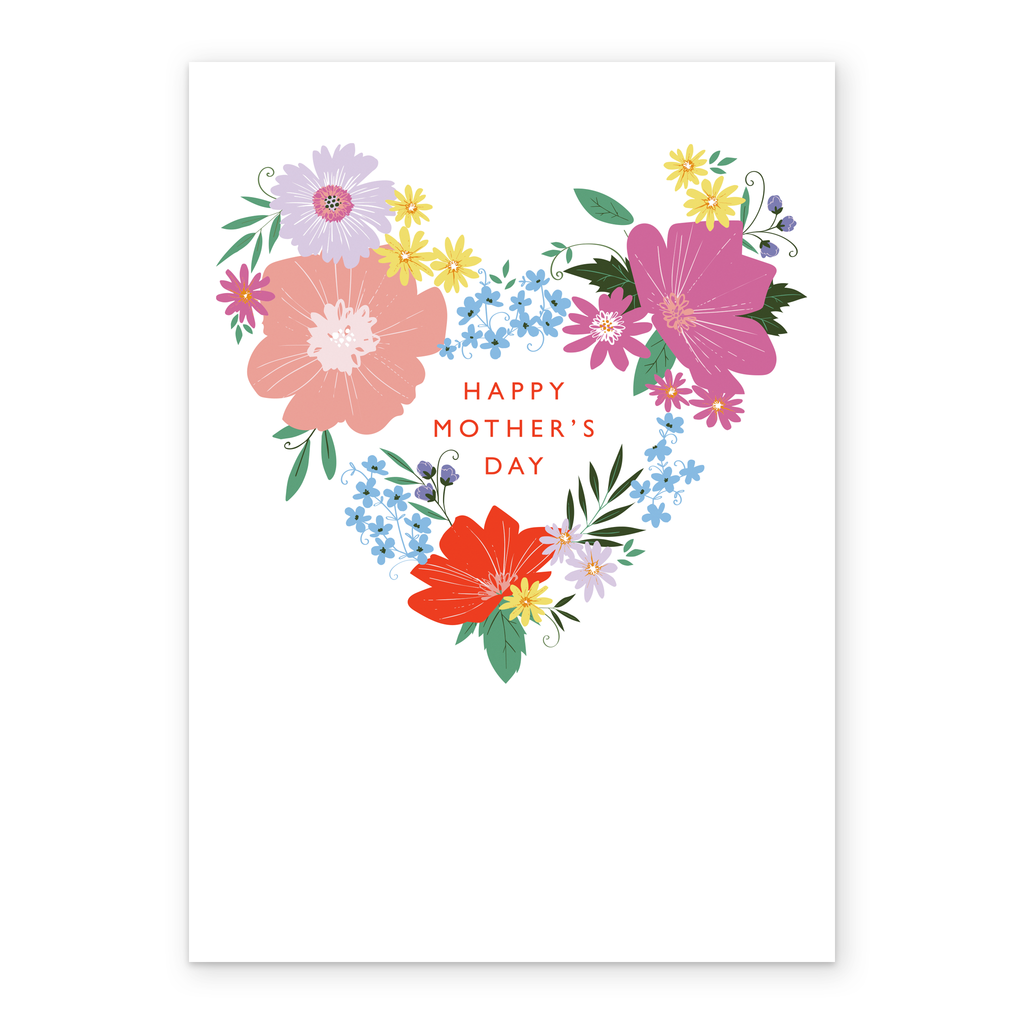 Printed on premium-quality board, this card features a love heart shaped floral wreath with brightly coloured flowers, on a white background, with the message 'Happy Mother's Day', and comes complete with a co-ordinating white envelope.