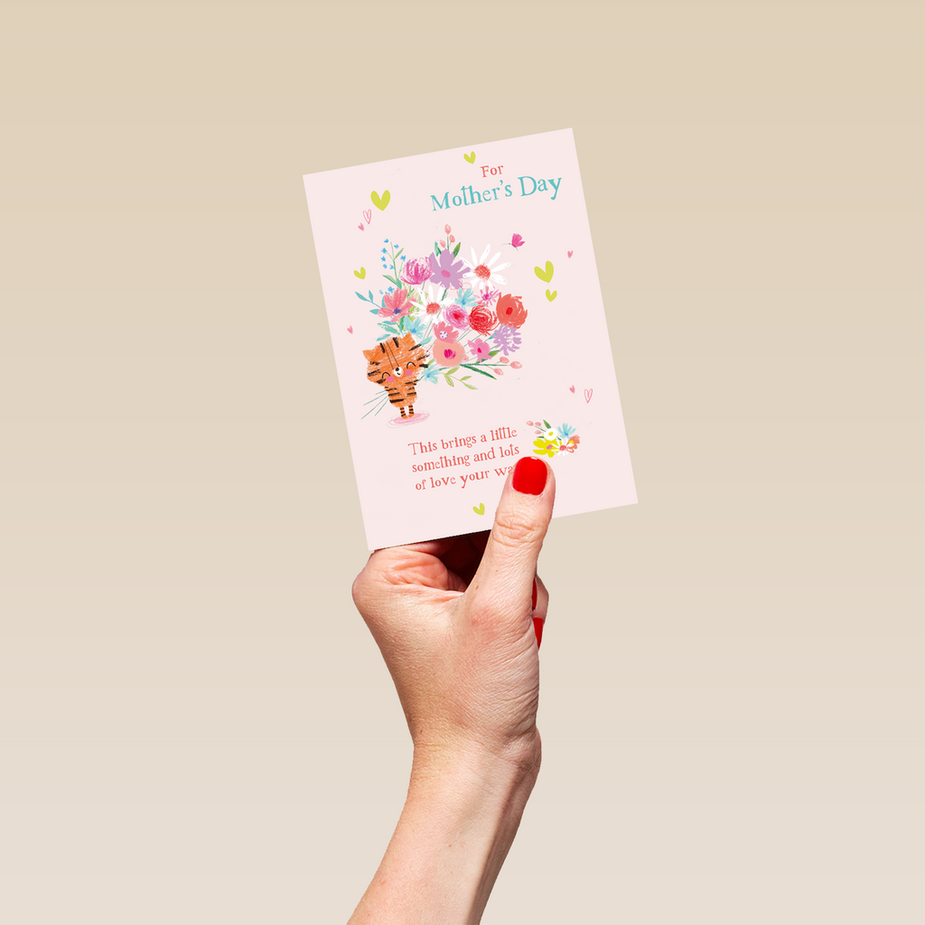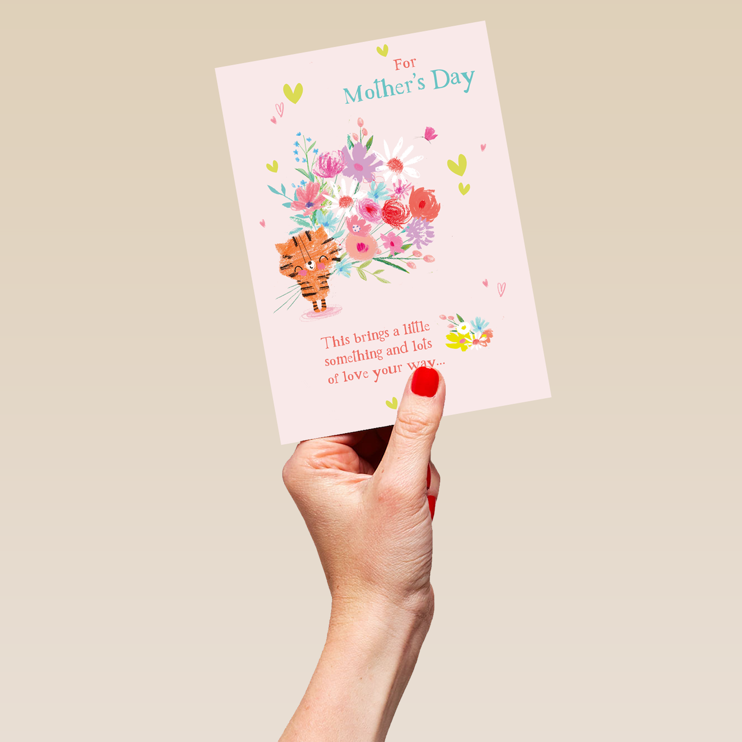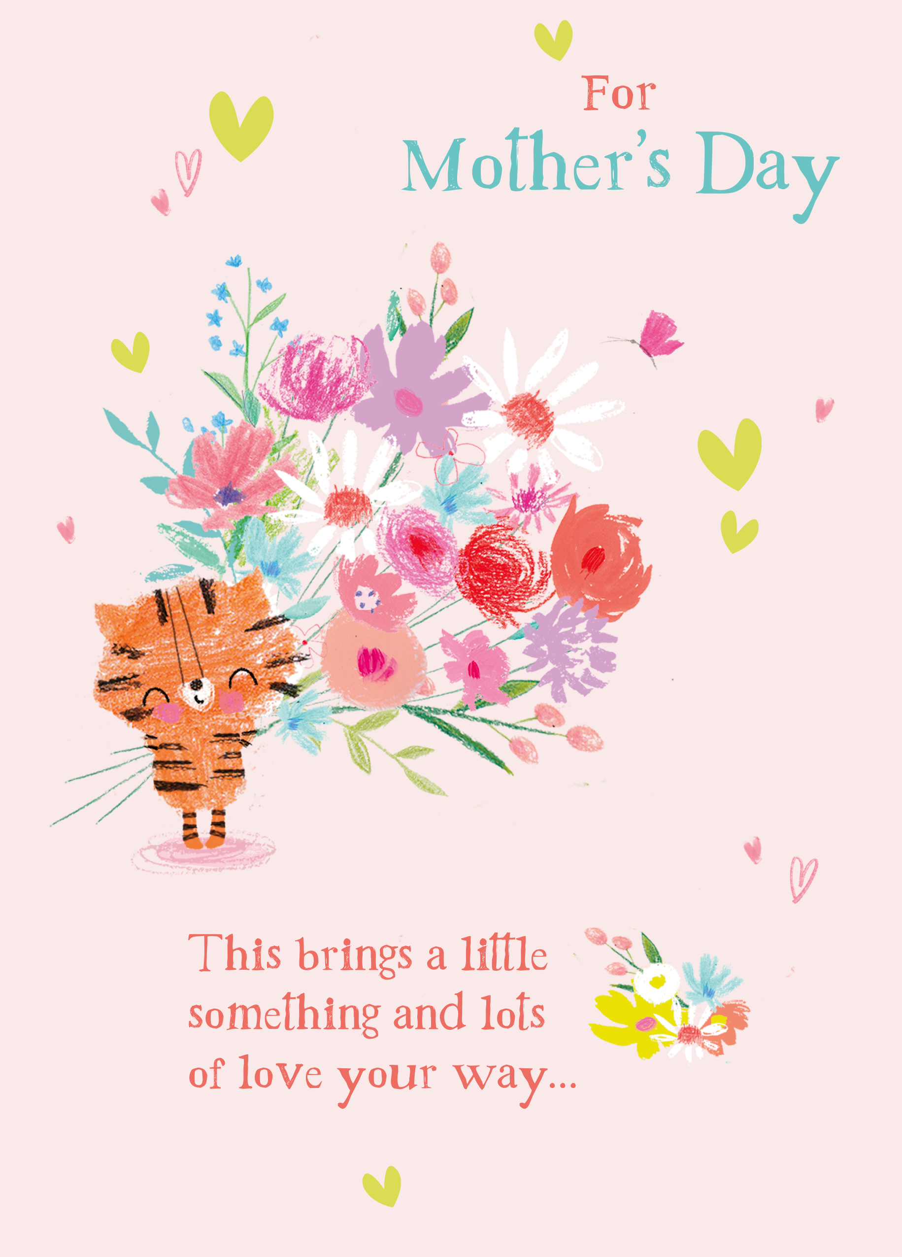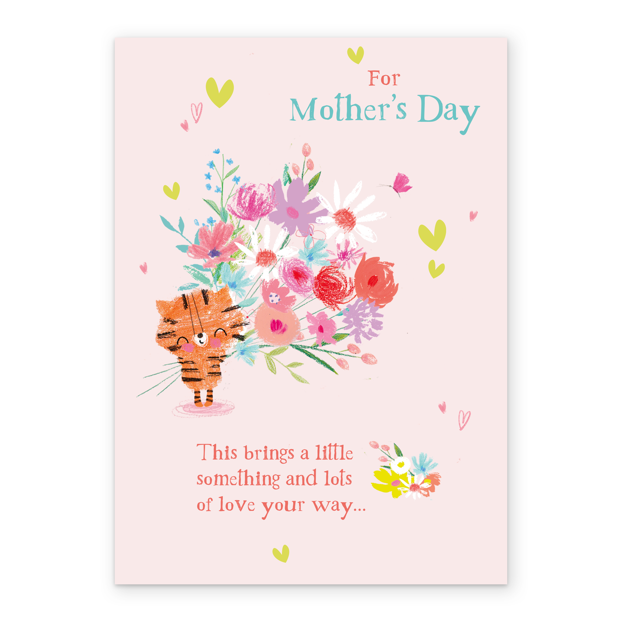 Printed on premium-quality board, this card features a cute illustrated tiger holding huge bouquet of flowers, on a light pink background adorned with hearts, with the message 'For Mother's Day. This brings a little something and lots of love your way…', and comes complete with a co-ordinating white envelope.