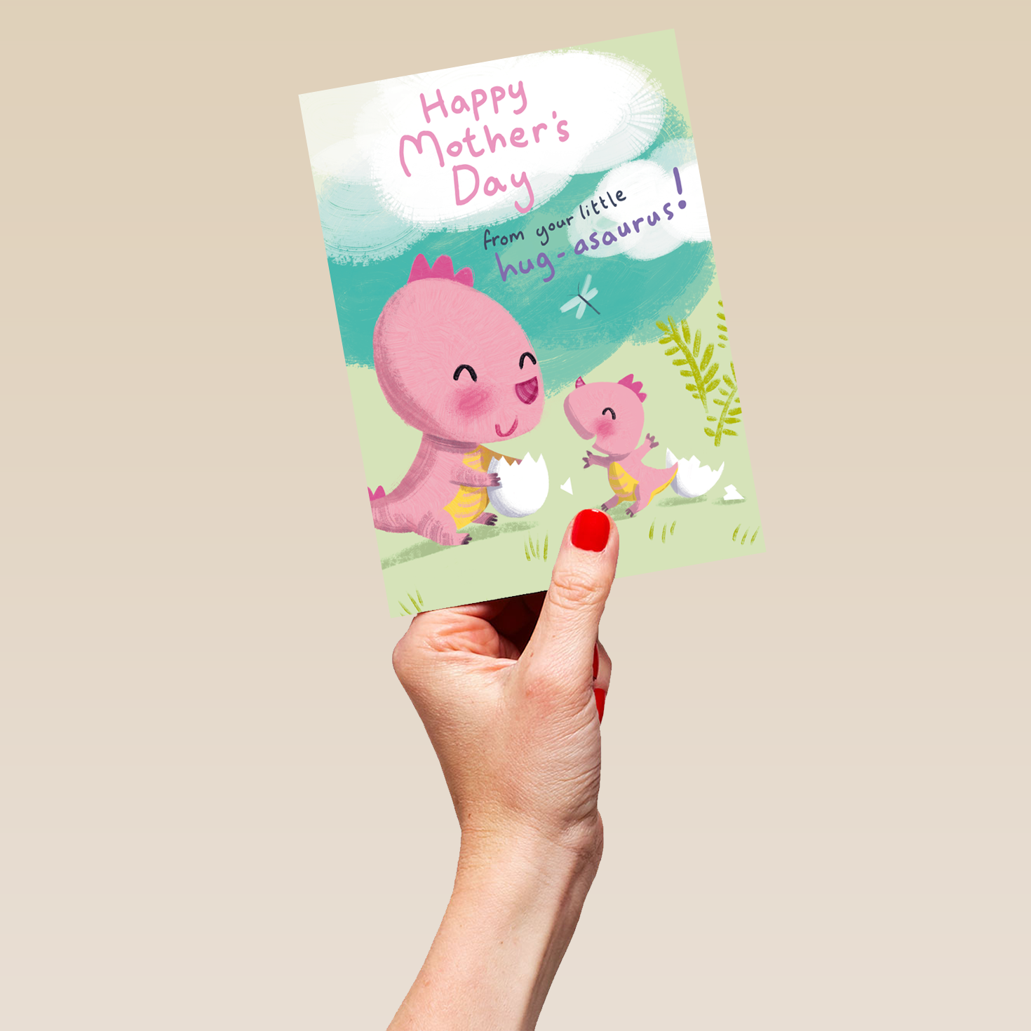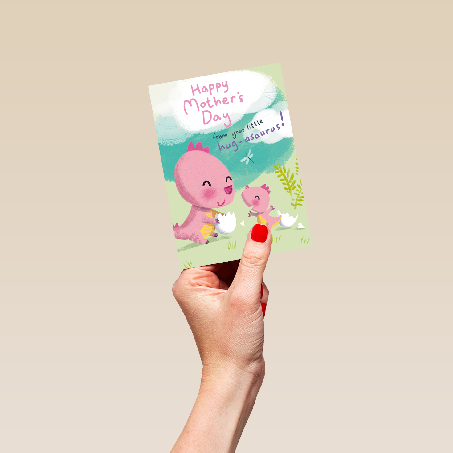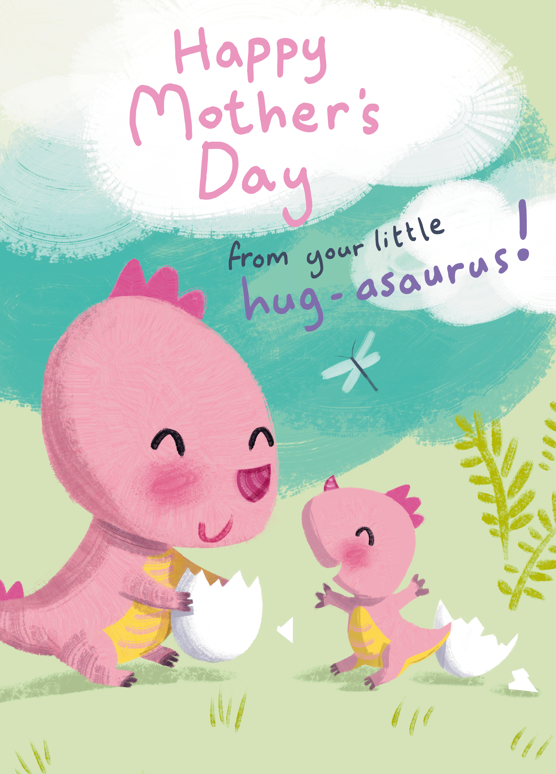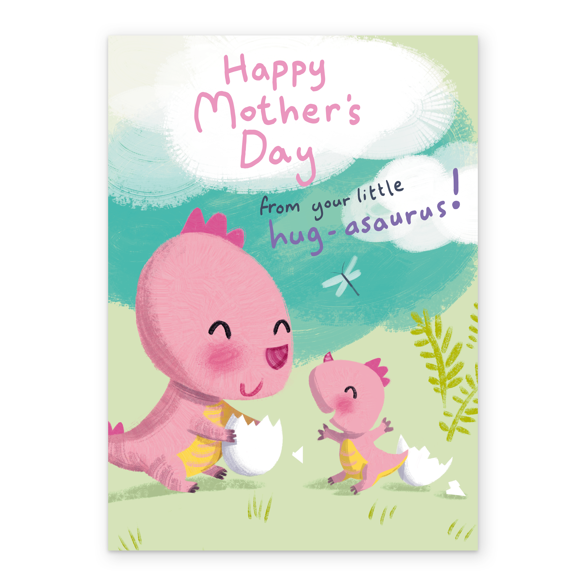 Printed on premium-quality board, this card features a cute illustrated momma dinosaur with her child, with the message 'Happy Mother's Day from your little hug-asaurus!', and comes complete with a co-ordinating white envelope.