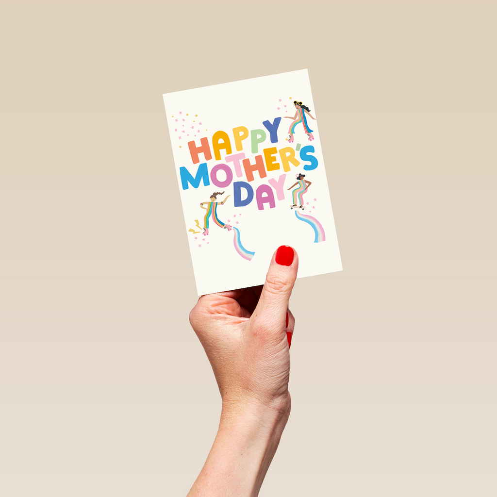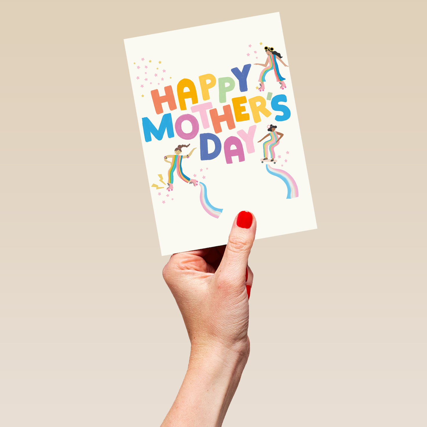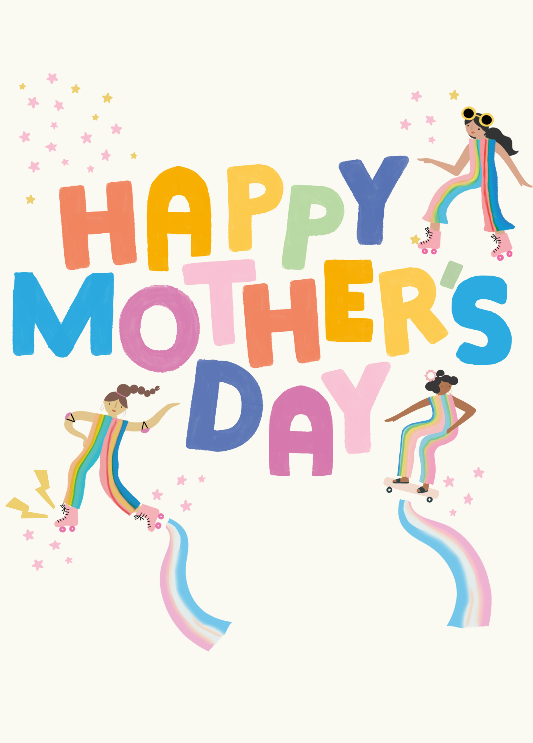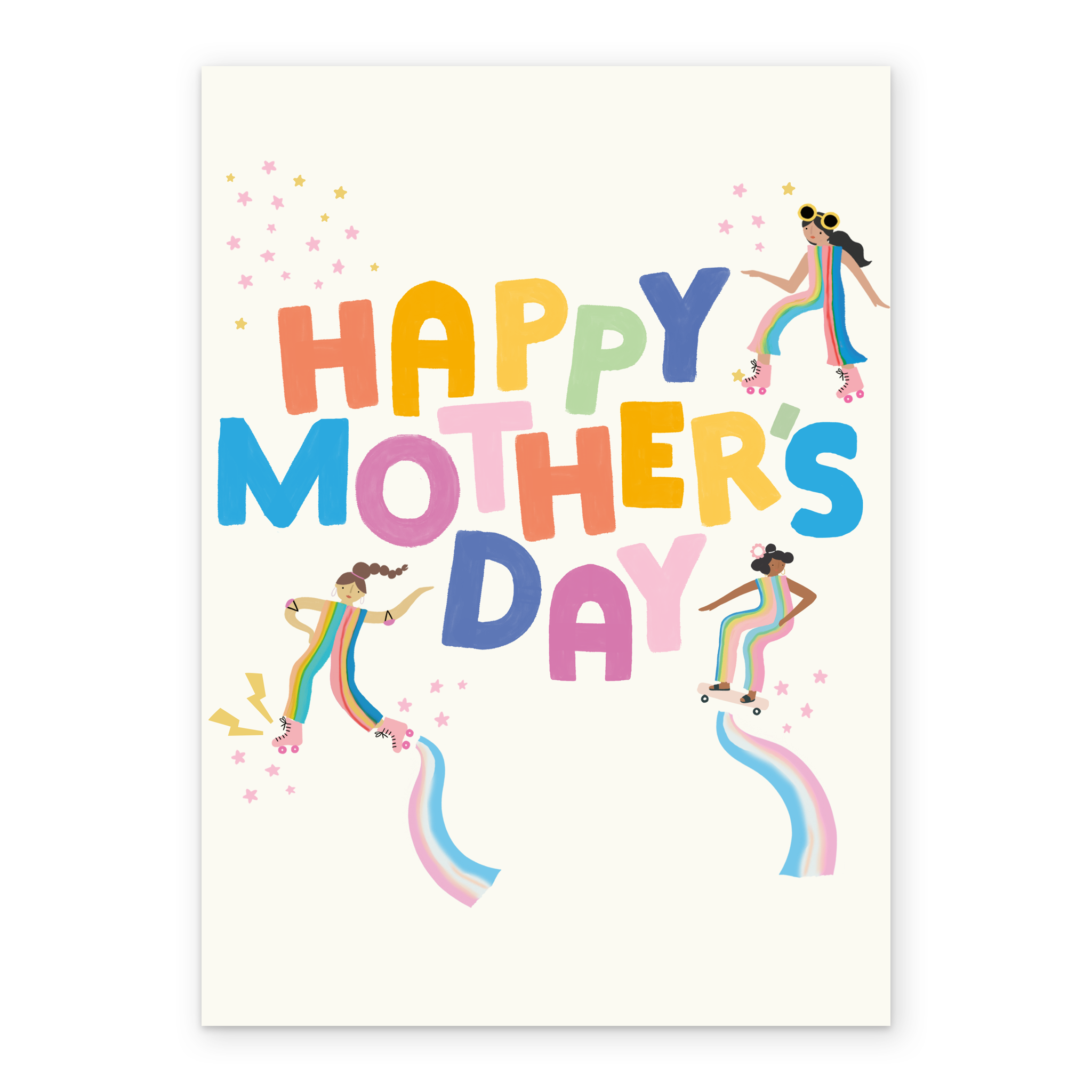 Printed on premium-quality board, this card features fun multicoloured text, illustrated roller-skating and skateboarding girls, stars and rainbows, with the message 'Happy Mother's Day', and comes complete with a co-ordinating white envelope.