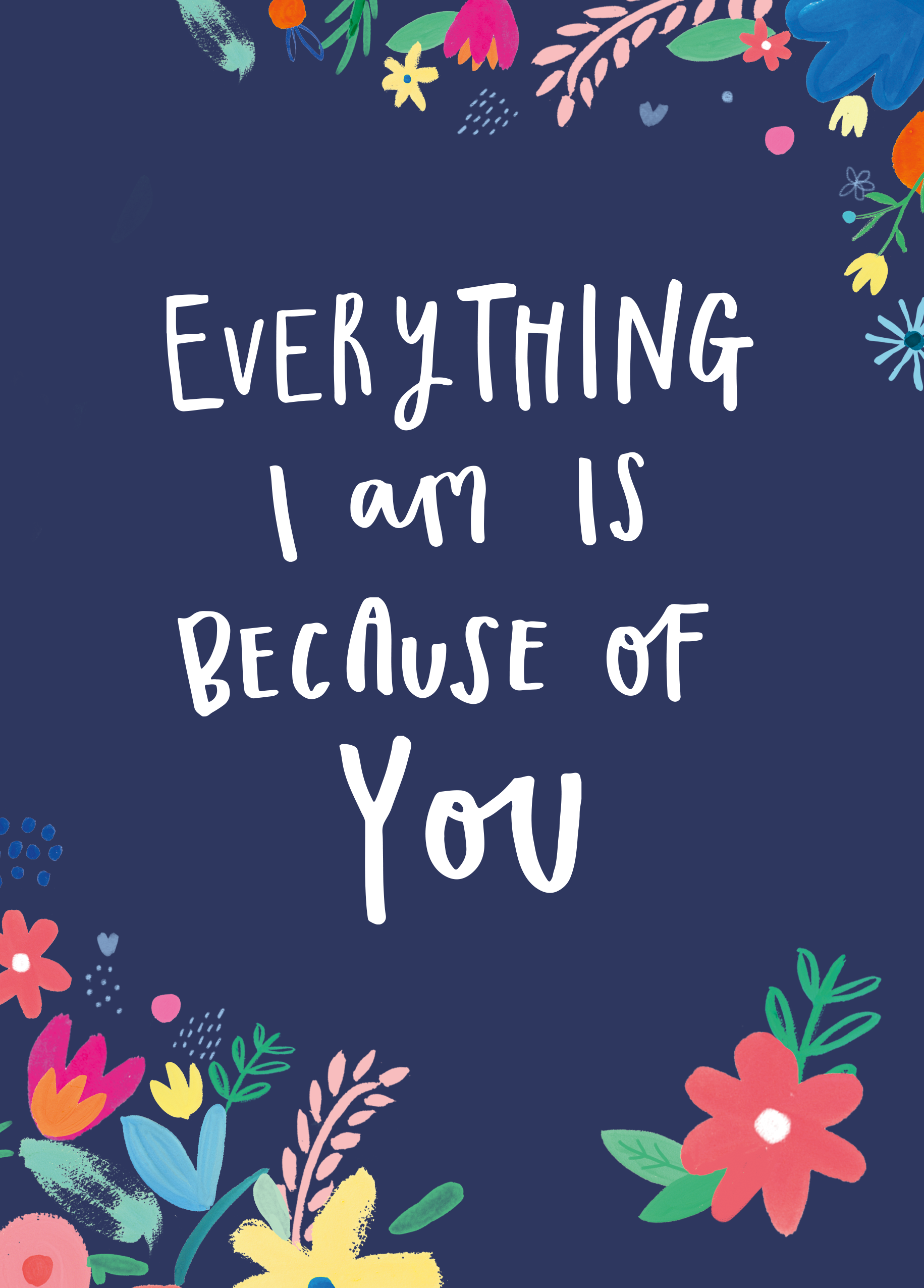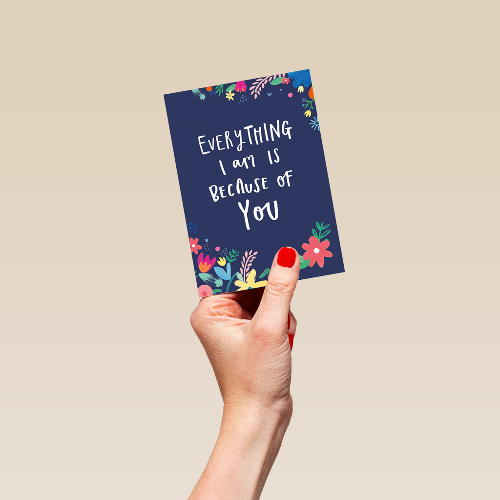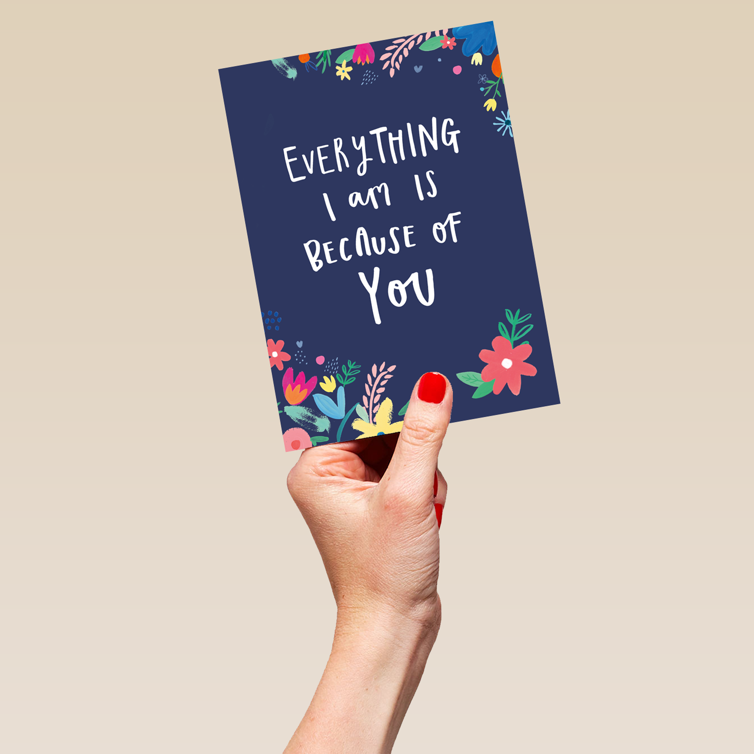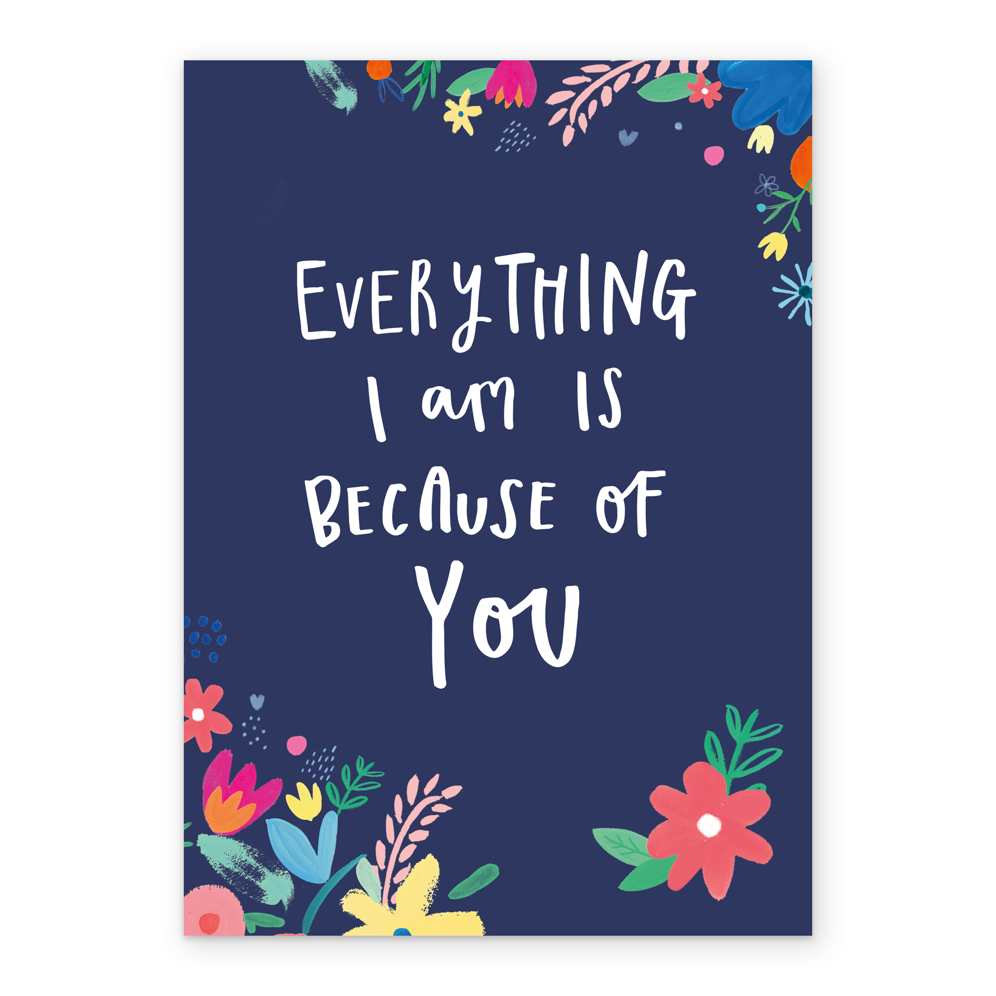 Printed on premium-quality board, this card features a contemporary text based design and floral borders on a dark blue background, with the message 'Everything I am is because of you', and comes complete with a co-ordinating white envelope.