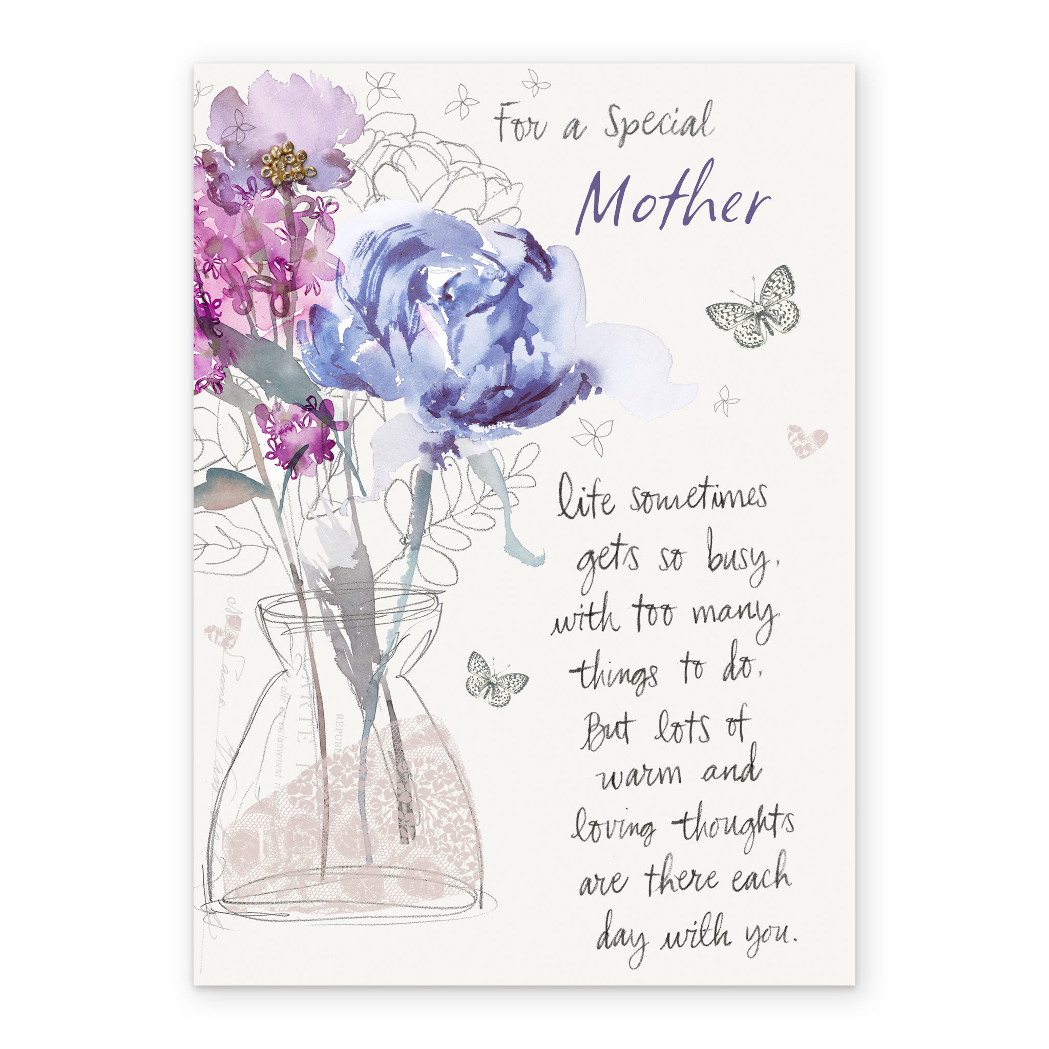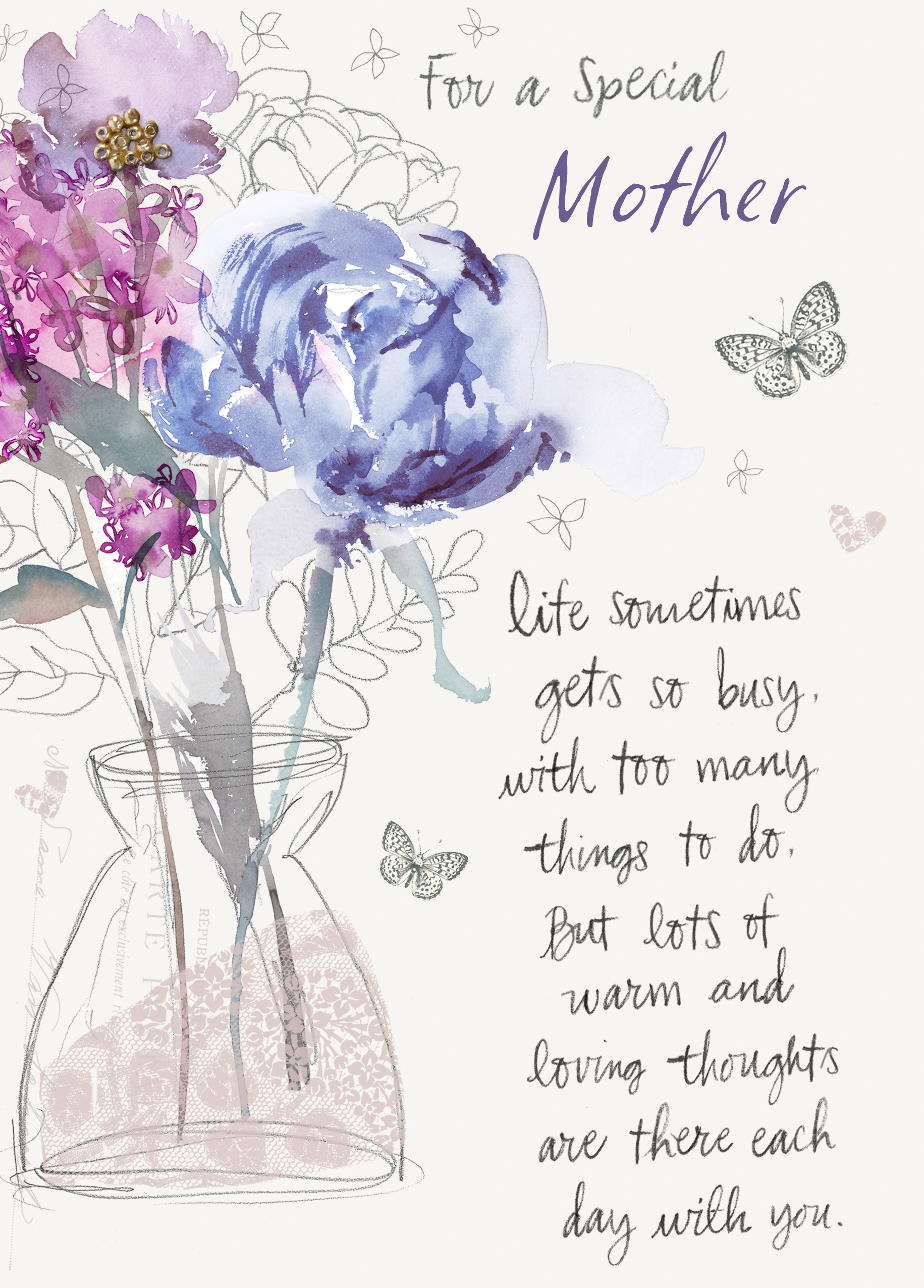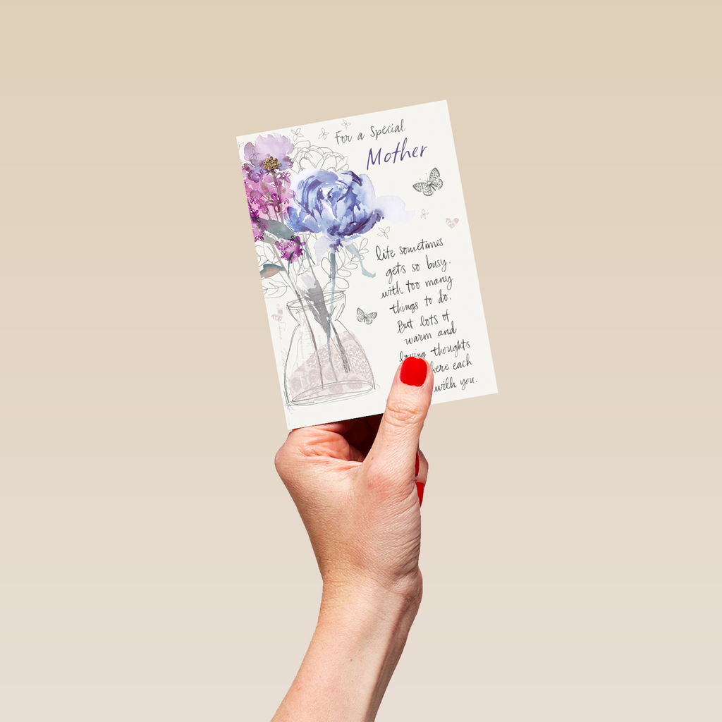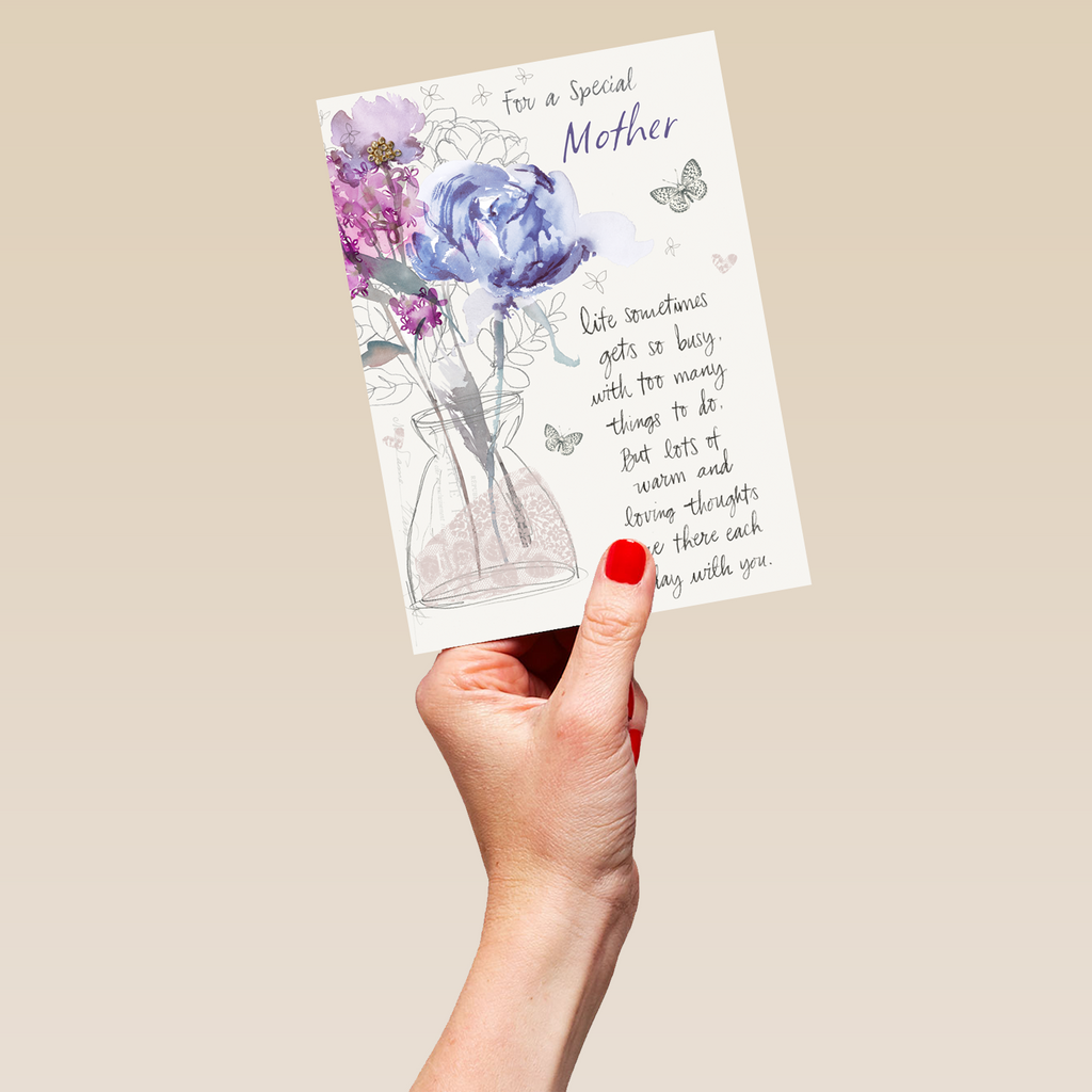 Printed on premium-quality board, this card features delicate watercolour flowers in a vase, illustrated butterflies and a sentimental verse, with the message 'For a special mother. Life sometimes gets so busy, with too many things to do, but lots of warm and loving thoughts are there each day with you.', and comes complete with a co-ordinating white envelope.