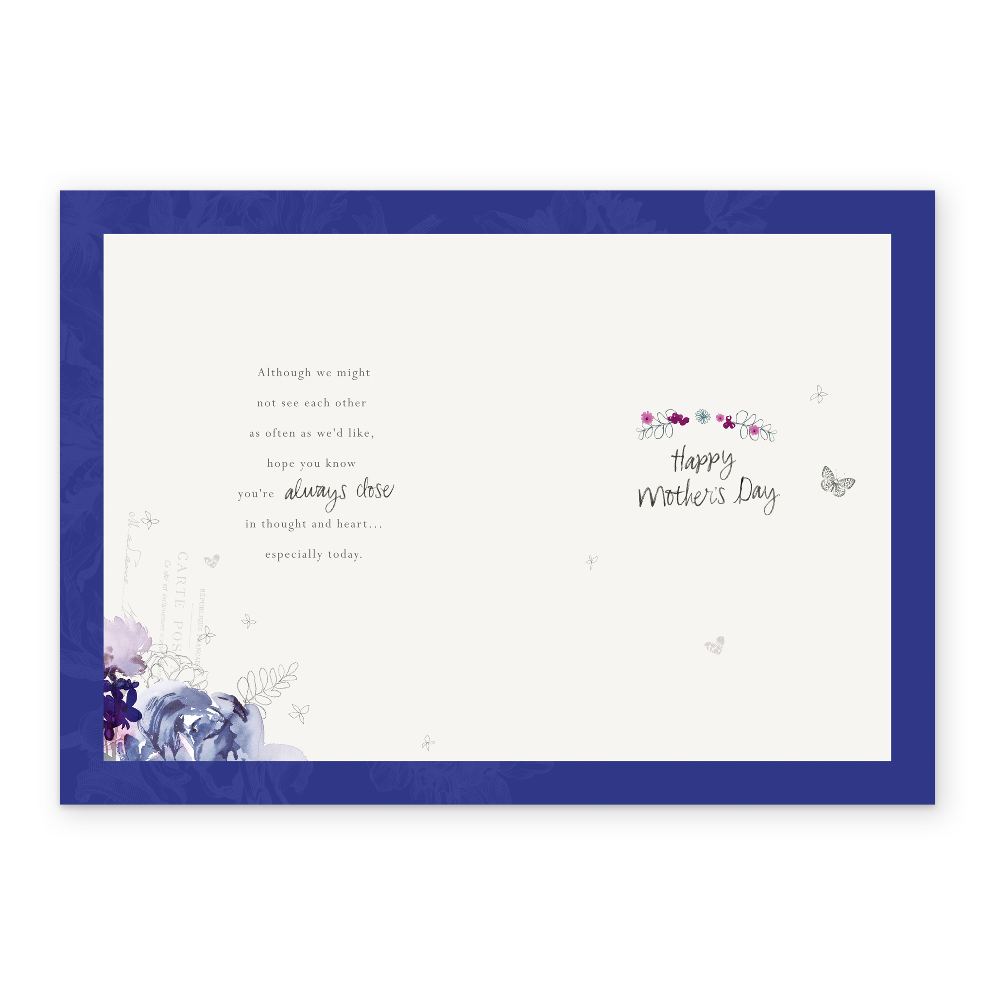 Message inside reads: Although we might not see each other as often as we'd like, hope you know you're always close in thought and heart… especially today. Happy Mother's Day