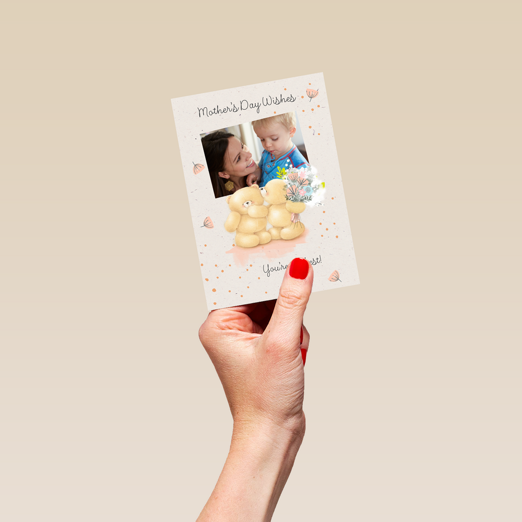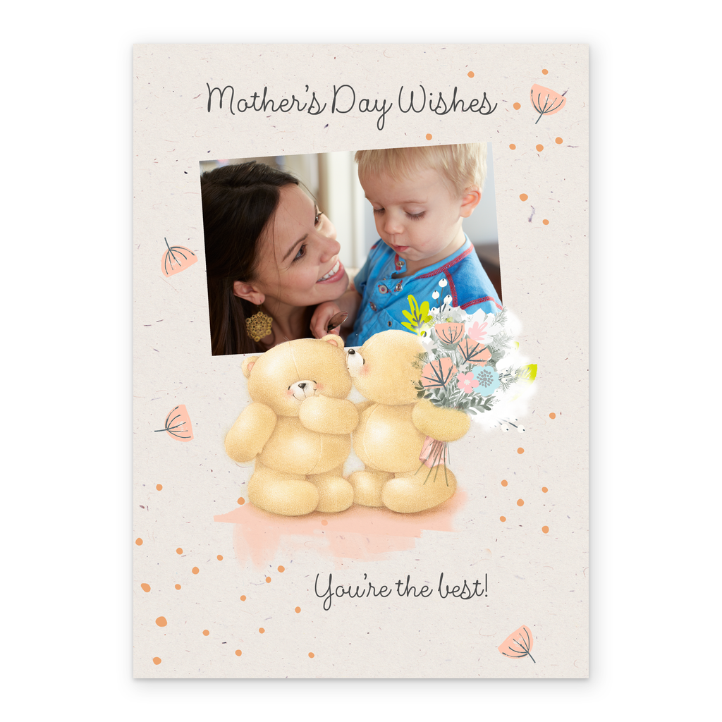 Printed on premium-quality board, this card features a cute illustration of the Forever Friends bears holding flowers, space to upload a photo and personalise your message, and comes complete with a co-ordinating white envelope.