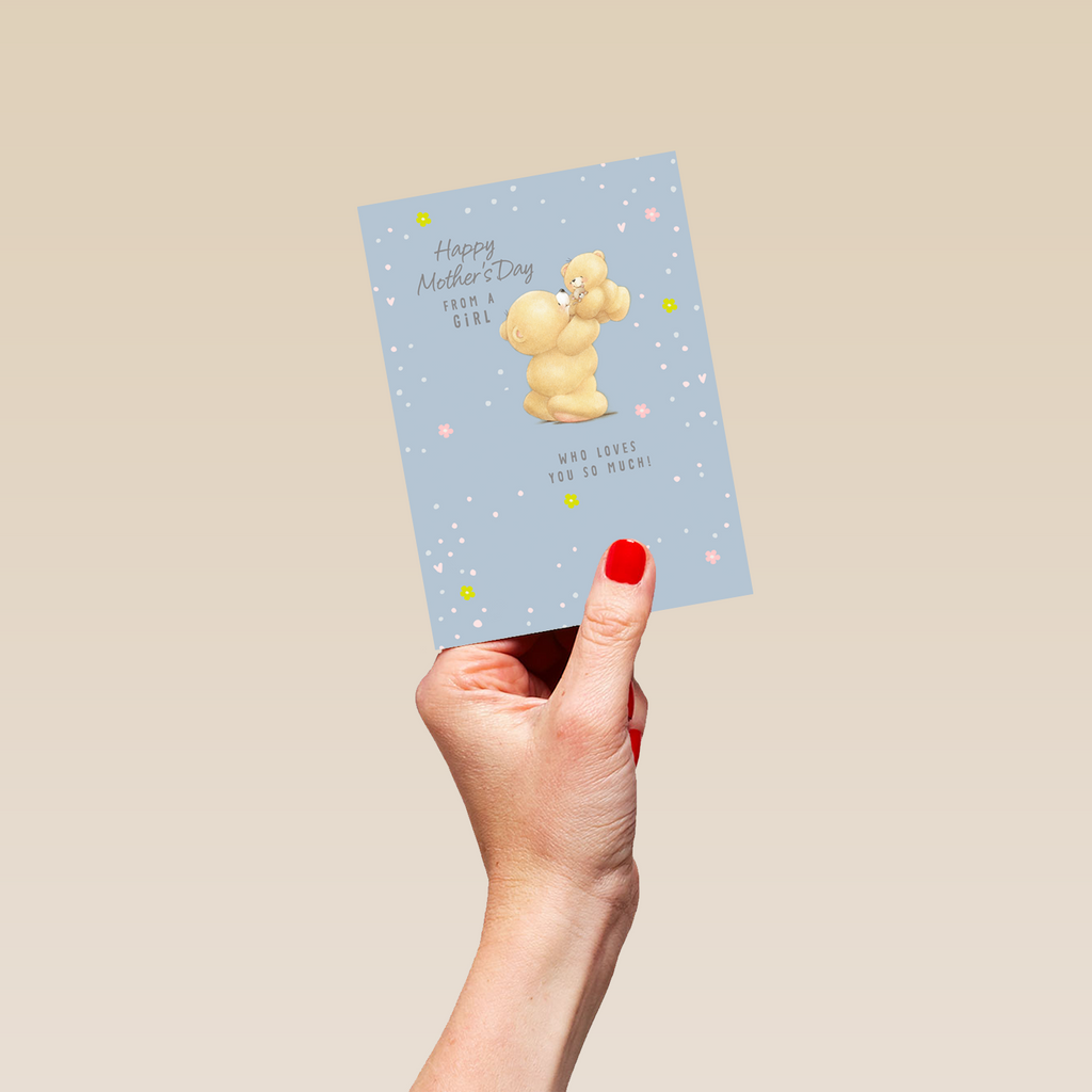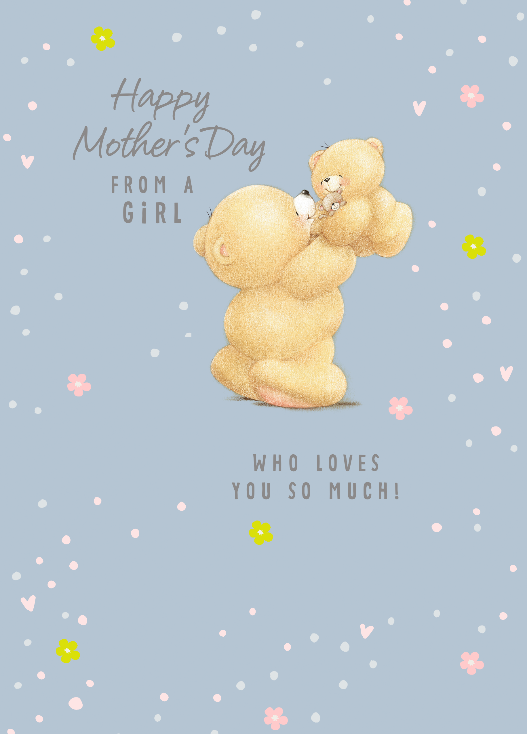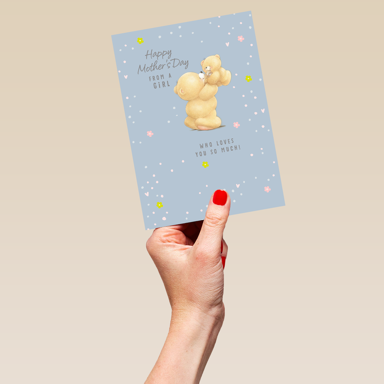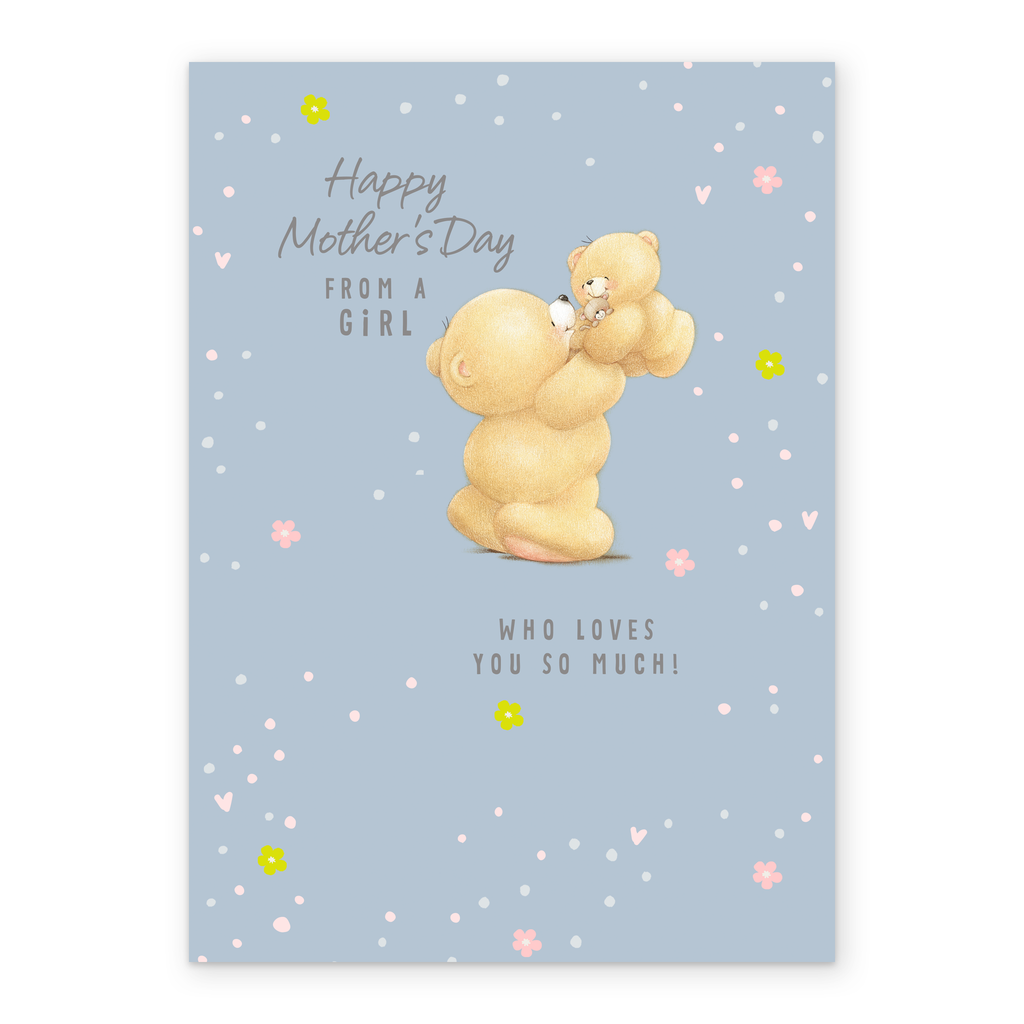 Printed on premium-quality board, this card features a cute Forever Friends bear raising her little girl into the air for a big hug, on a light blue background embellished with white hearts and colourful flowers, with the message 'Happy Mother's Day from a girl who loves you so much!', and comes complete with a co-ordinating white envelope.