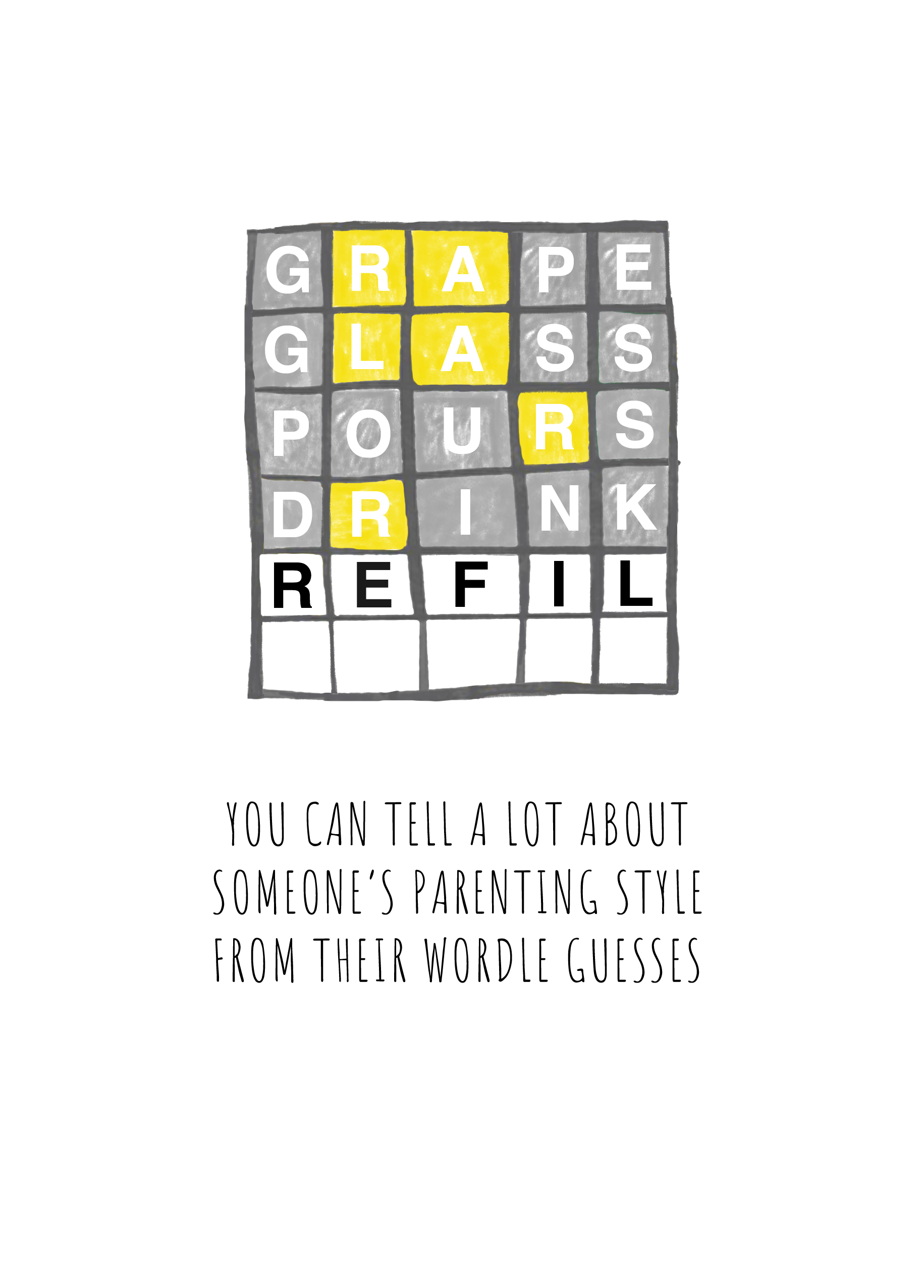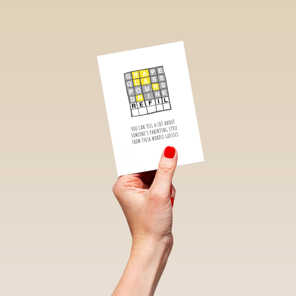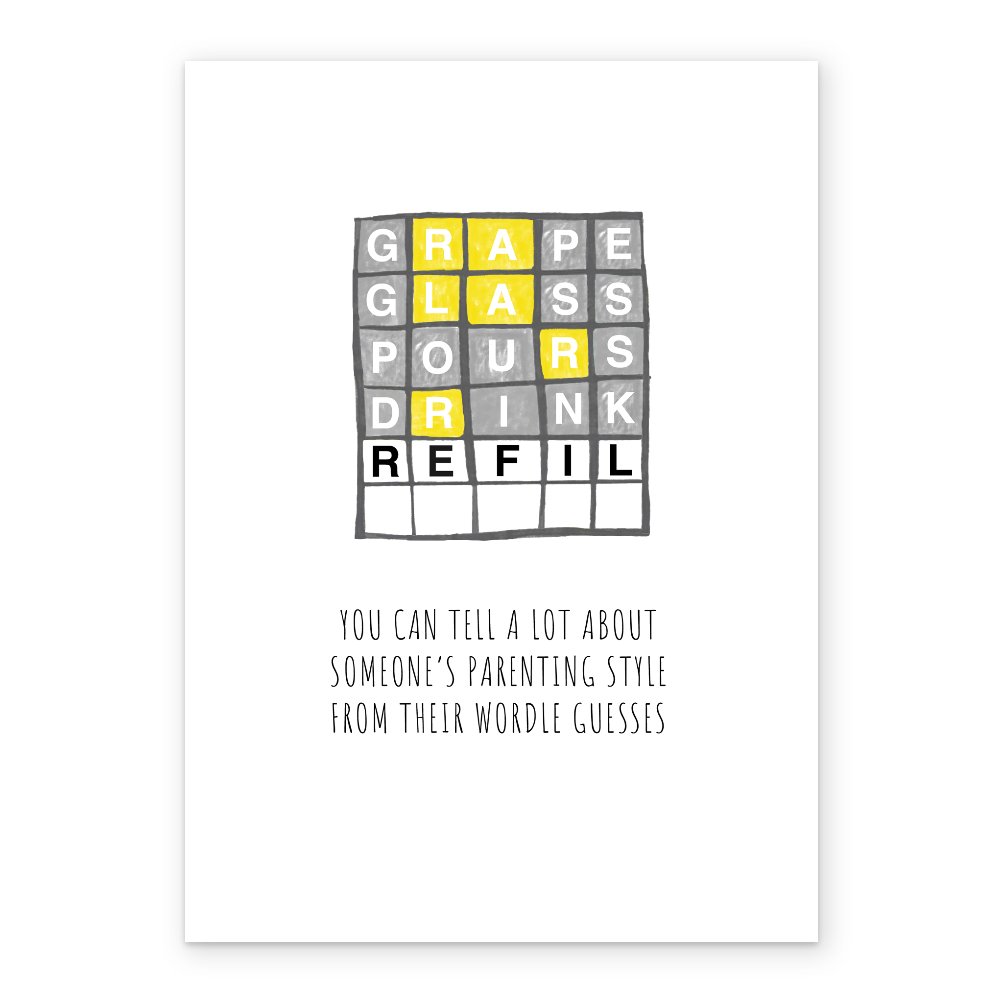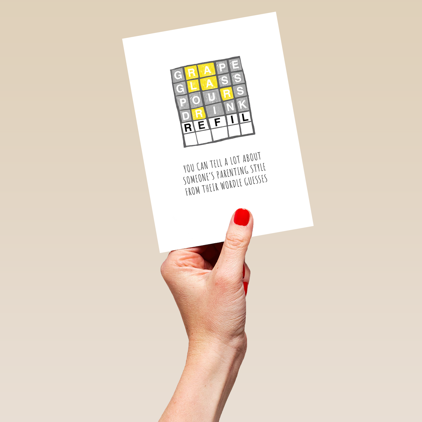 Printed on premium-quality board, this card features a funny text based design and Wordle grid, with the message 'You can tell a lot about someone's parenting style from their Wordle guesses', and comes complete with a co-ordinating white envelope.