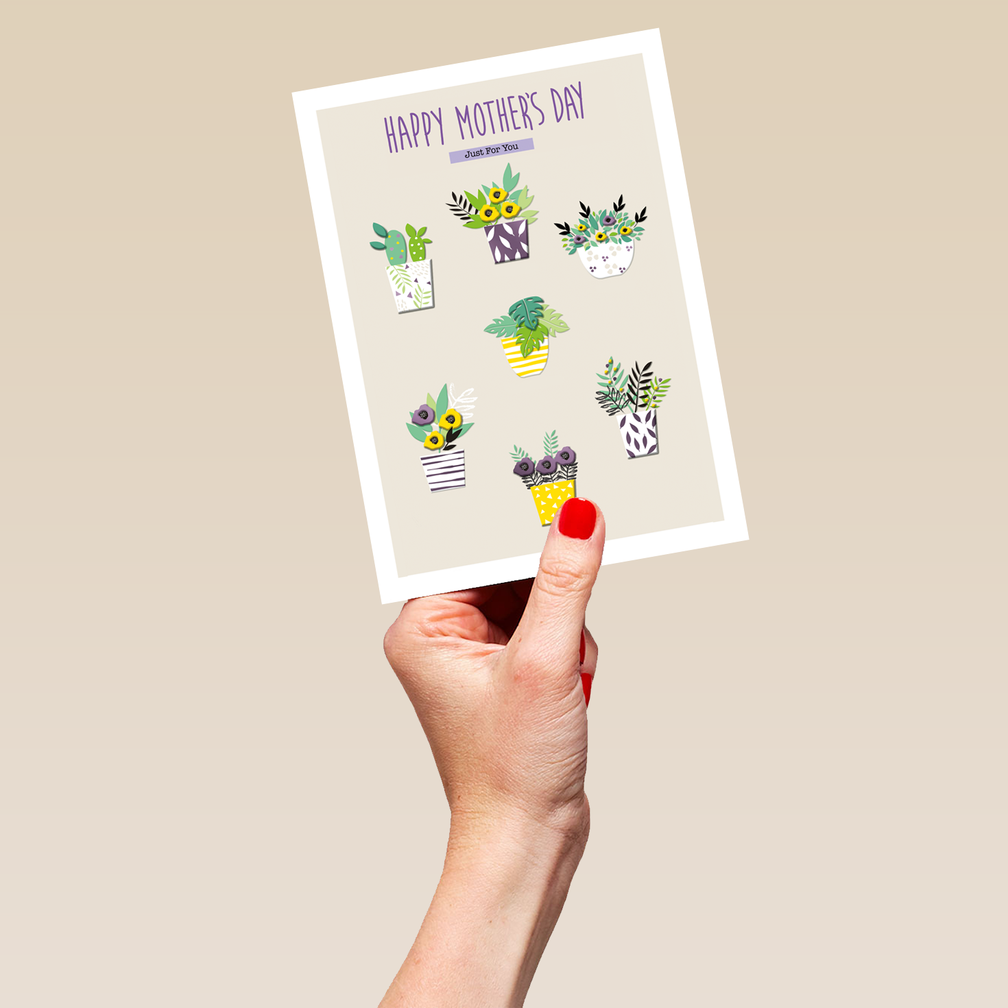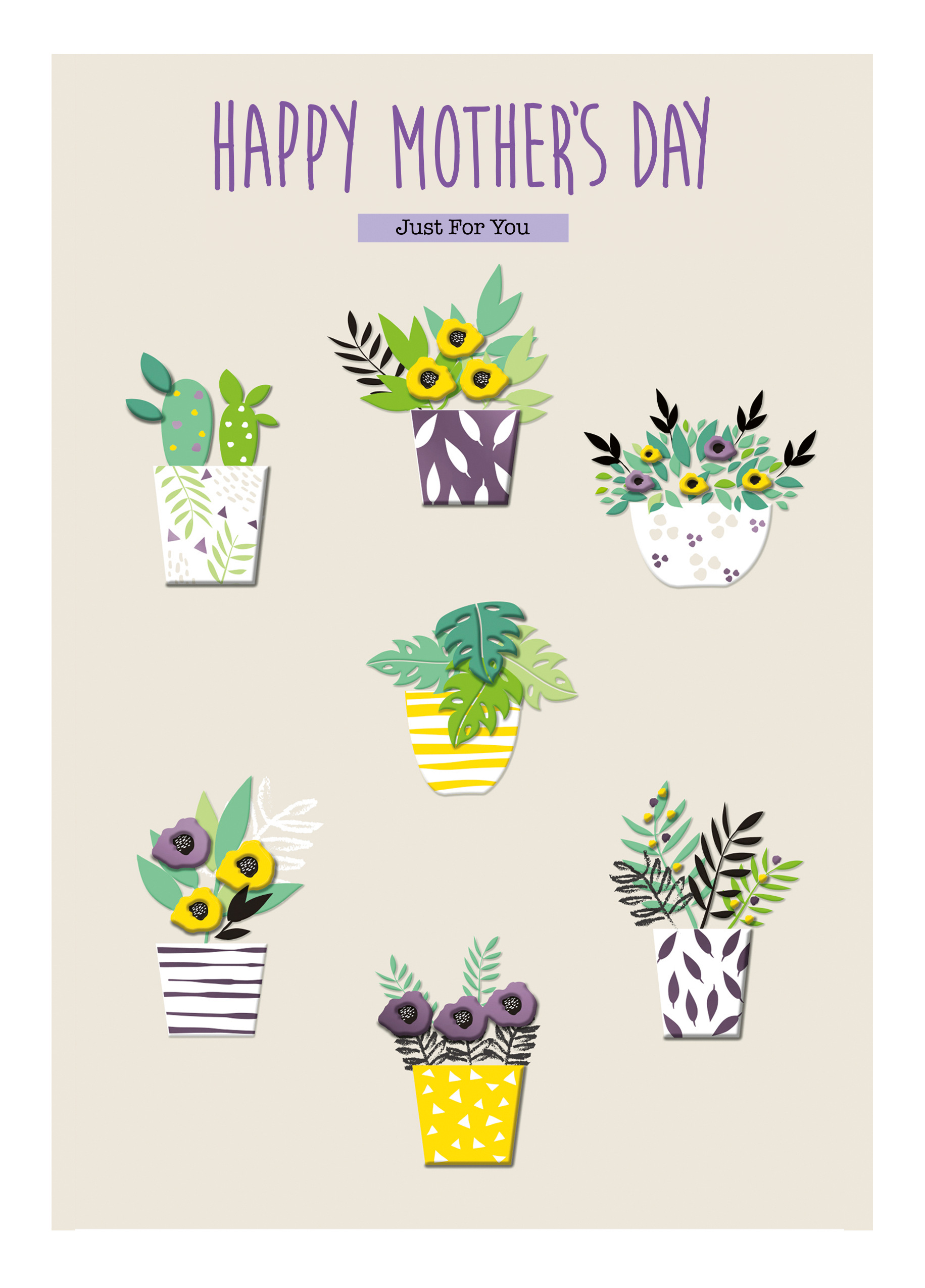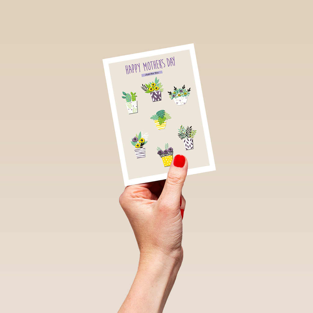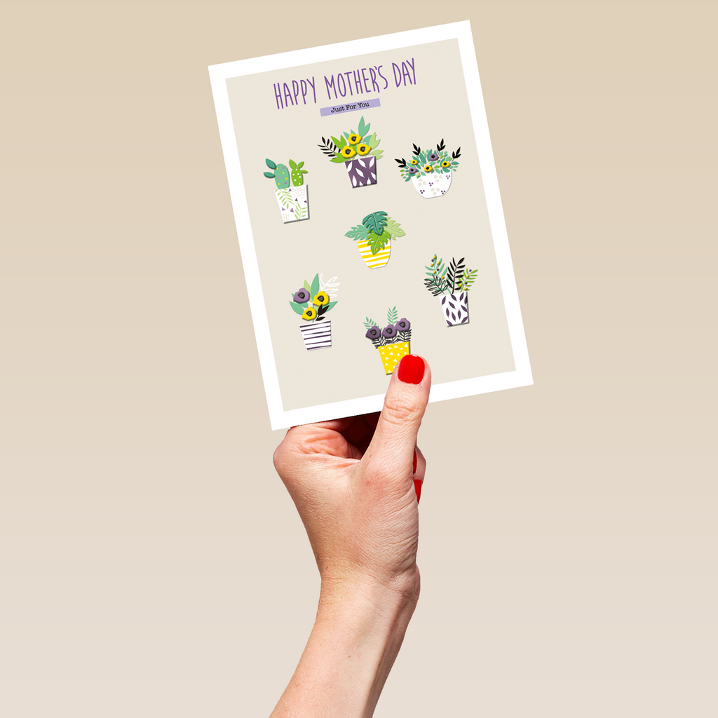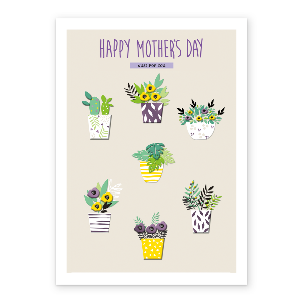 Printed on premium-quality board, this card features 7 houseplants with colourful flowers and decorative pots, perfect for any green-fingered mum, on a cream background, with the message 'Happy Mother's Day Just For You', and comes complete with a co-ordinating white envelope.