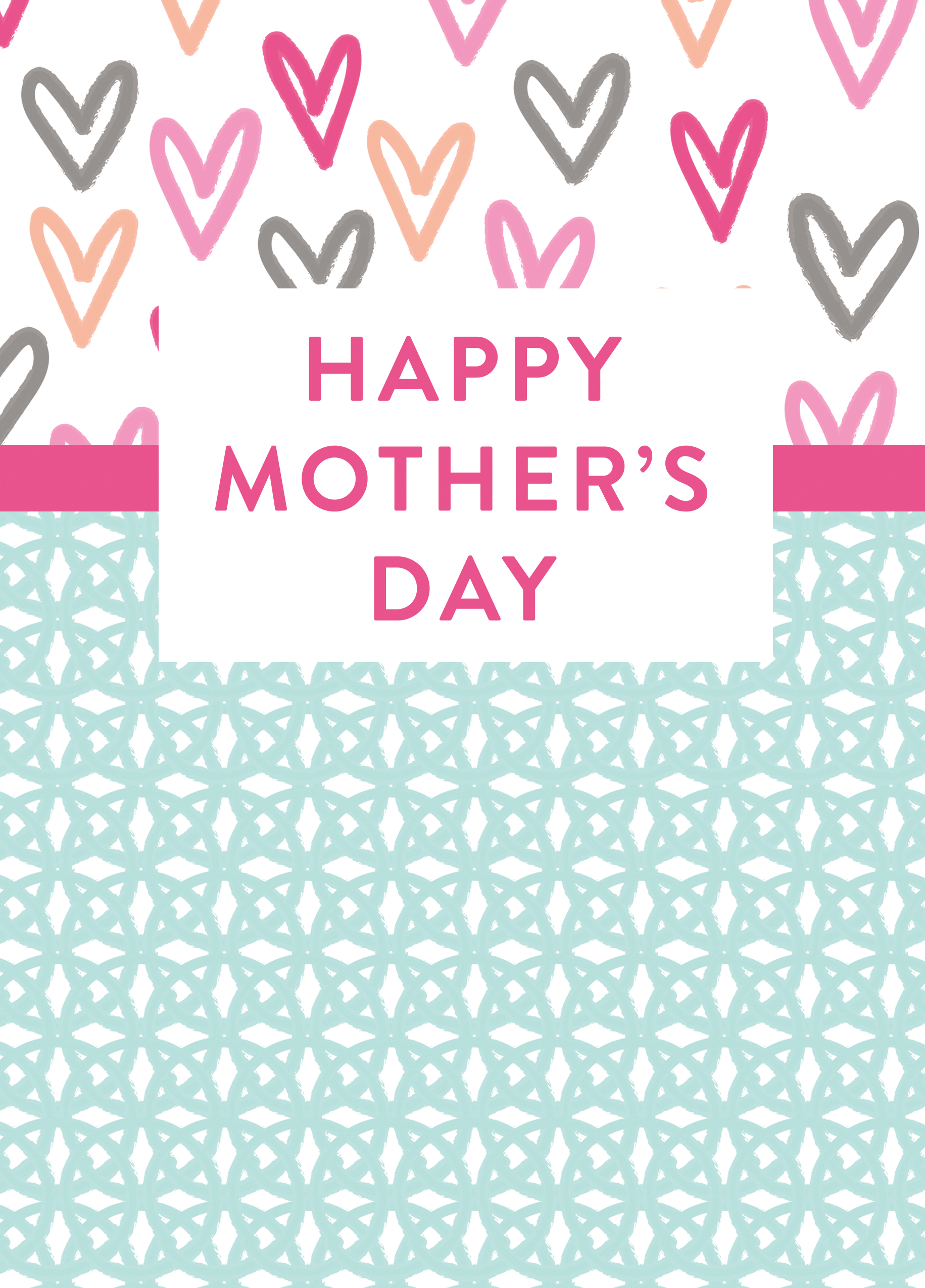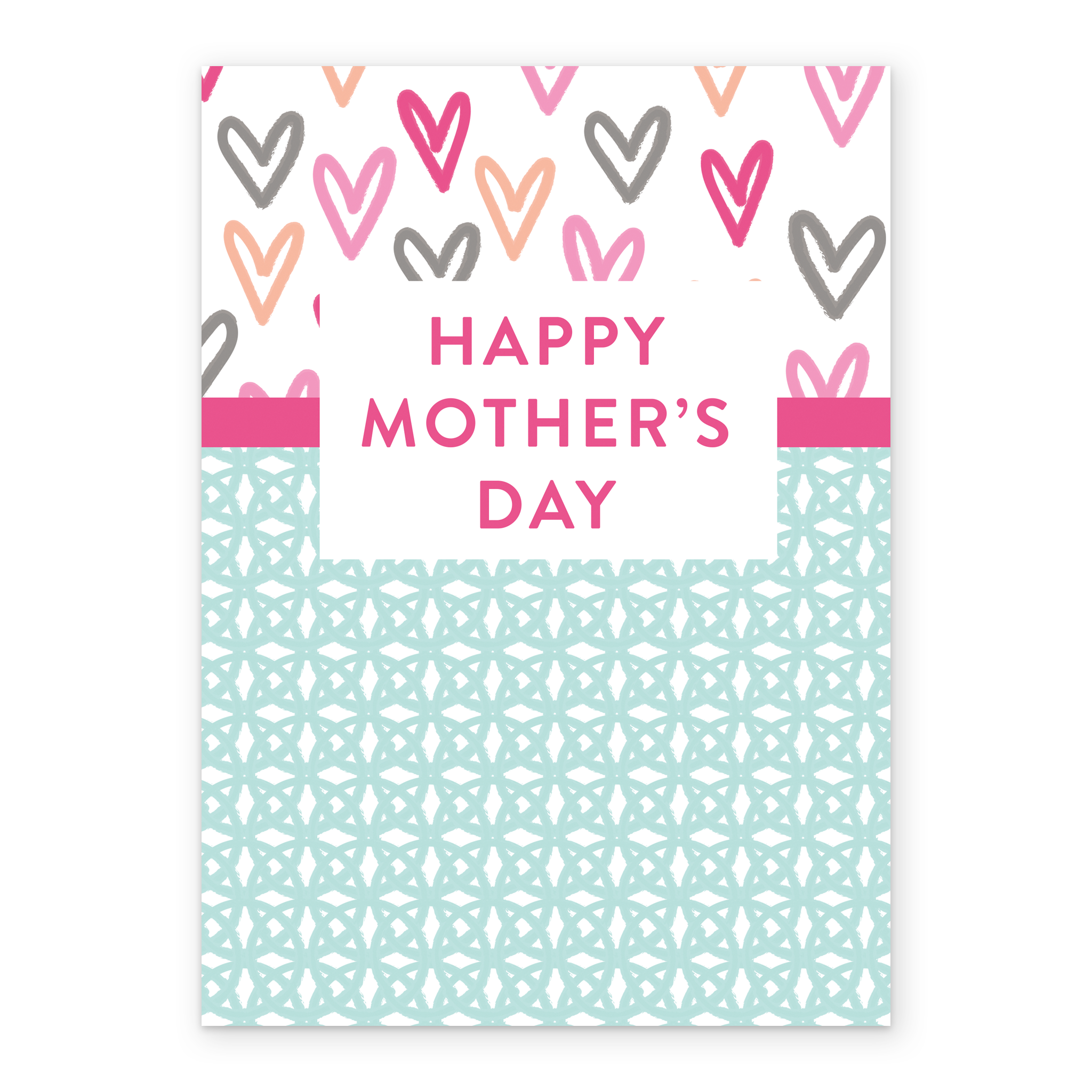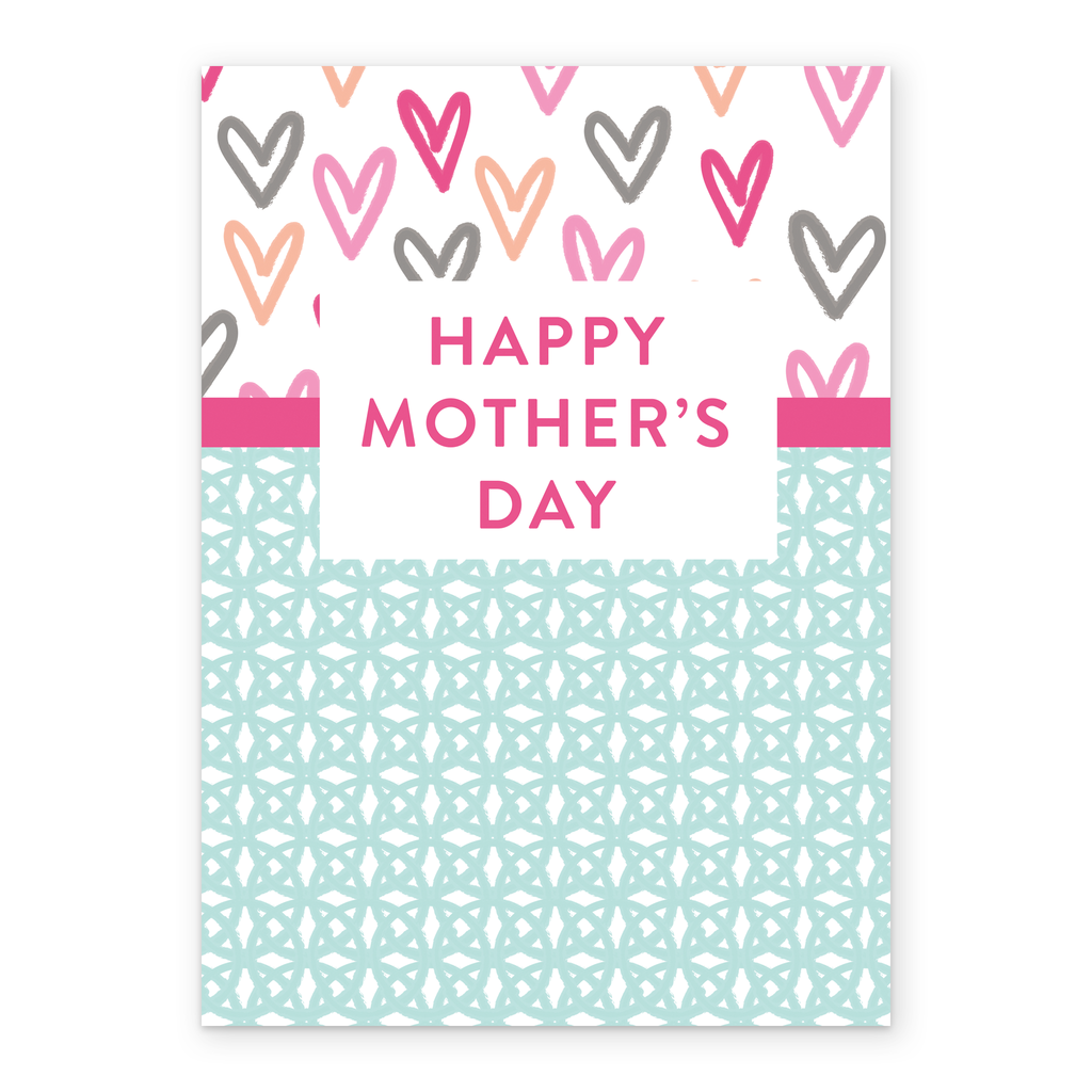 Printed on premium-quality board, this card features a contemporary multicoloured hearts and lattice design, with the message 'Happy Mother's Day', and comes complete with a co-ordinating white envelope.