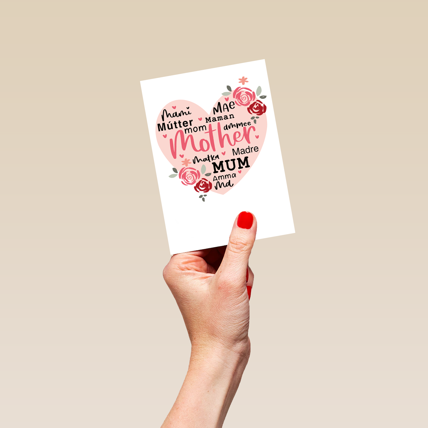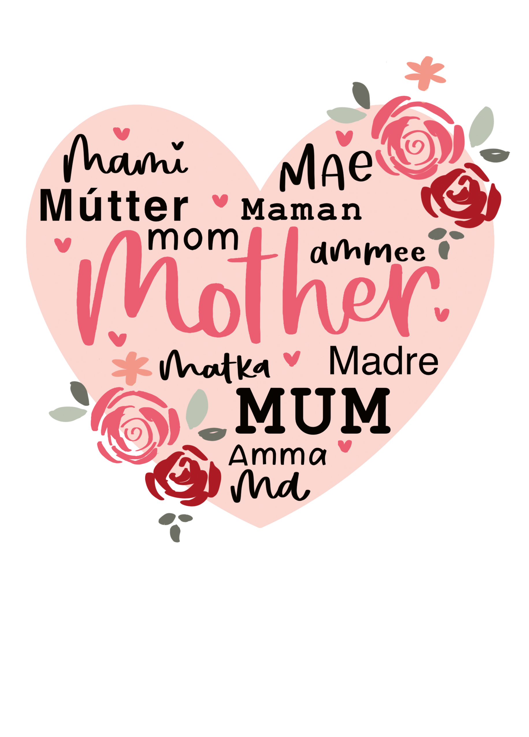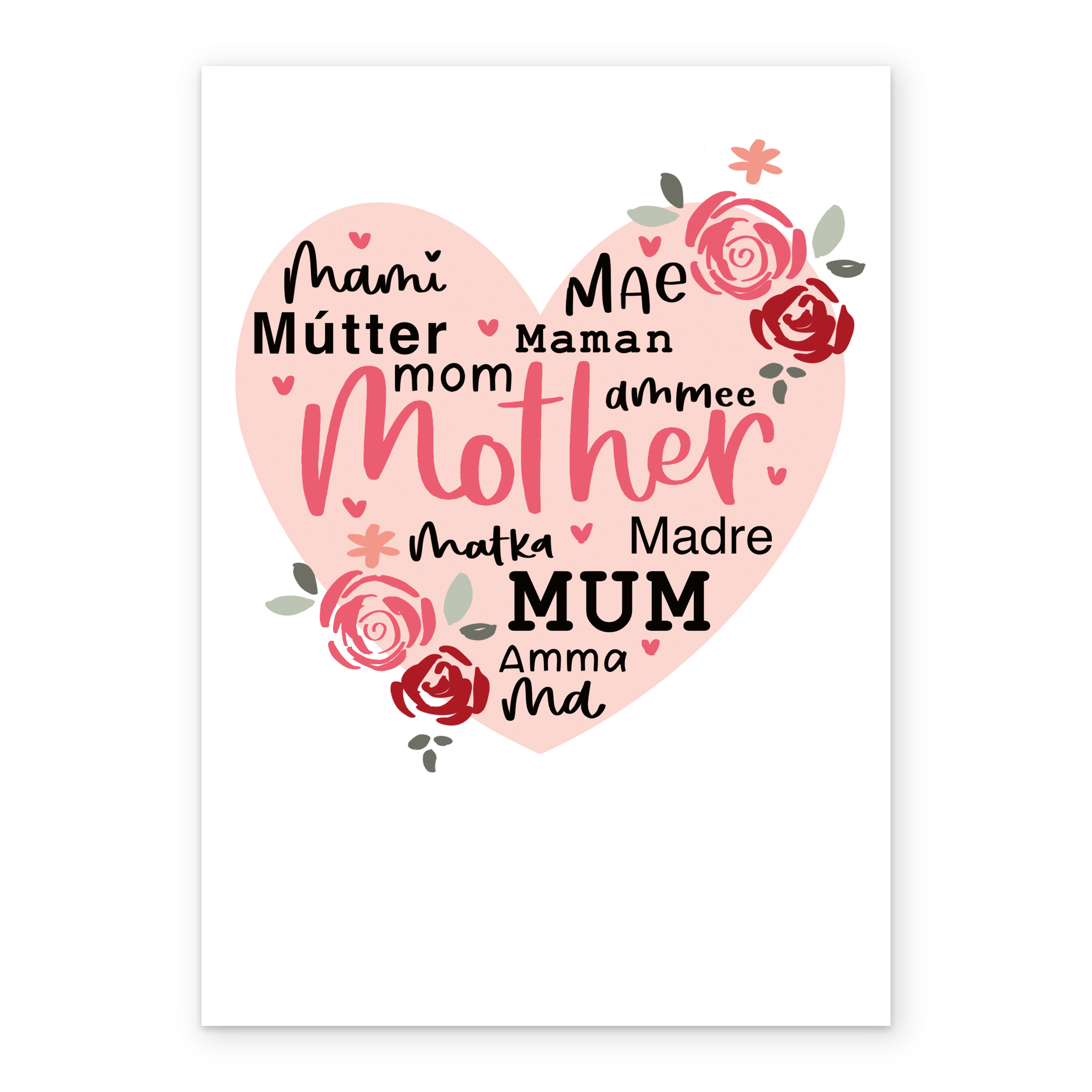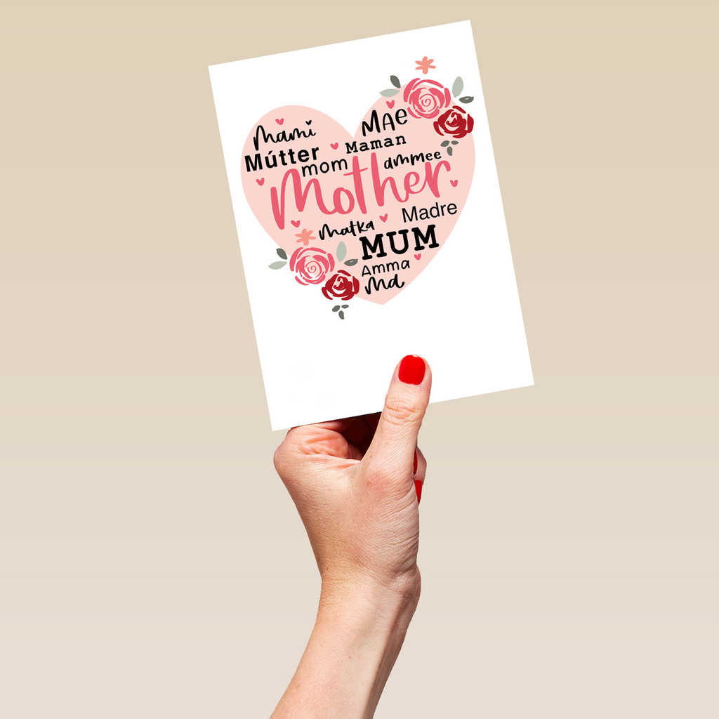 Printed on premium-quality board, this card features a large pink heart decorated with roses and ways to say mother in languages from around the world, on a white background, with the message 'mami mae mútter mana mom ammee mother matka madre mum amma ma', and comes complete with a co-ordinating white envelope.
