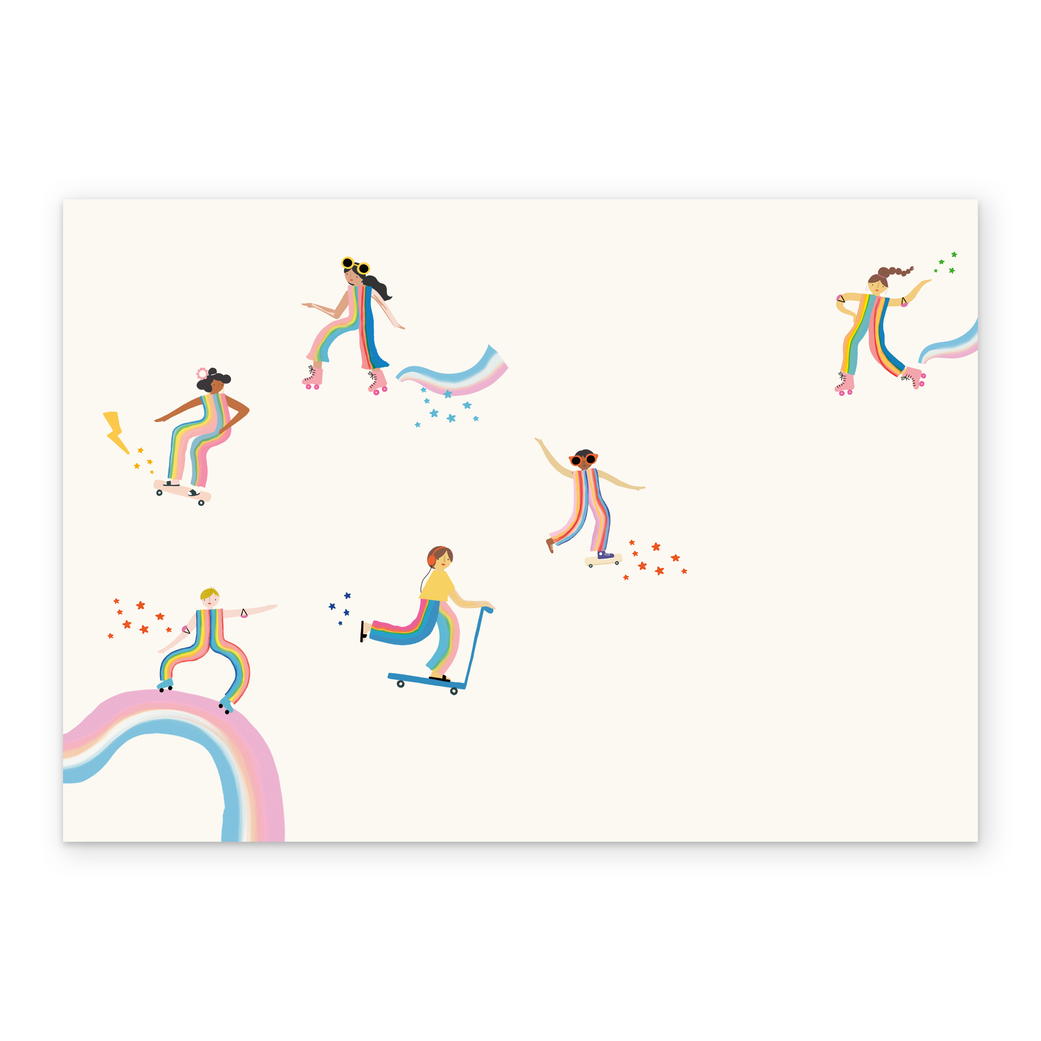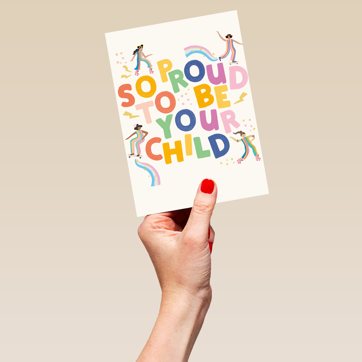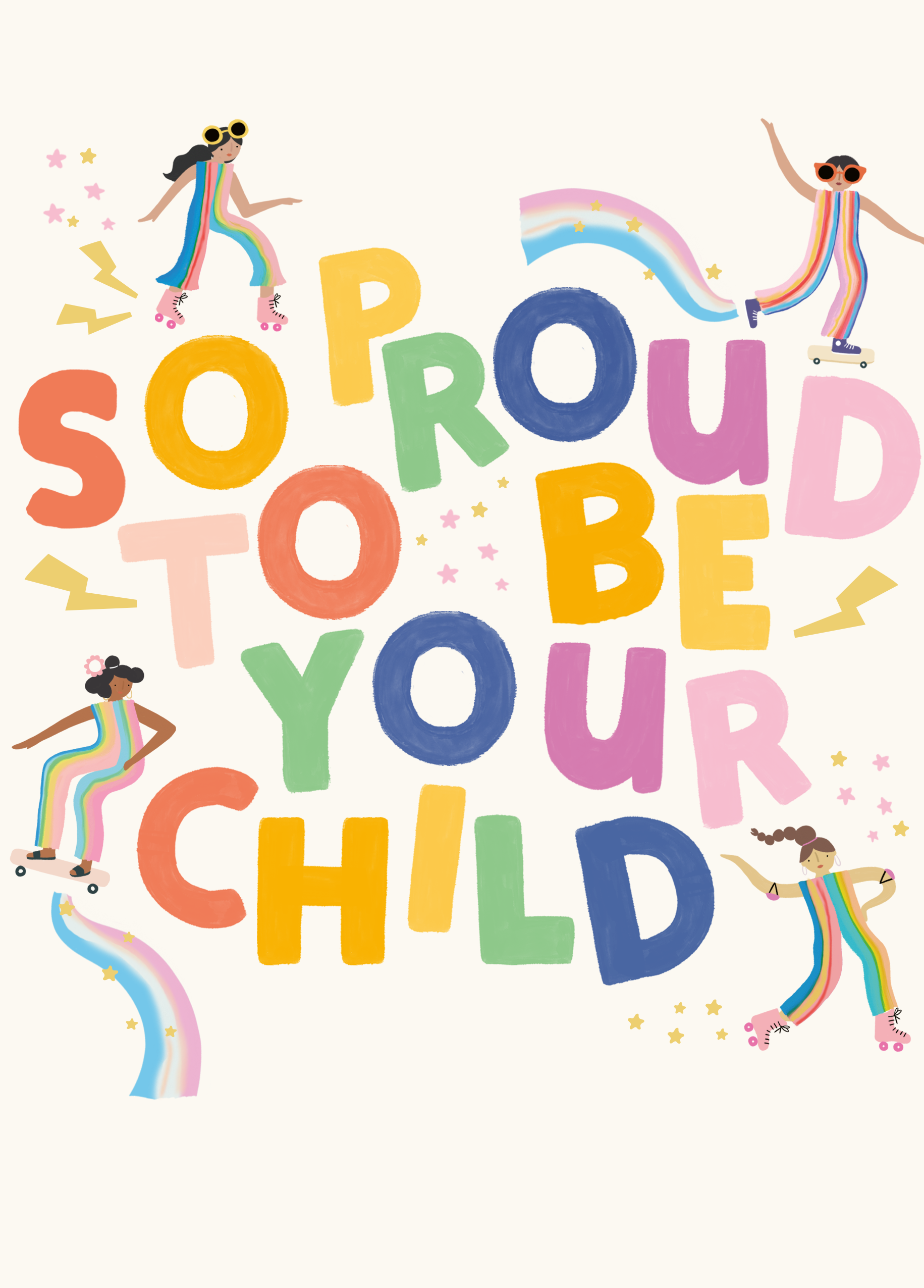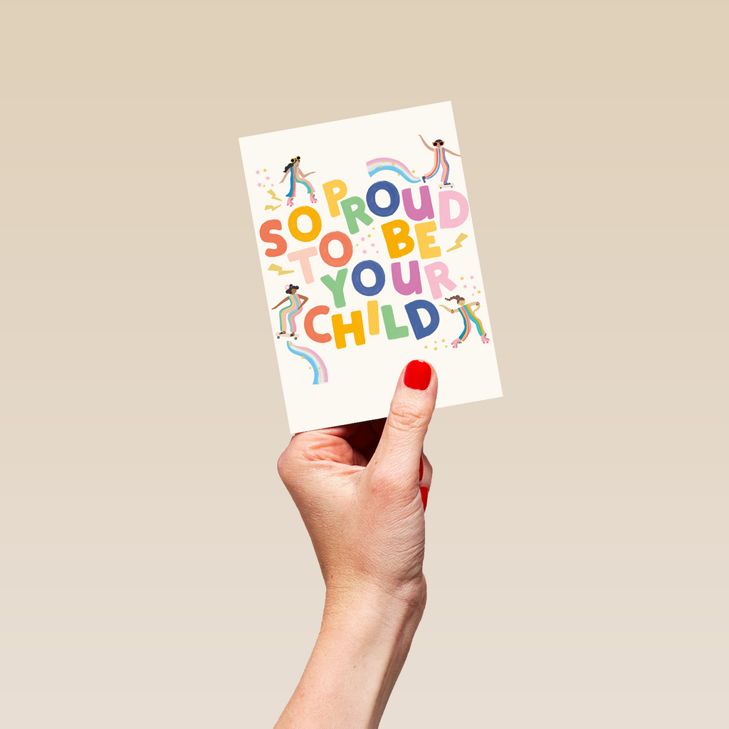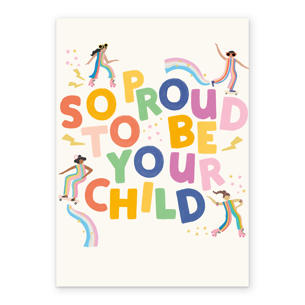 Printed on premium-quality board, this card features fun multicoloured text, illustrated roller-skating and skateboarding girls, stars and rainbows, with the message 'So Proud To Be Your Child', and comes complete with a co-ordinating white envelope.
