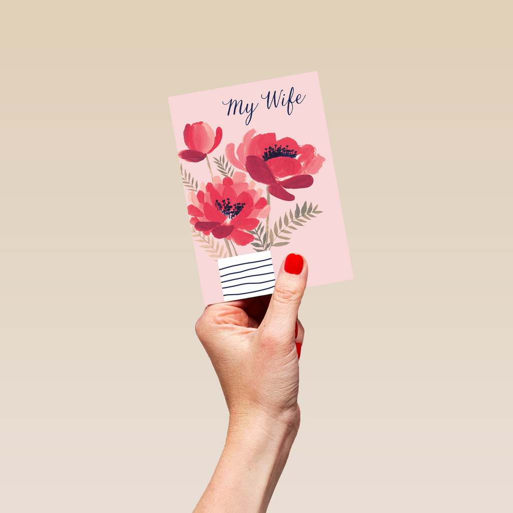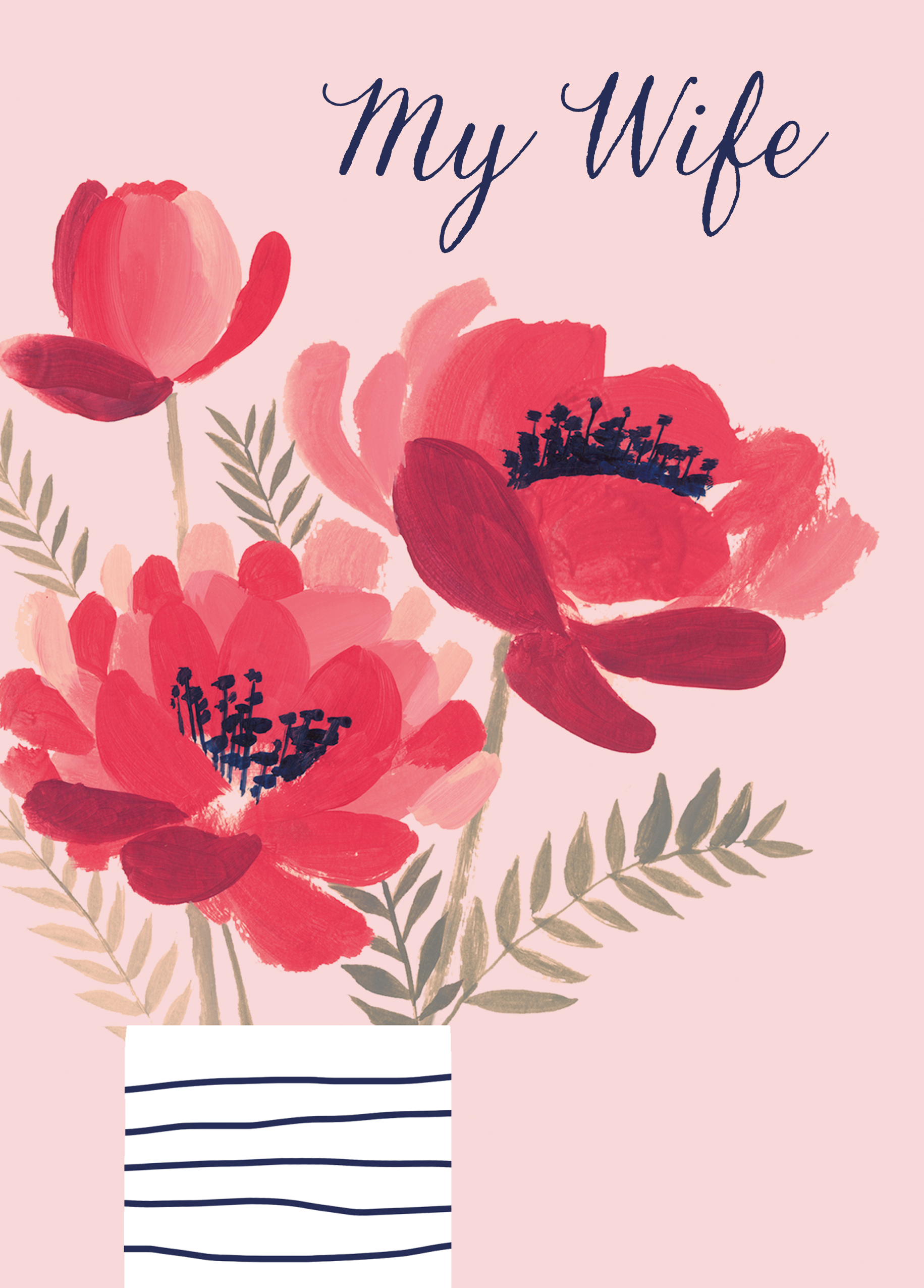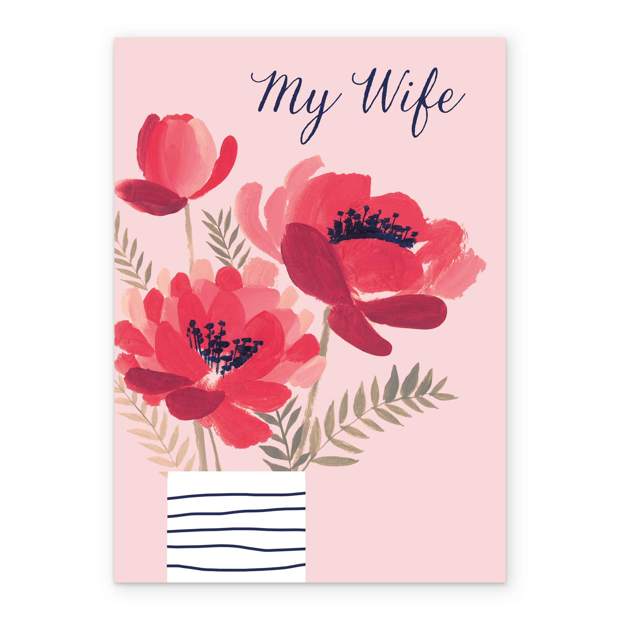Printed on premium-quality board, this card features a in background with a bouquet of pink flowers in a vase, with the message 'MY WIFE', space to personalise a name, and comes complete with a co-ordinating white envelope.