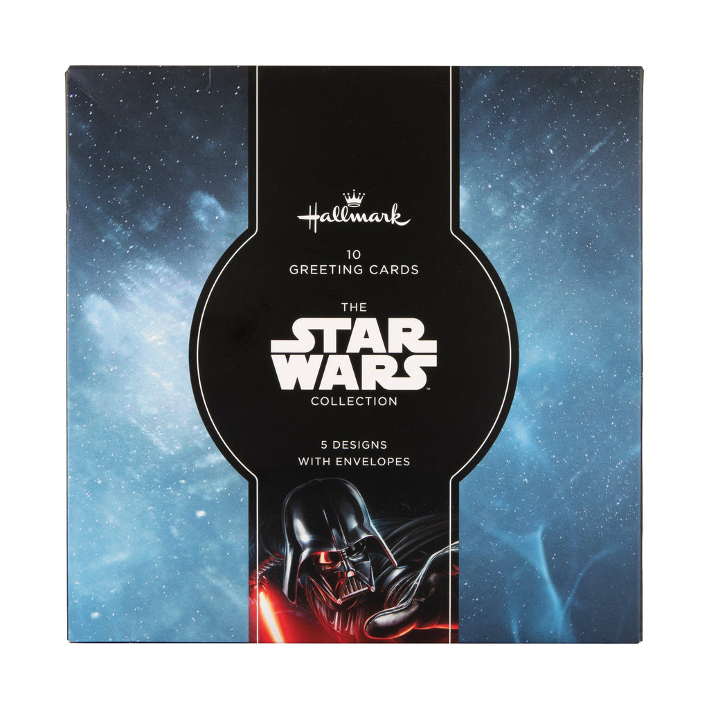 Printed on high-quality board, this pack of 10 cards comes in 5 awesome Star Wars™ designs. Each card features a Star Wars™ character including Boba Fett, Darth Vader, Stormtroopers, BB-8, R2-D2, C-3PO, Chewbacca the Wookiee, Yoda, TIE fighters and the Star Wars™ logo. Each card comes complete with a co-ordinating Hallmark branded, white envelope.