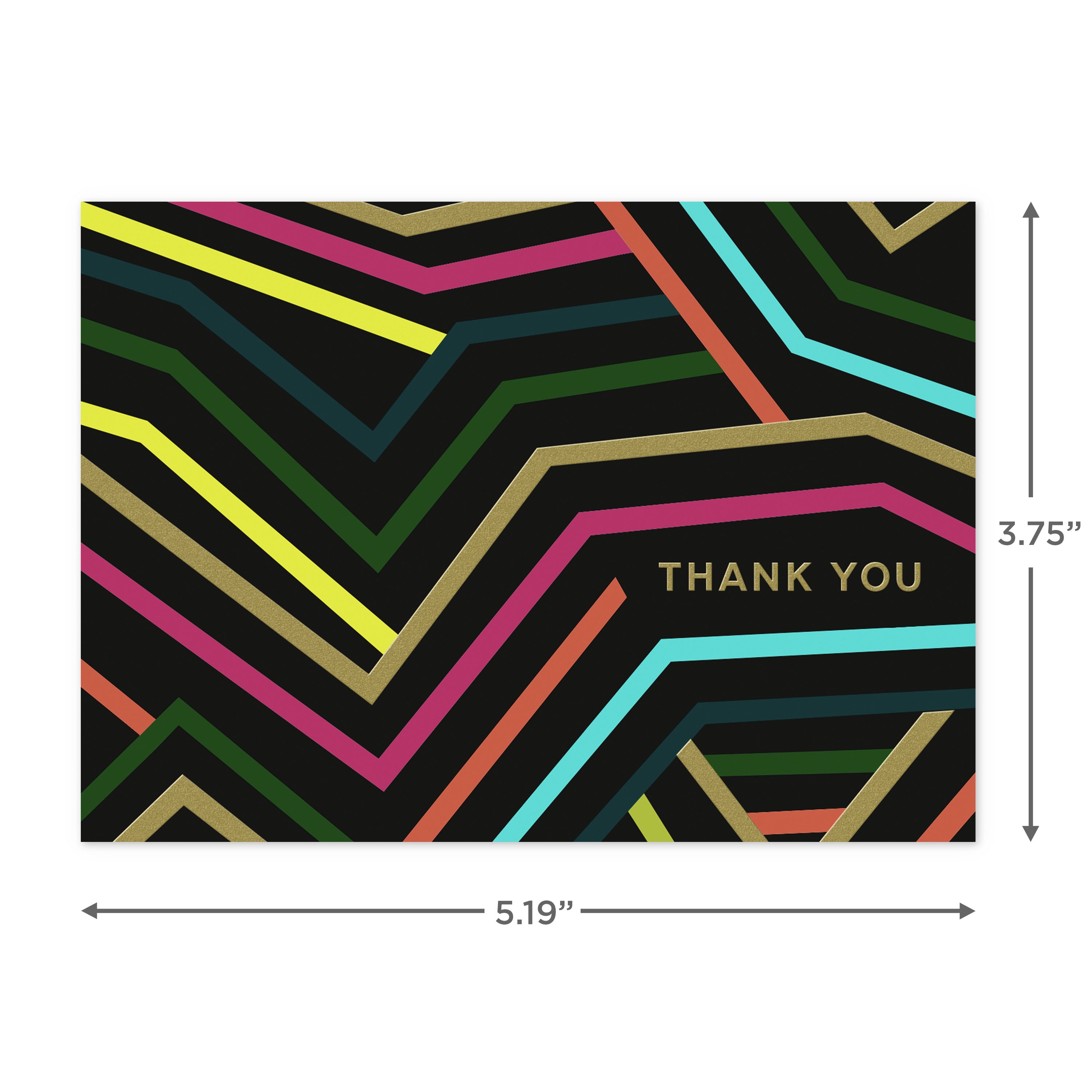 Printed on high quality board, this pack of 10 cards features 1 neon-inspired graphic-patterned design, with 'Thank You' on the front in gold-foiled lettering, and each card comes complete with a Hallmark branded, white envelope.