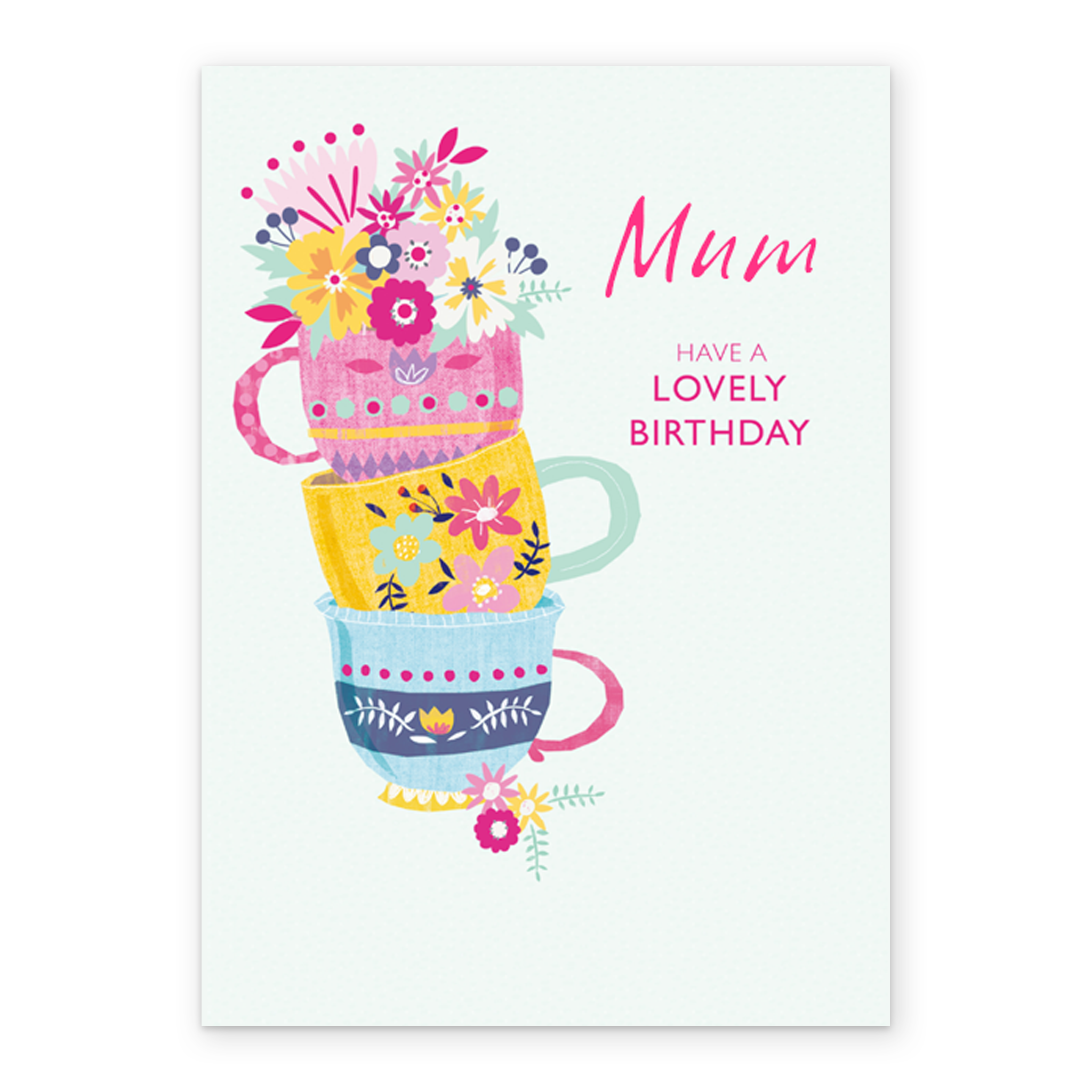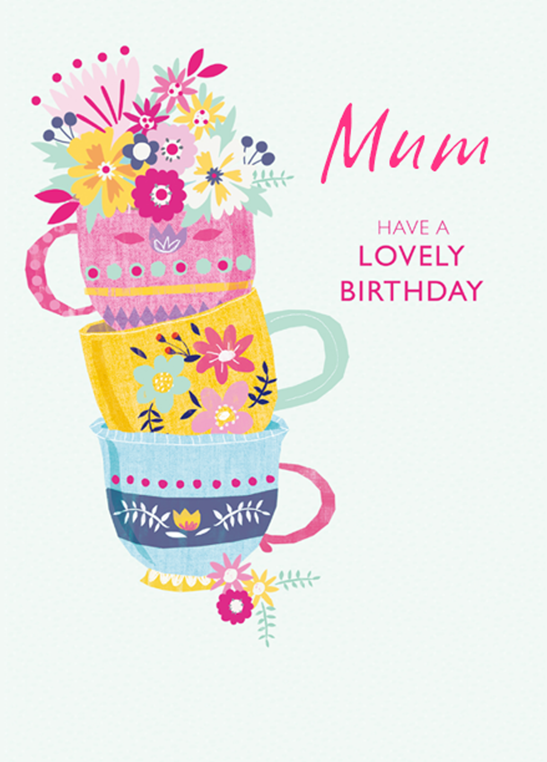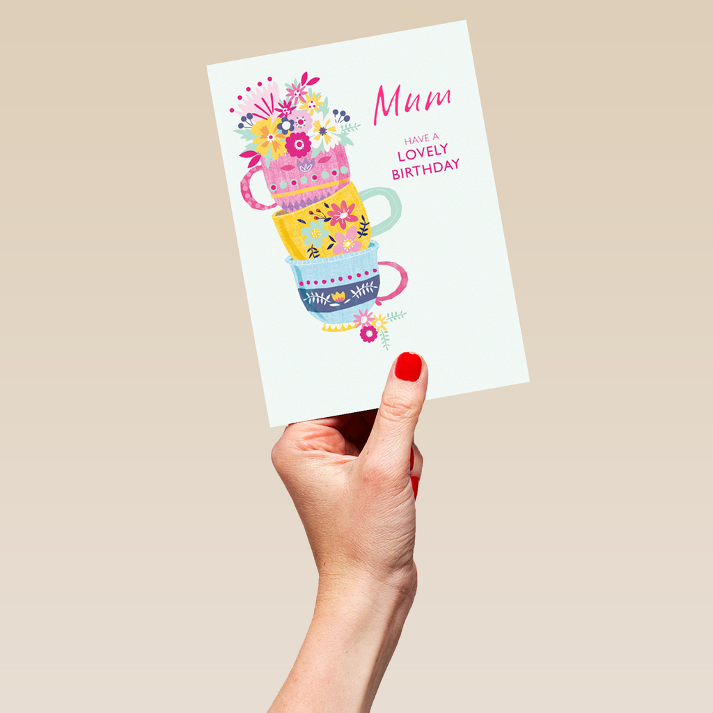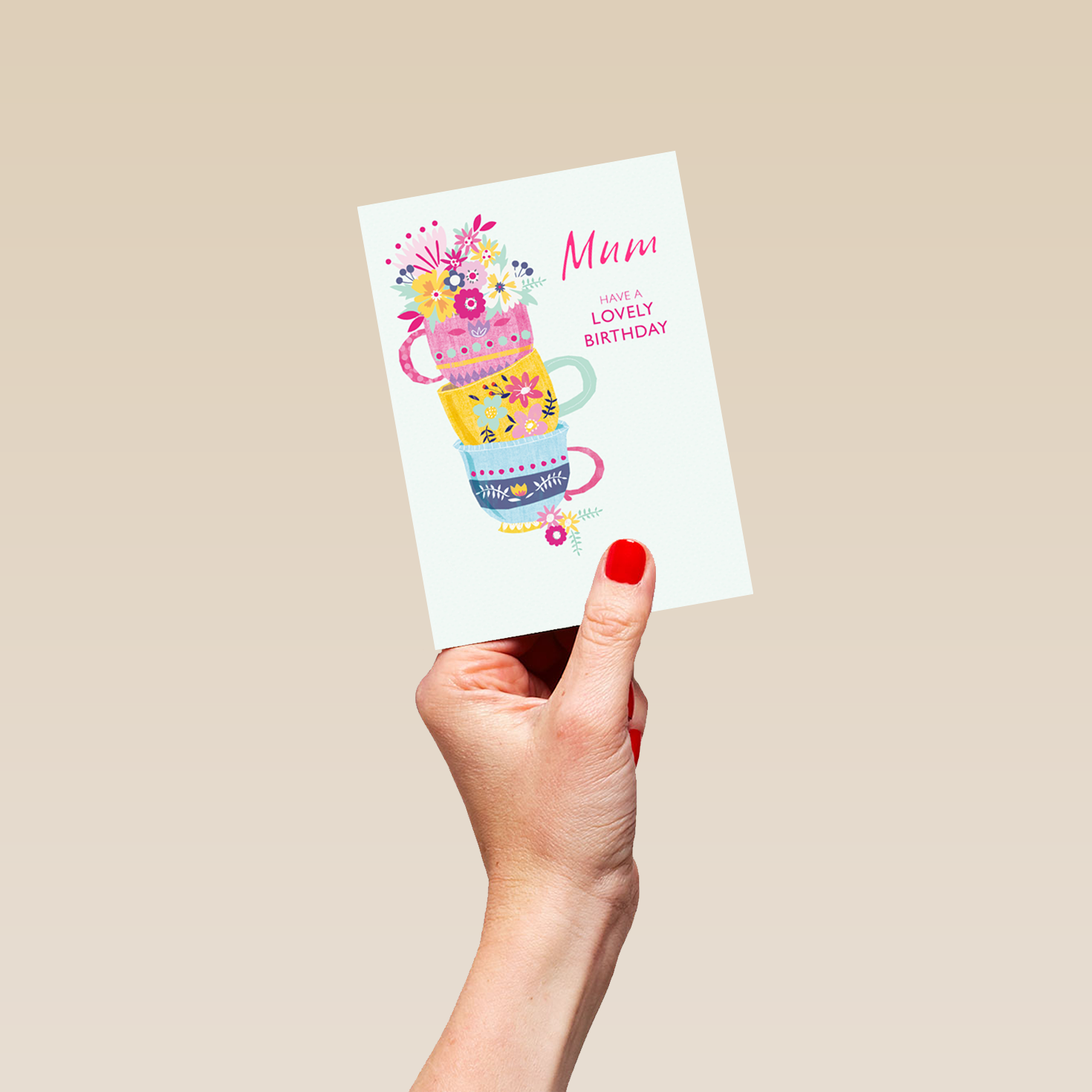 Show them you care with a personalised tea cups & flowers birthday card for mum from Hallmark. Our birthday cards are printed on premium quality, FSC®-certified card & delivered nationwide. This card is available as standard 12cm by 16.7cm and large 15.5cm by 21.6cm.