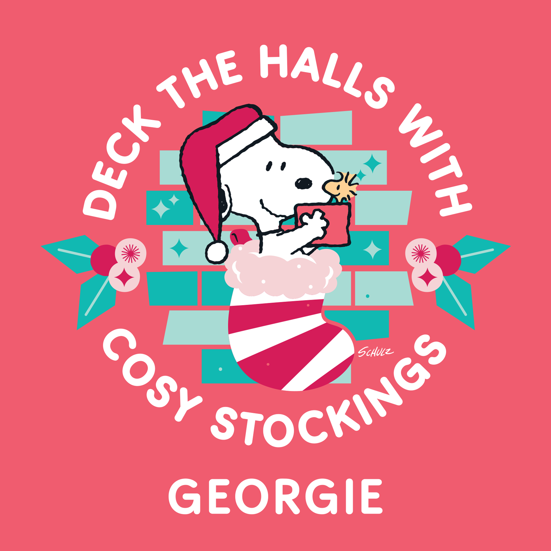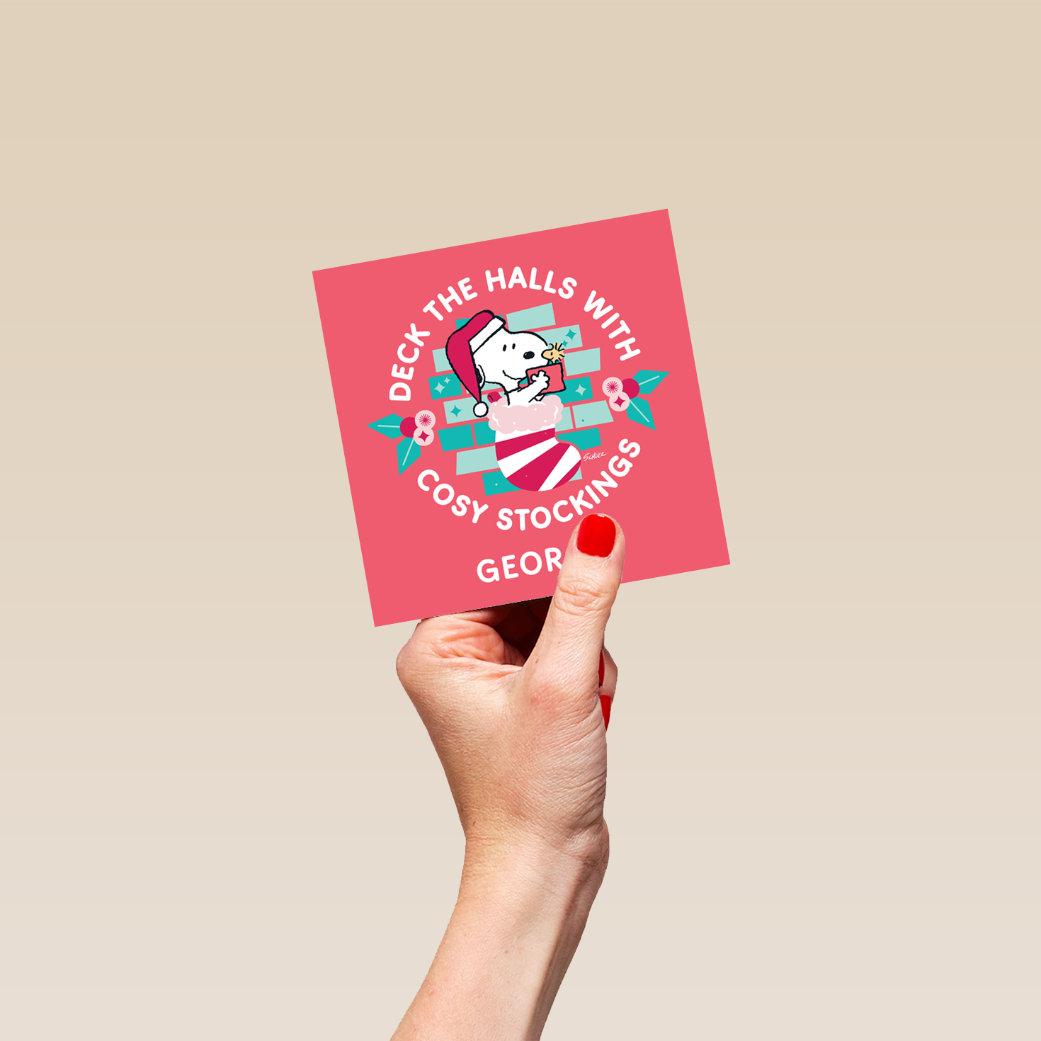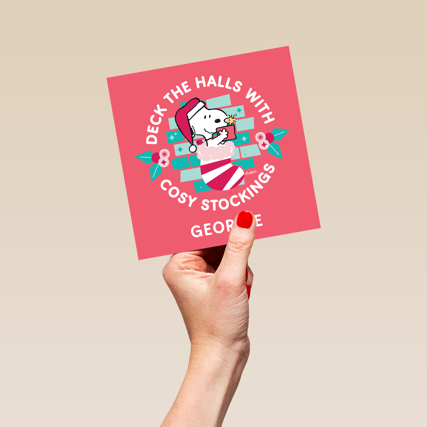 Printed on premium-quality board, this card features SNOOPY and WOODSTOCK in a Christmas stocking, with the message 'Deck the halls with cosy stockings', space to personalise a name, and comes complete with a co-ordinating white envelope.