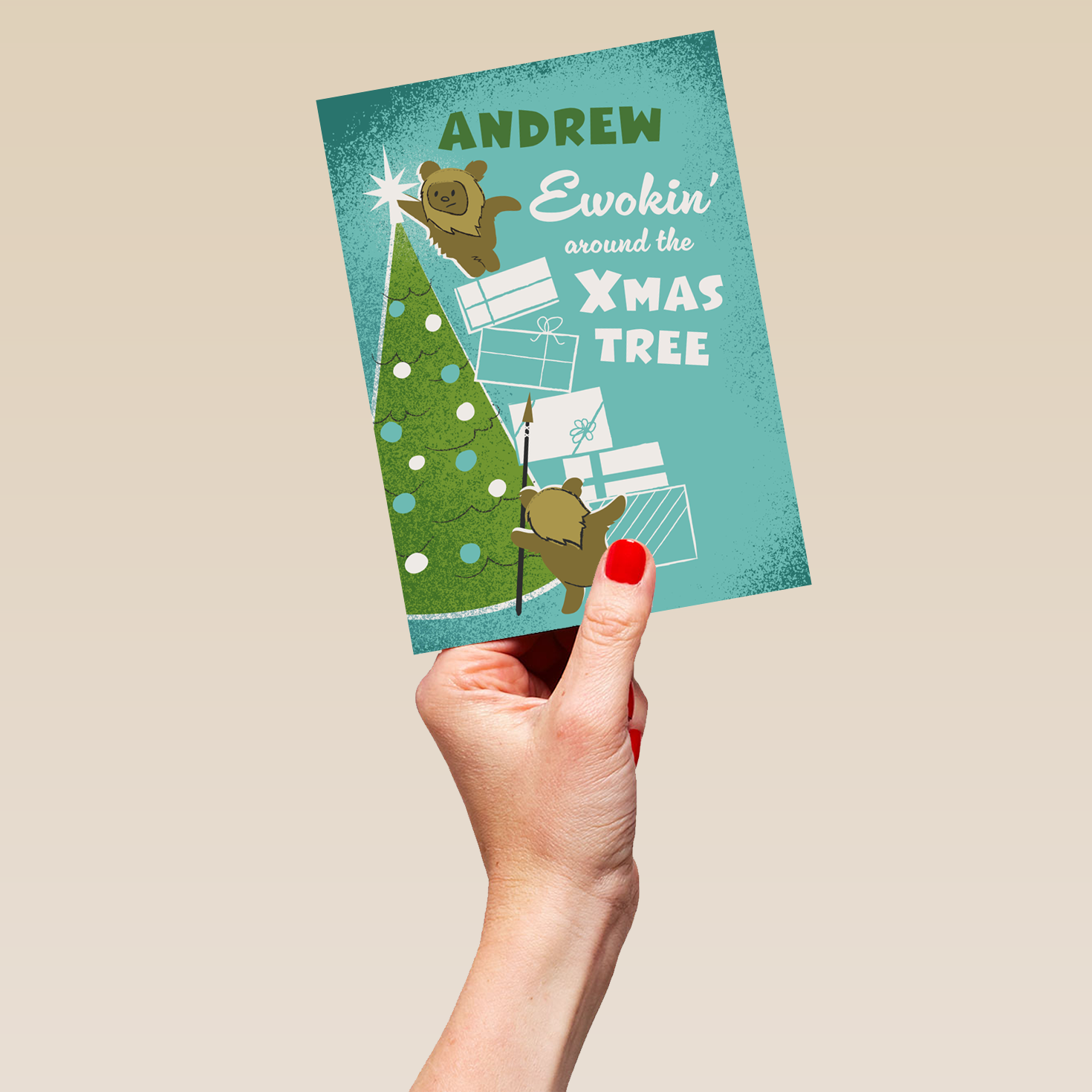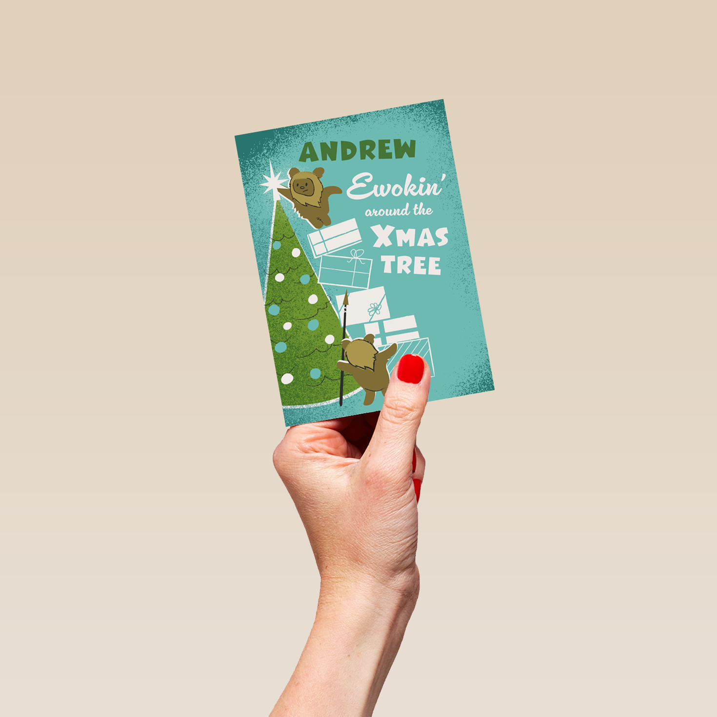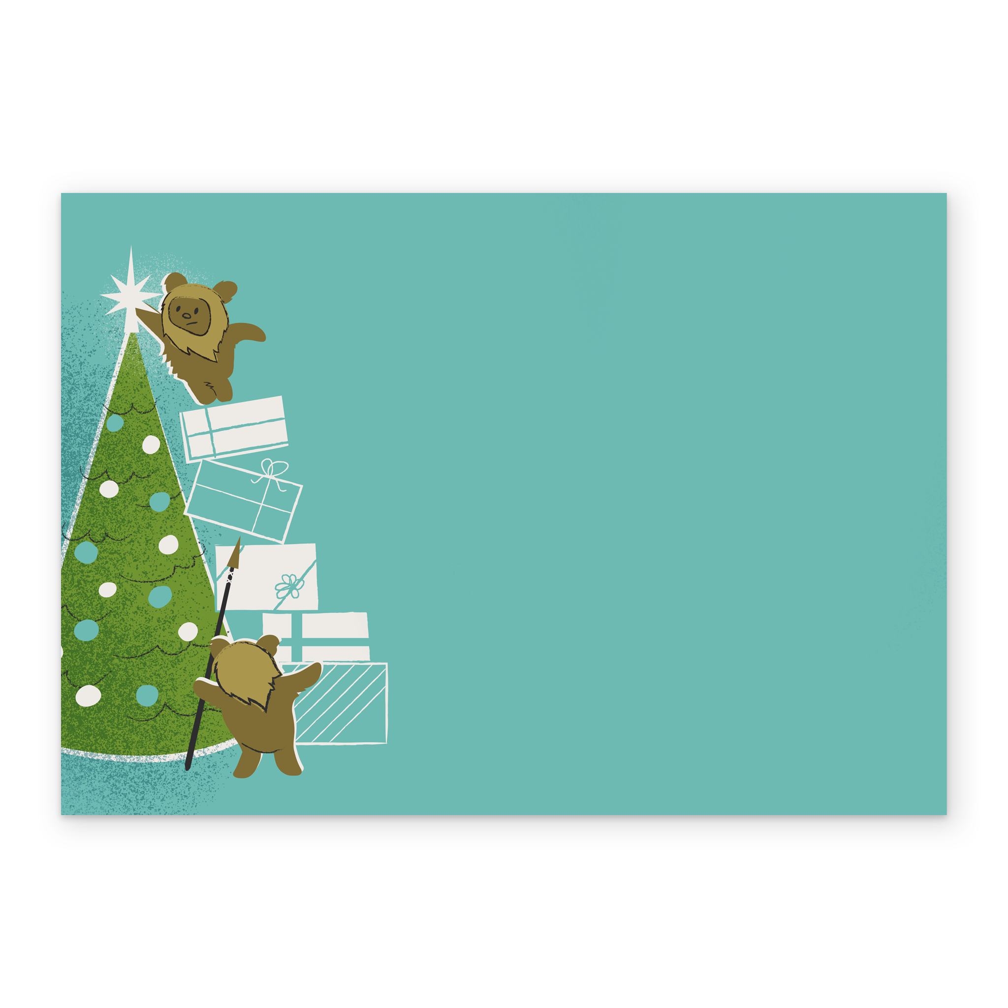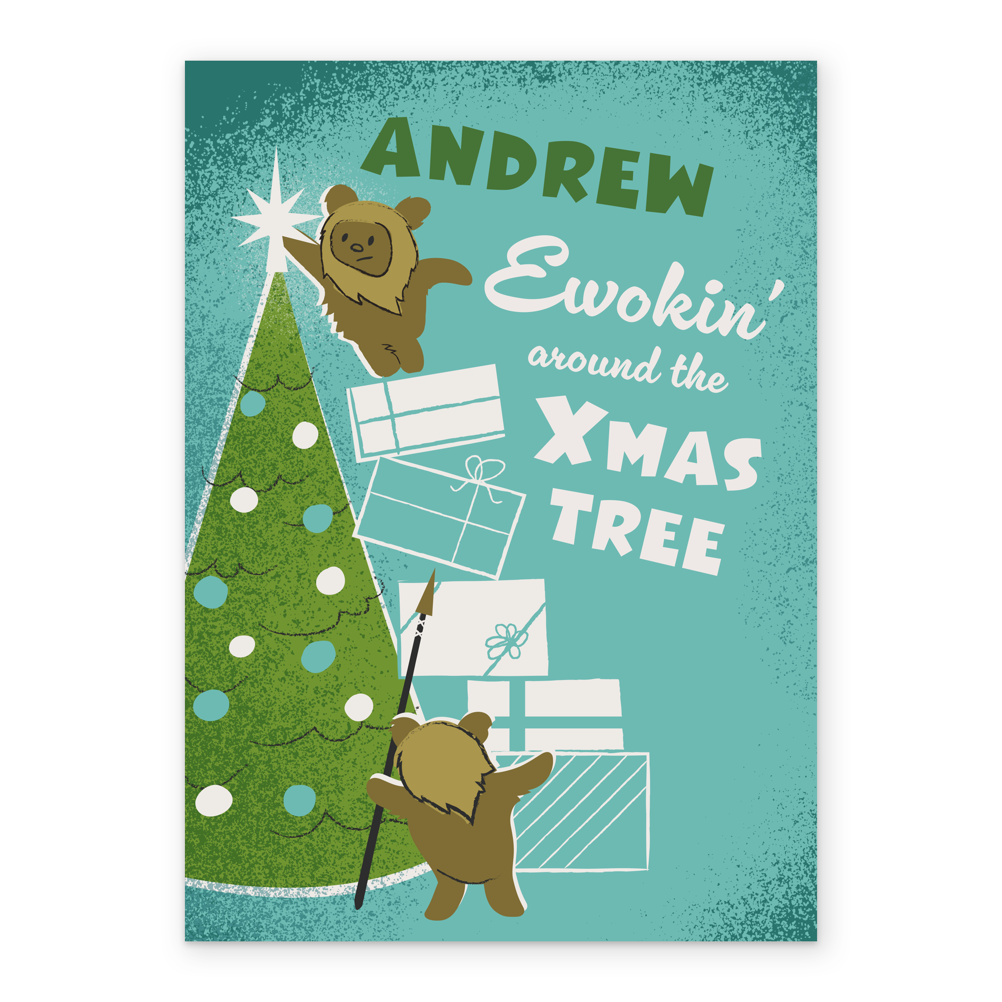 Printed on premium-quality board, this card features Ewoks decorating a Christmas tree, with the message 'Ewokin' around the Xmas tree', space to personalise a name, and comes complete with a co-ordinating white envelope.
