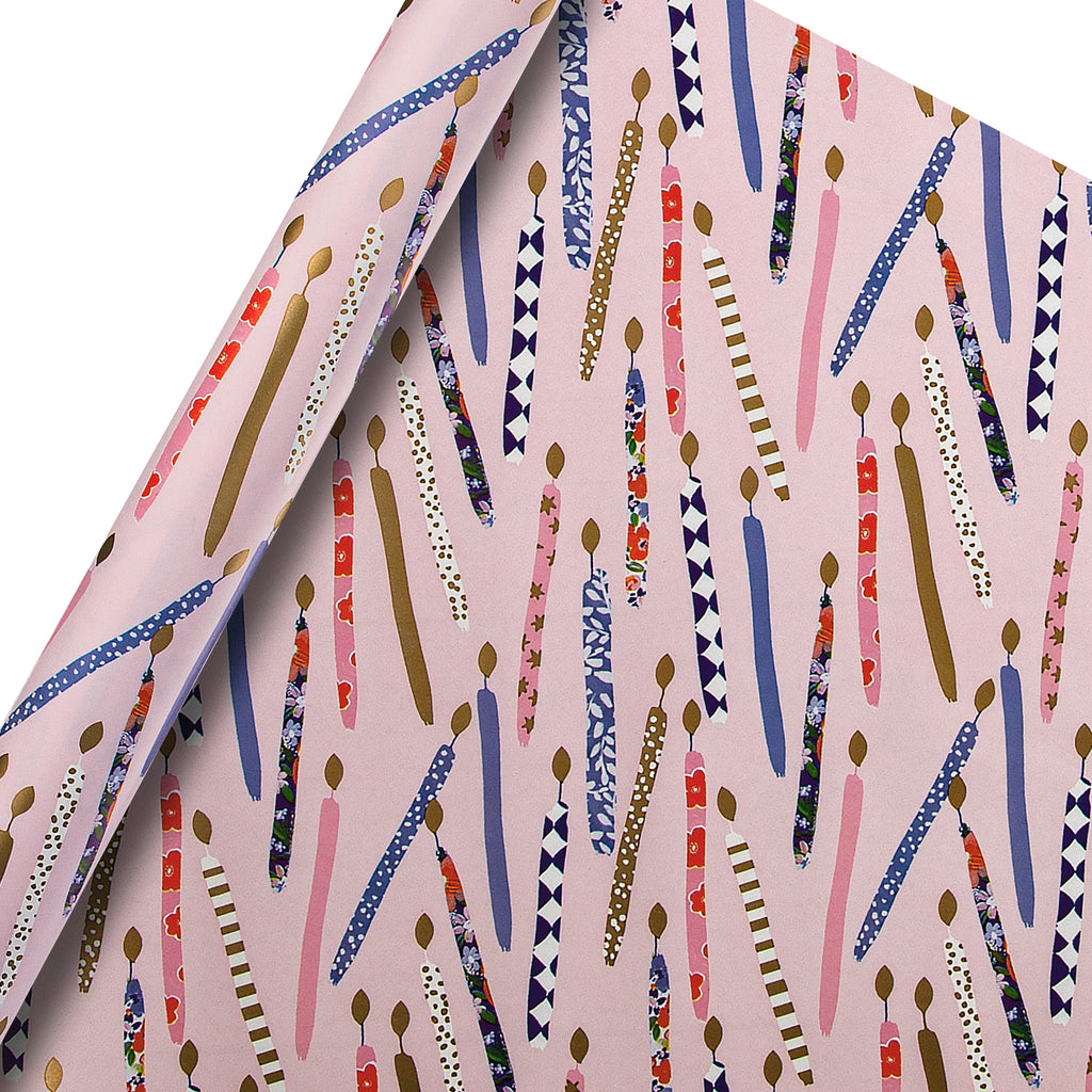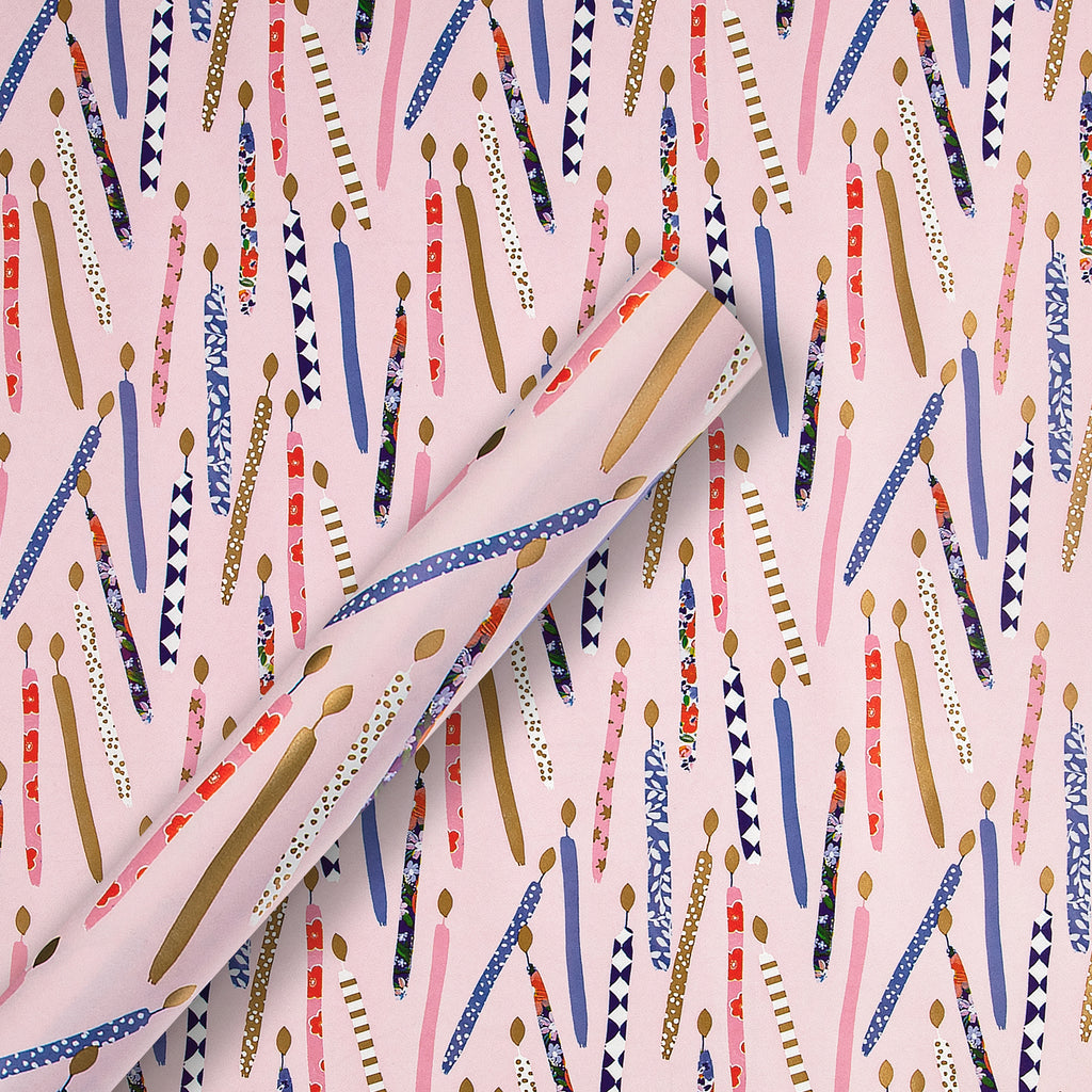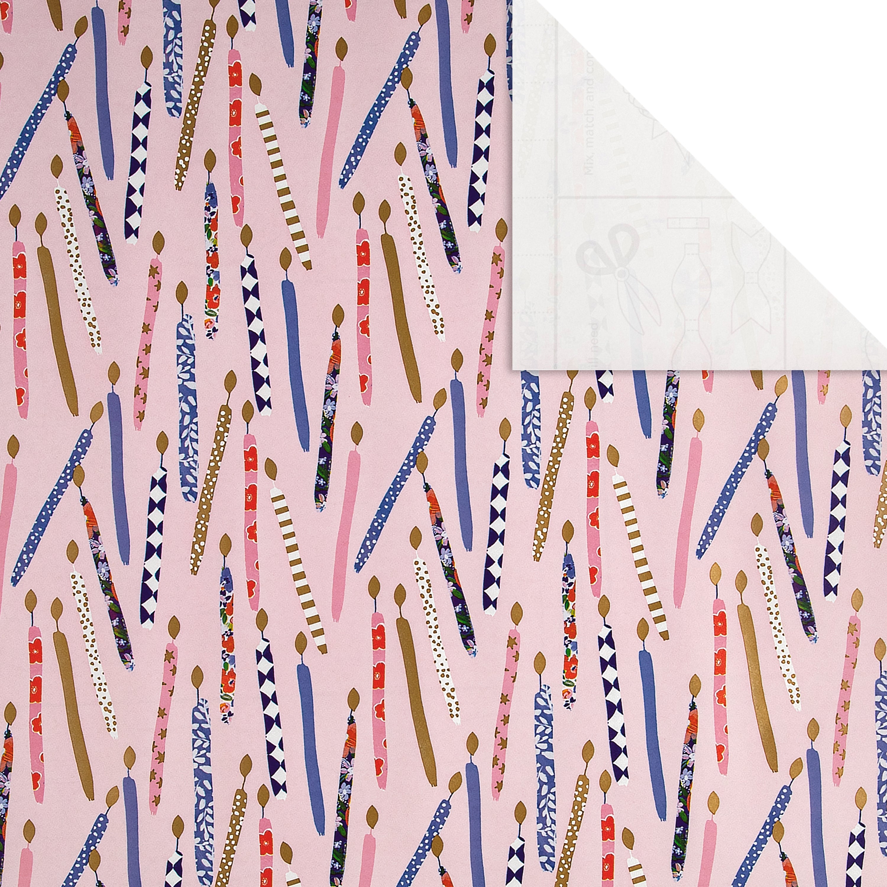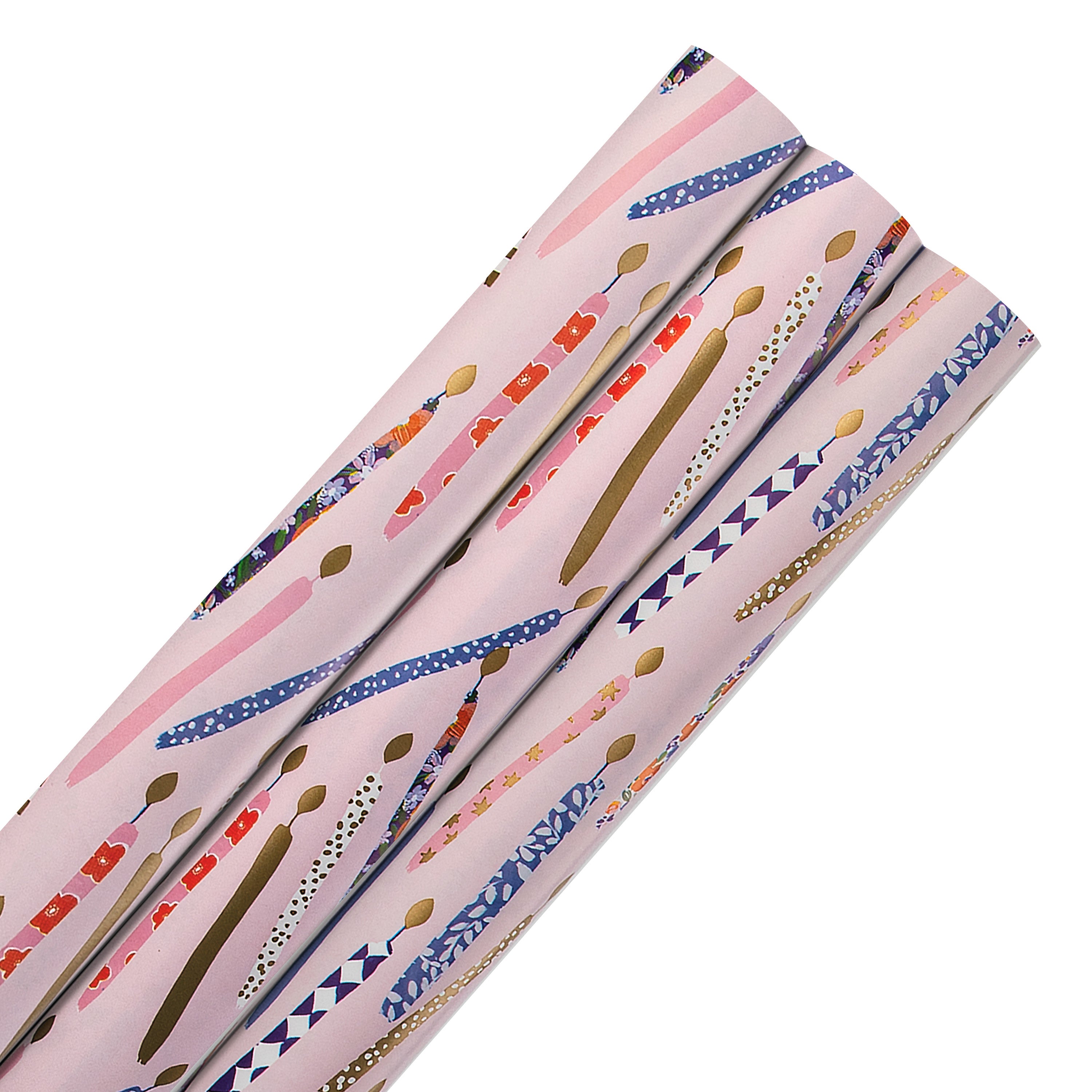 This pack features 3 rolls of wrapping paper in 1 pink background with colourful candles design.