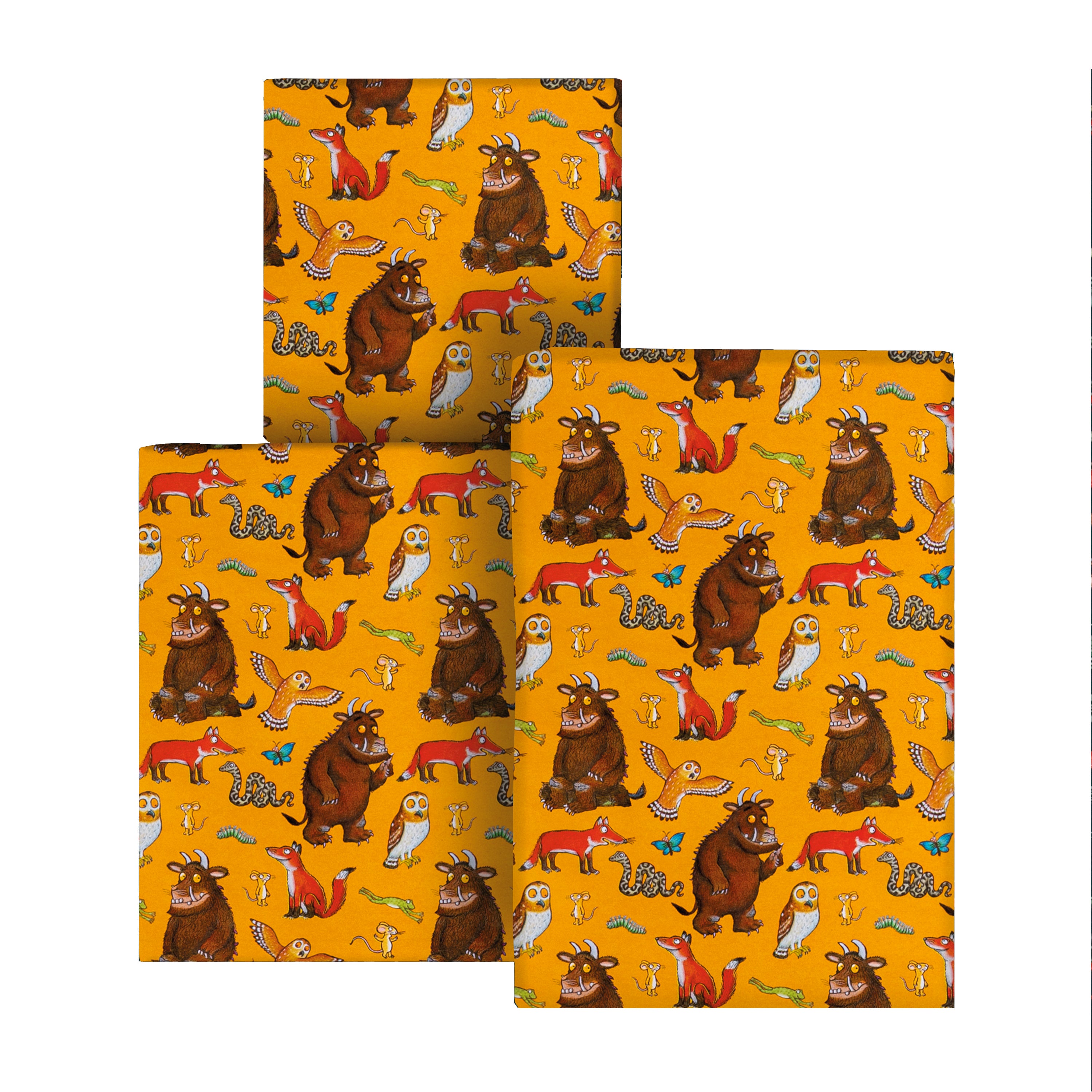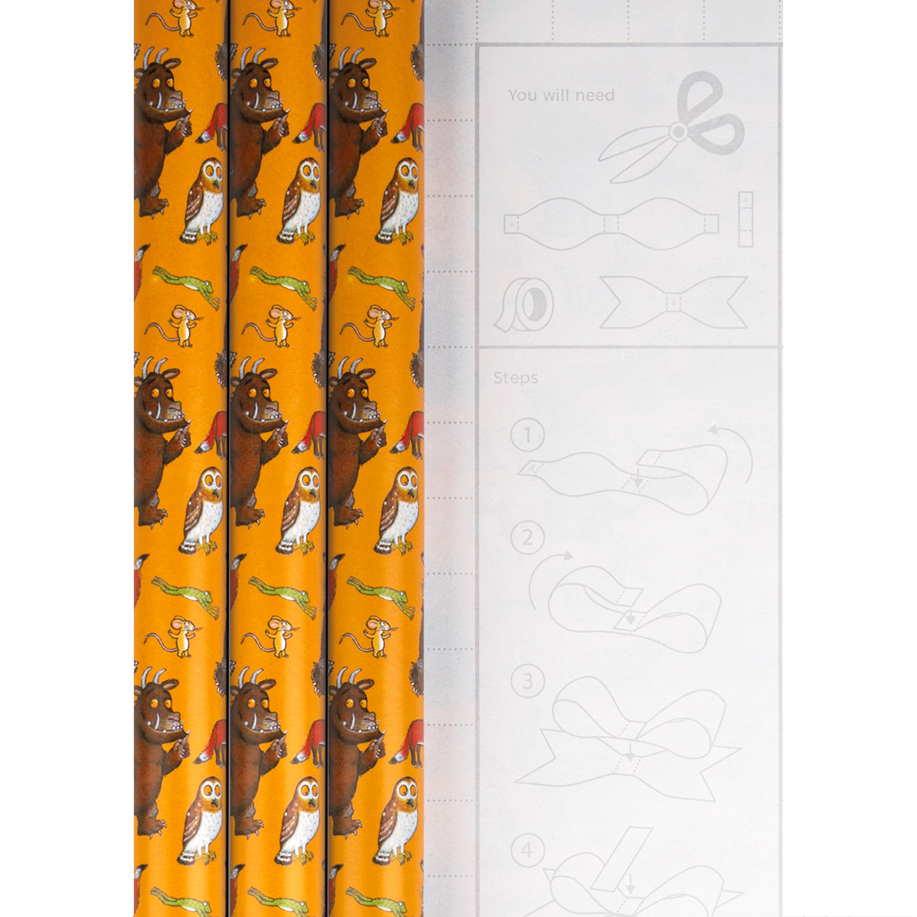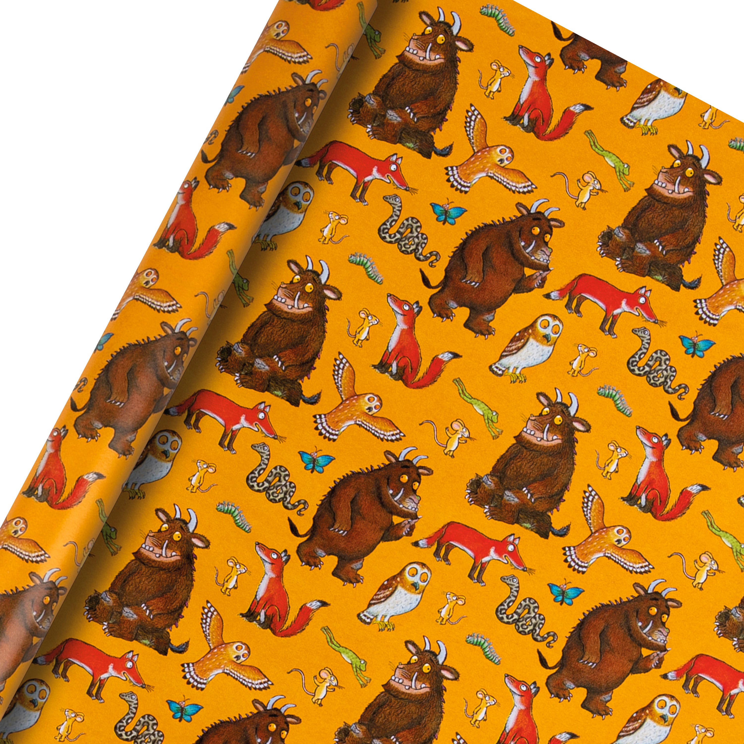 Containing 6m of wrapping paper with an adorable Julia Donaldson inspired Gruffalo design featuring The Gruffalo, the Little Brown Mouse and all the other woodland characters against a rich orange/yellow background.