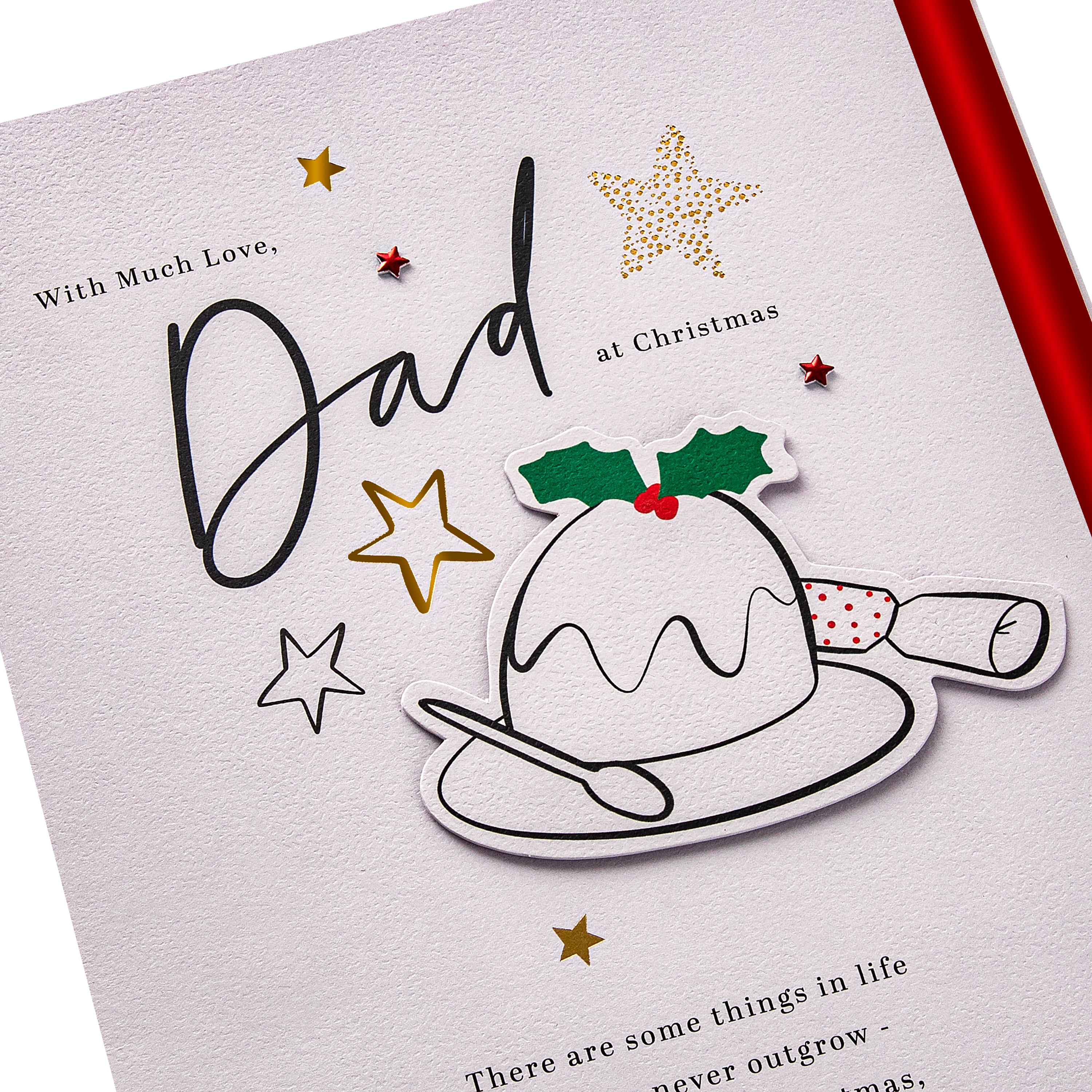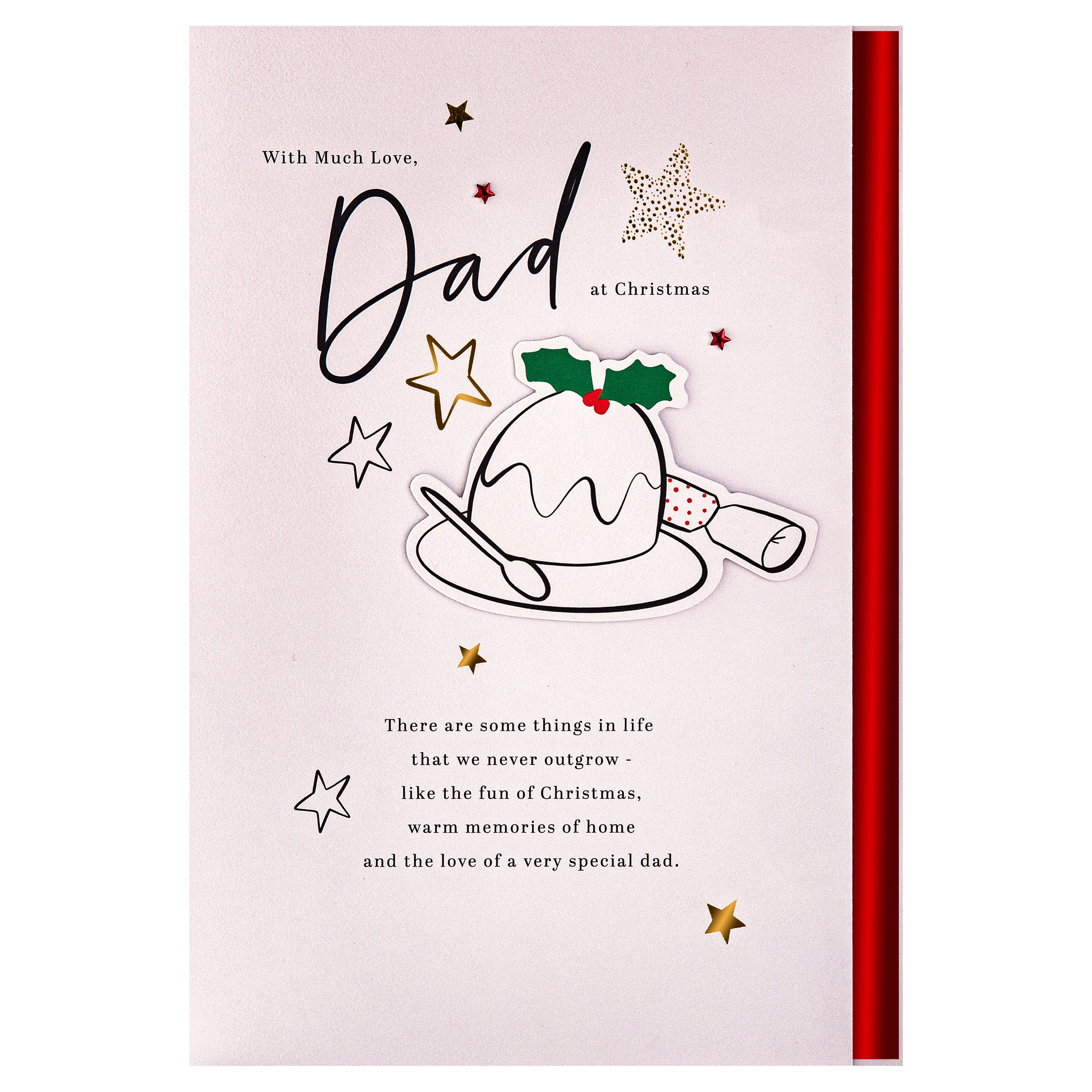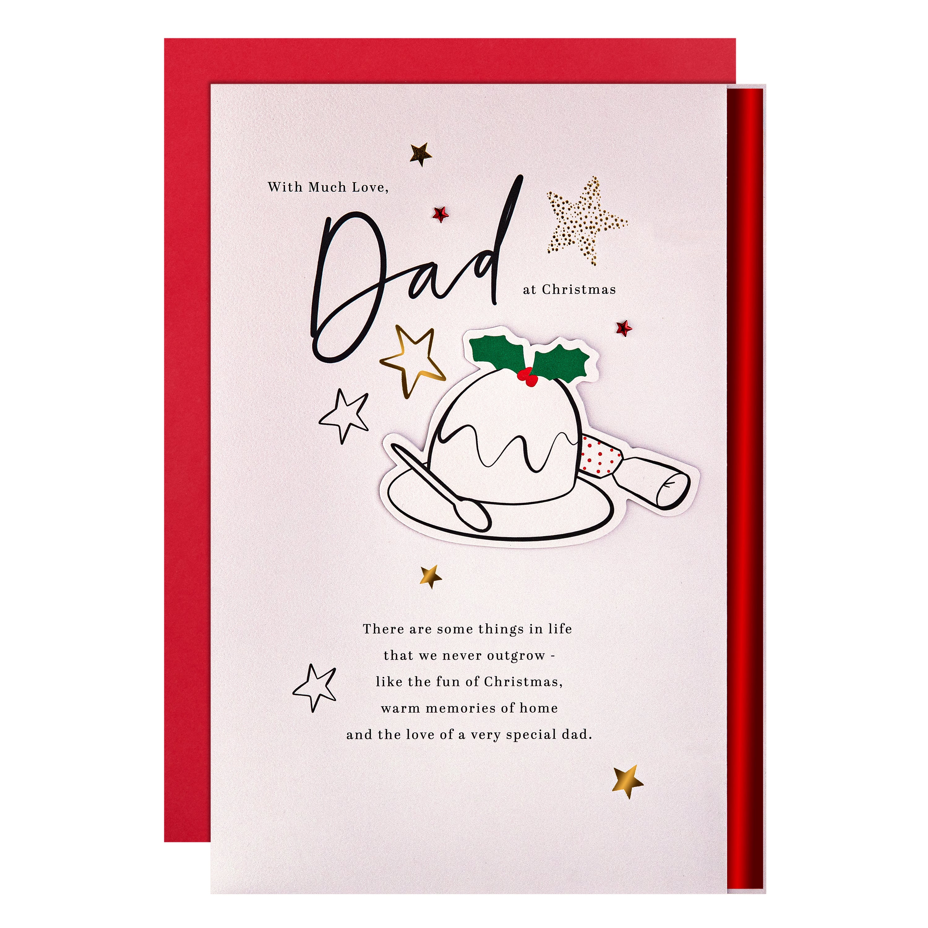 Make Dad's Christmas extra special with this beautifully crafted card from Hallmark’s Precious Expressions range. This Christmas pudding design features foil details, red foil paper star attachments and a 4-page foiled insert with die-cut elements and red foil details. Special sentiment runs across all pages to tell Dad how much he means at Christmas. This elegant card comes with a red Hallmark branded envelope.