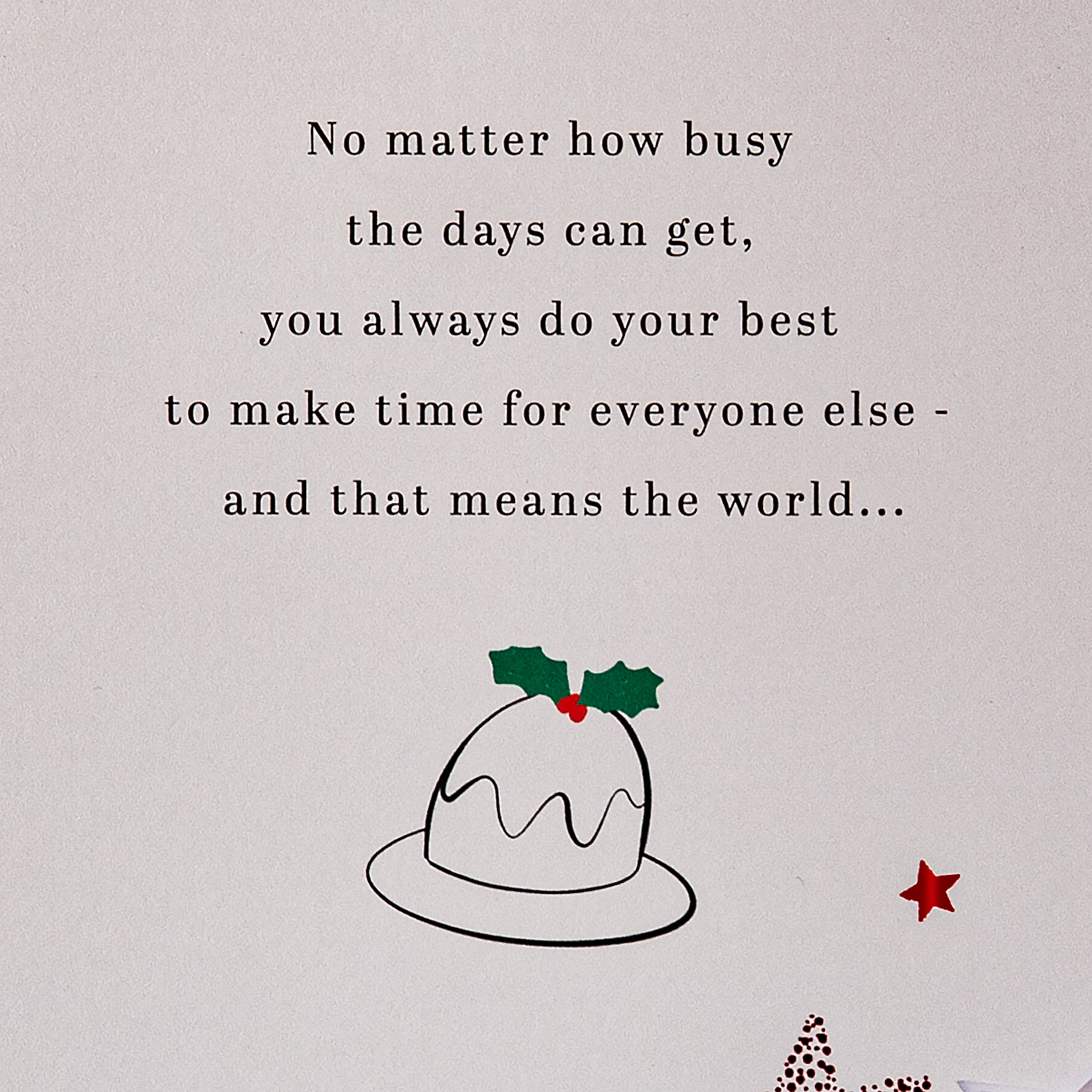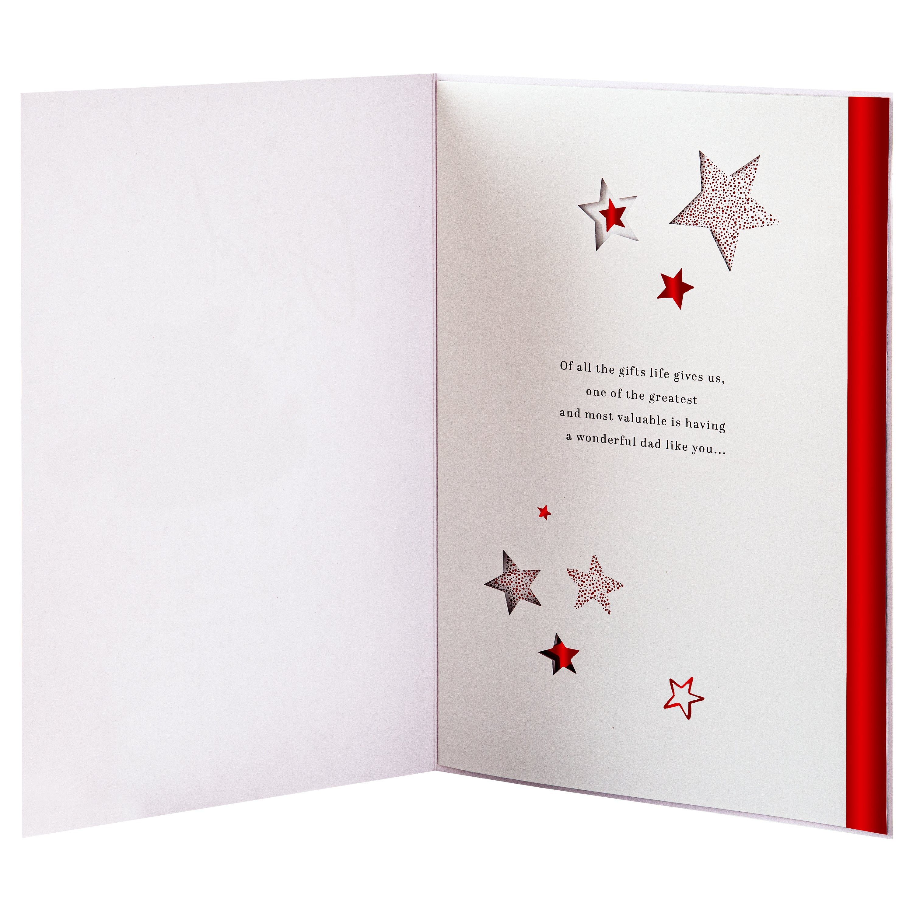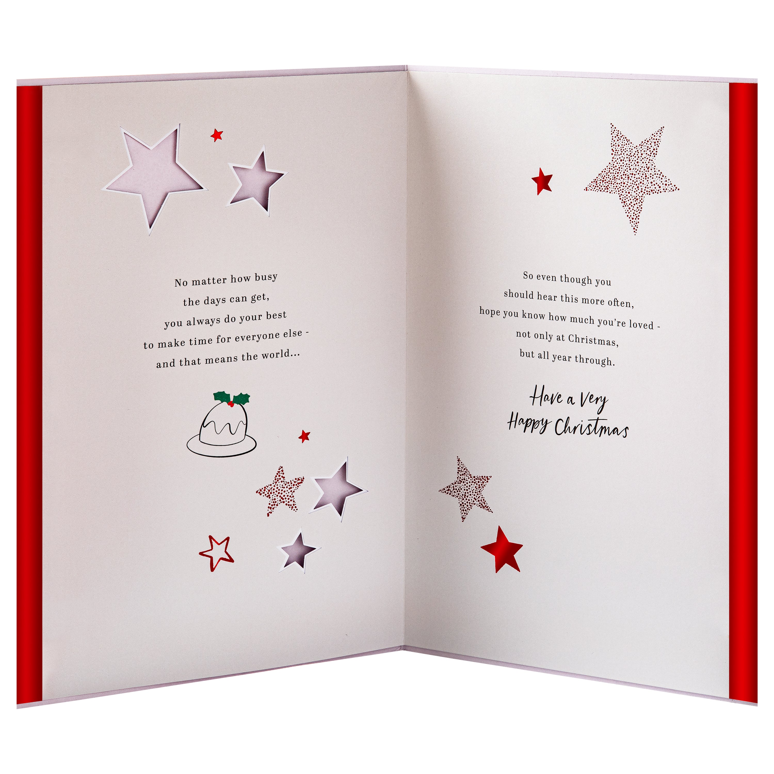 Make Dad's Christmas extra special with this beautifully crafted card from Hallmark’s Precious Expressions range. This Christmas pudding design features foil details, red foil paper star attachments and a 4-page foiled insert with die-cut elements and red foil details. Special sentiment runs across all pages to tell Dad how much he means at Christmas. This elegant card comes with a red Hallmark branded envelope.