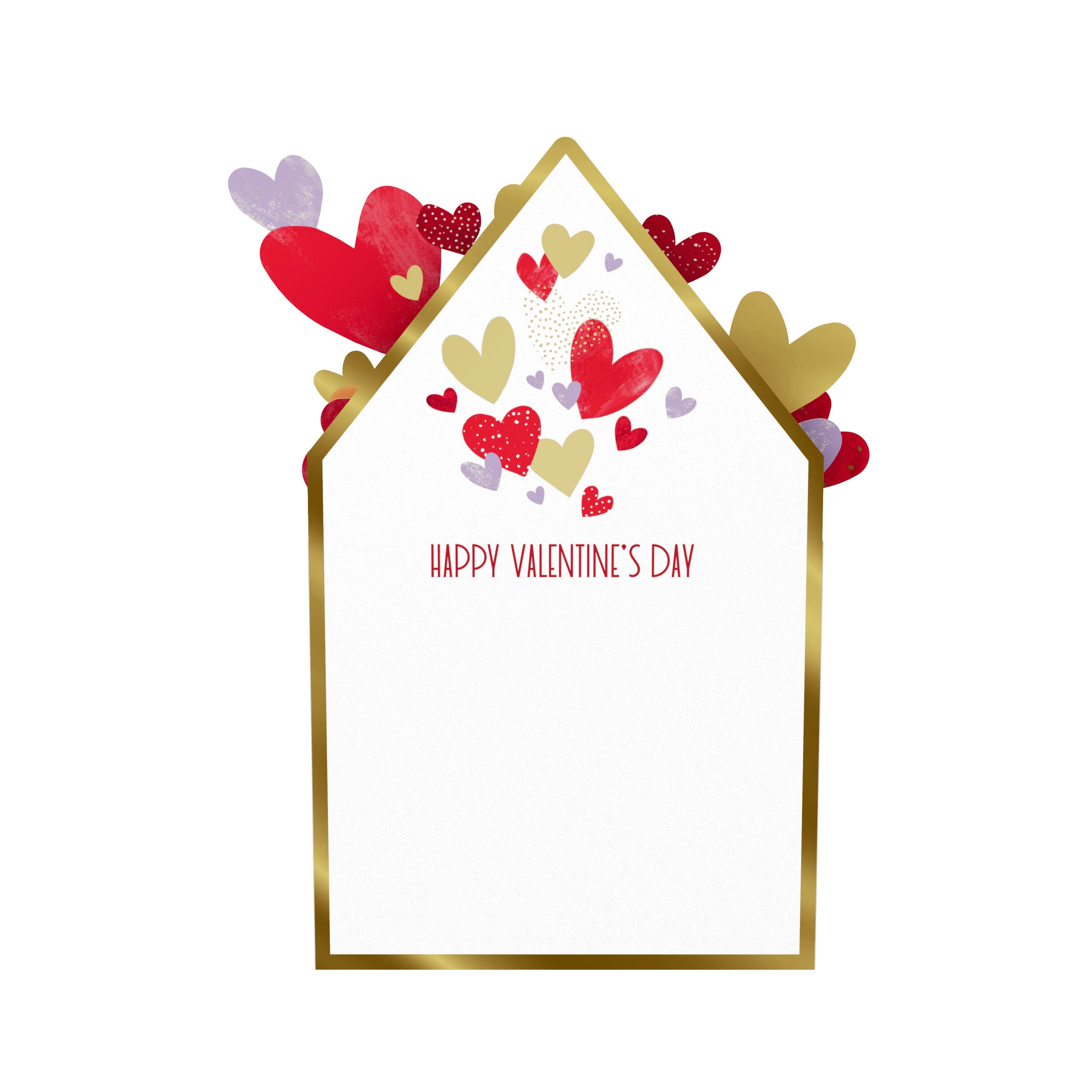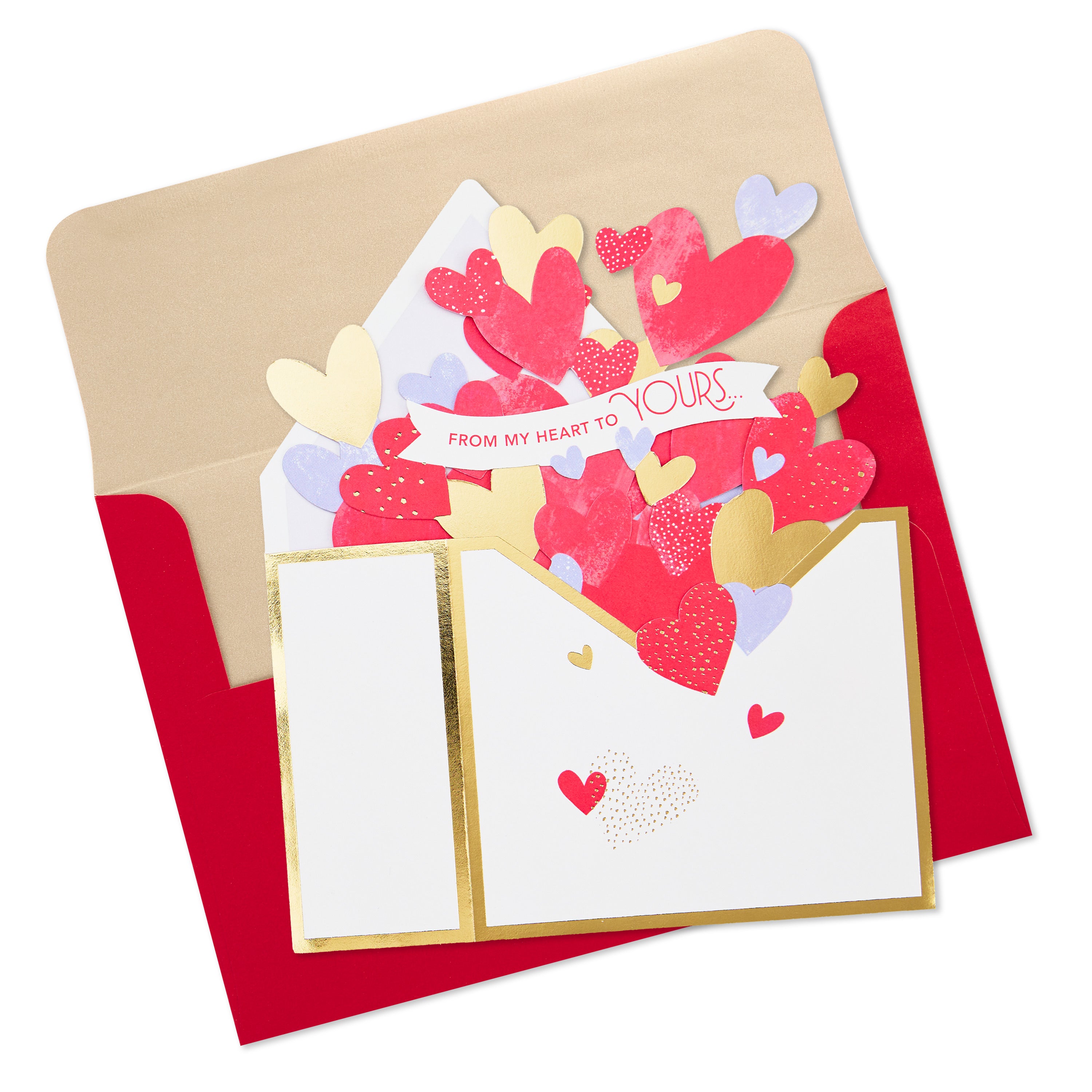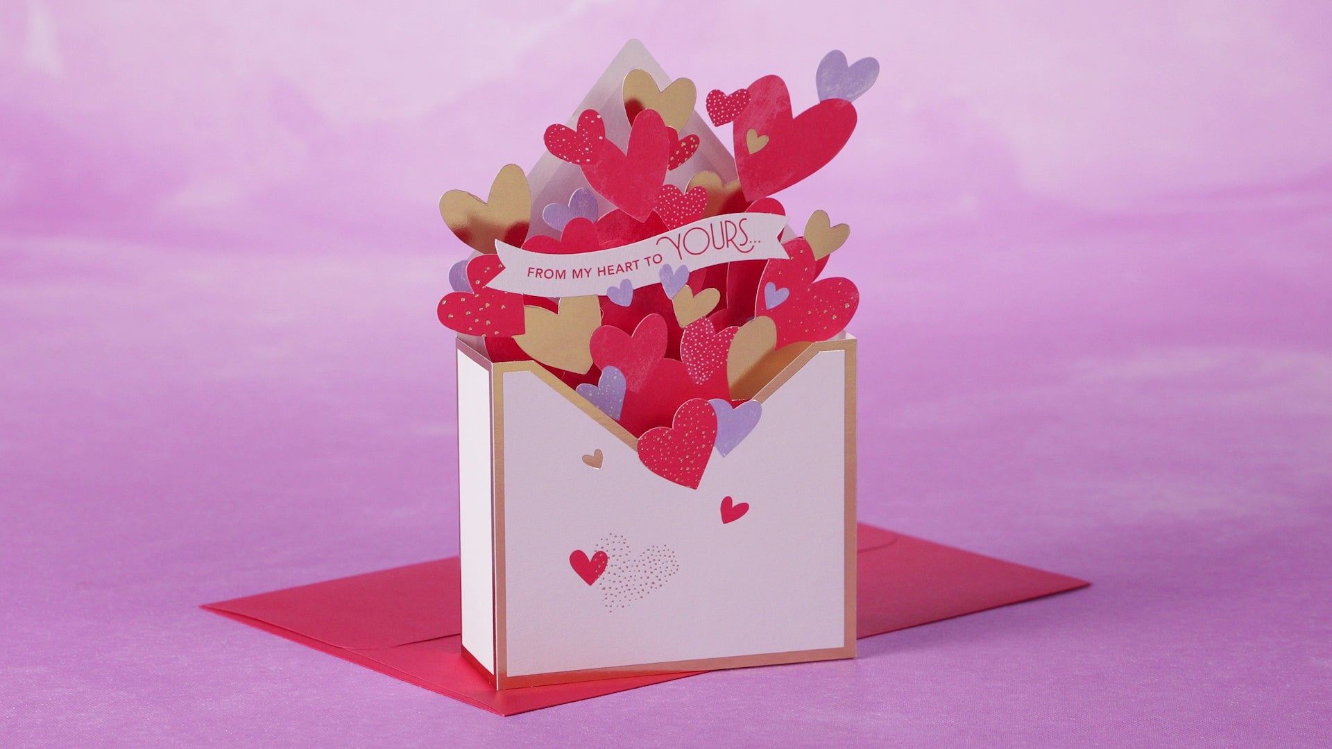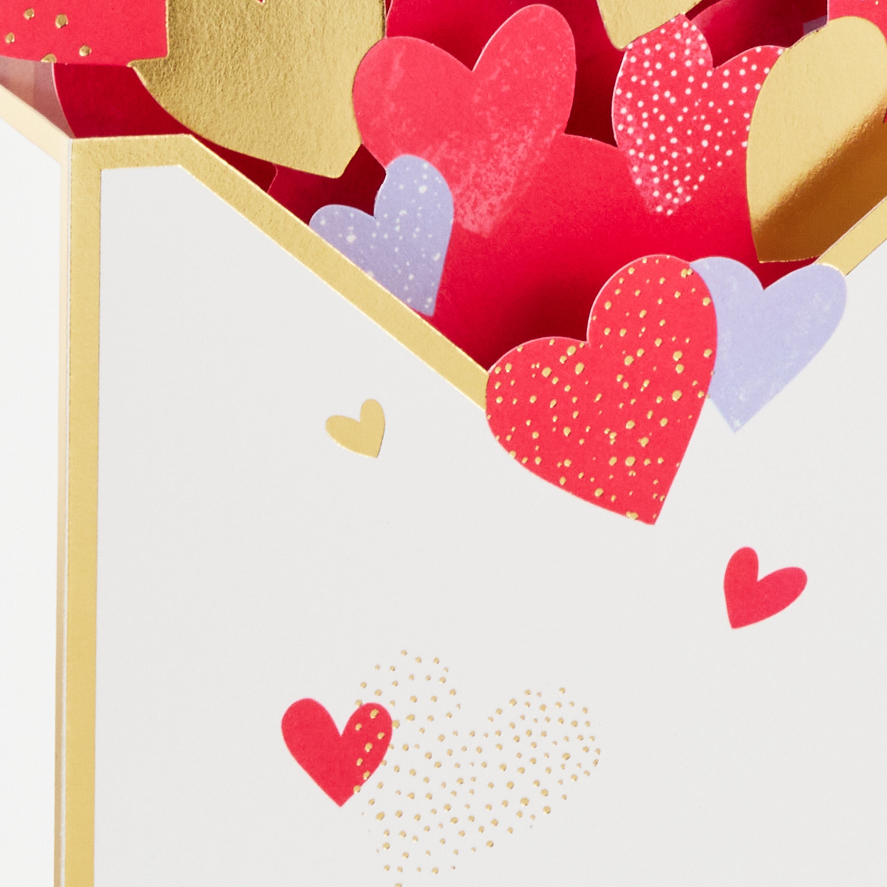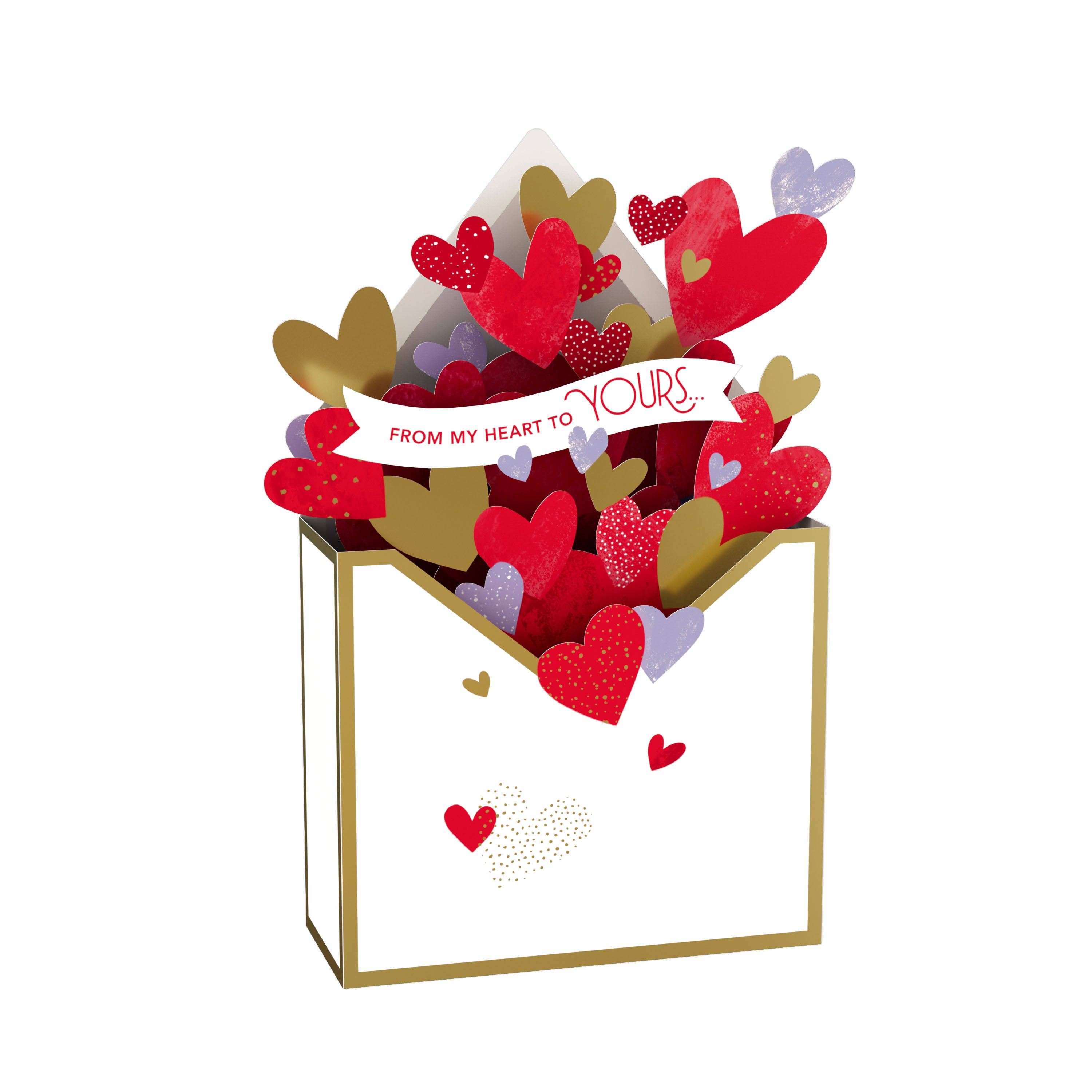 Printed on high quality board and designed to pop-up easily, with no assembly required, this stunning die-cut card features an intricate 3D design of an envelope like box, overflowing with red, gold and purple hearts, with gold-foiled details, red lettering and the message, 'From my heart to yours…'. The card comes complete with a red Hallmark branded envelope.