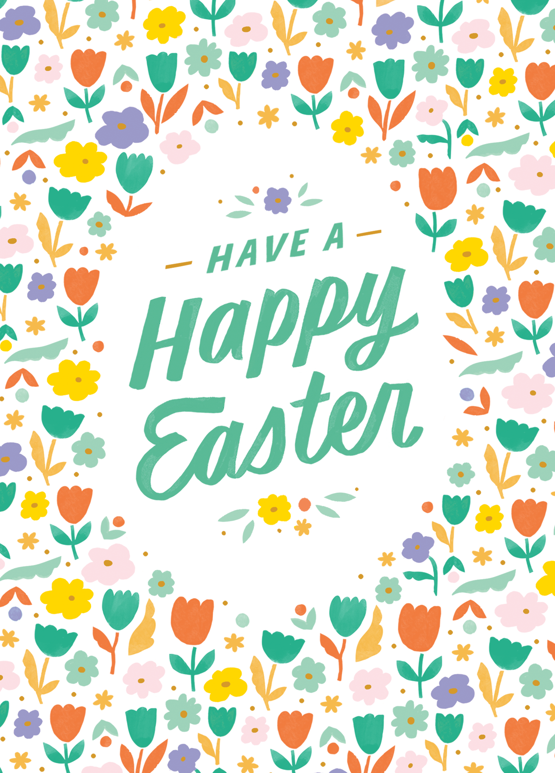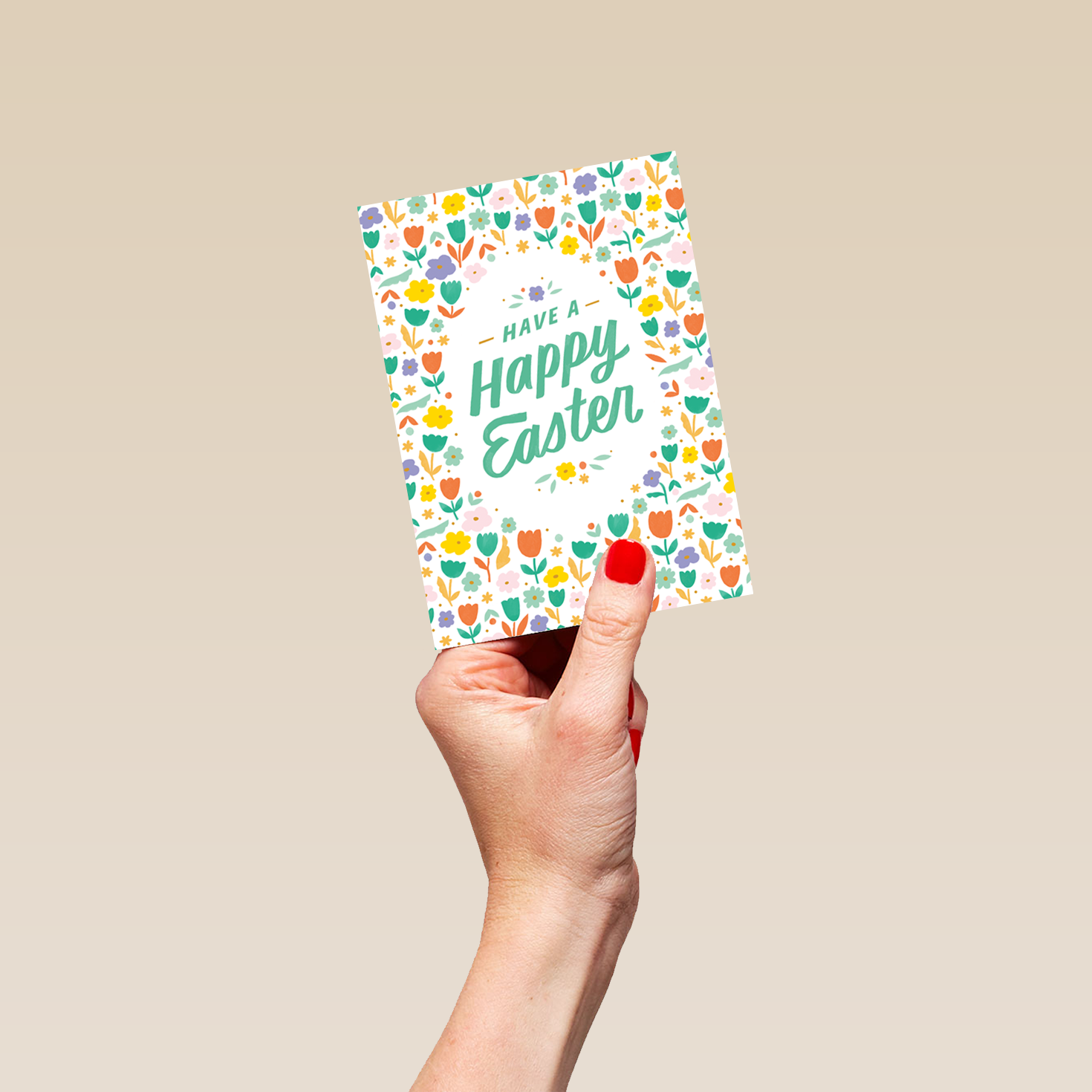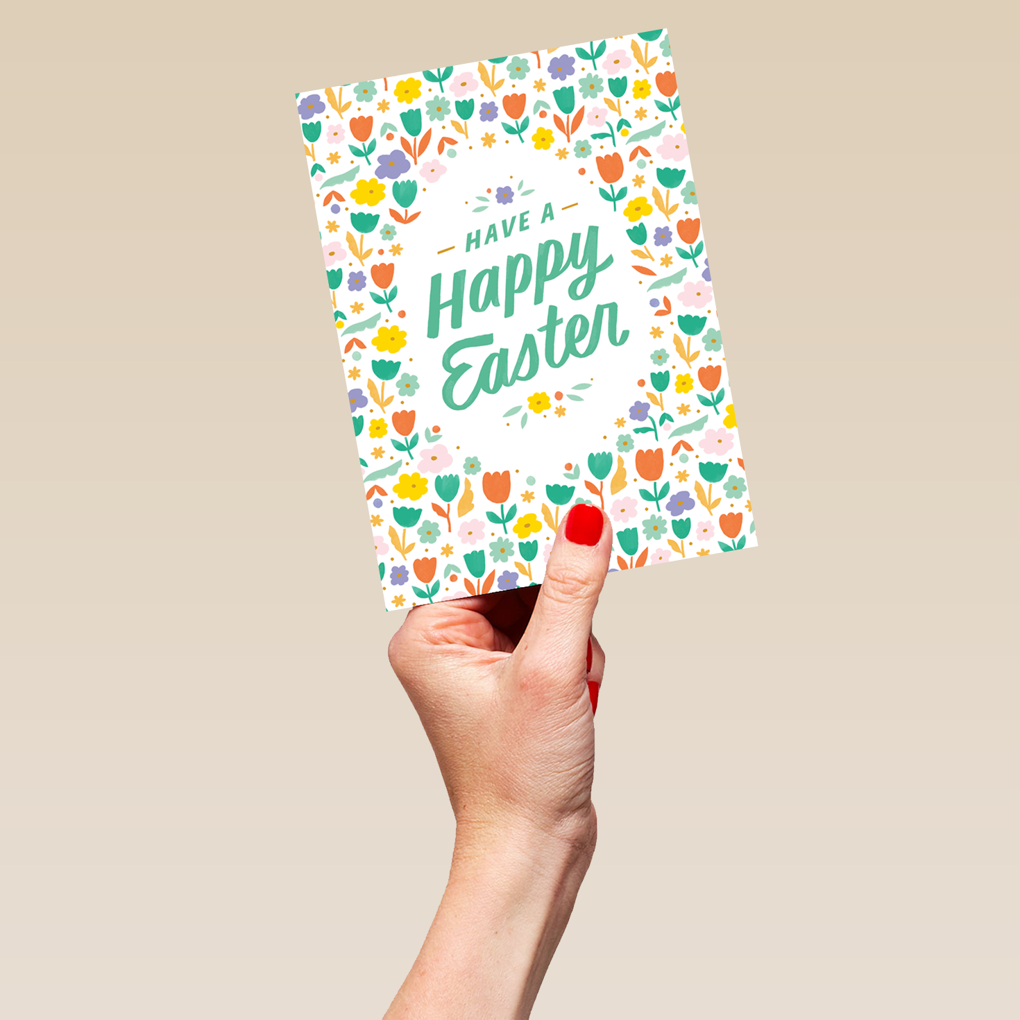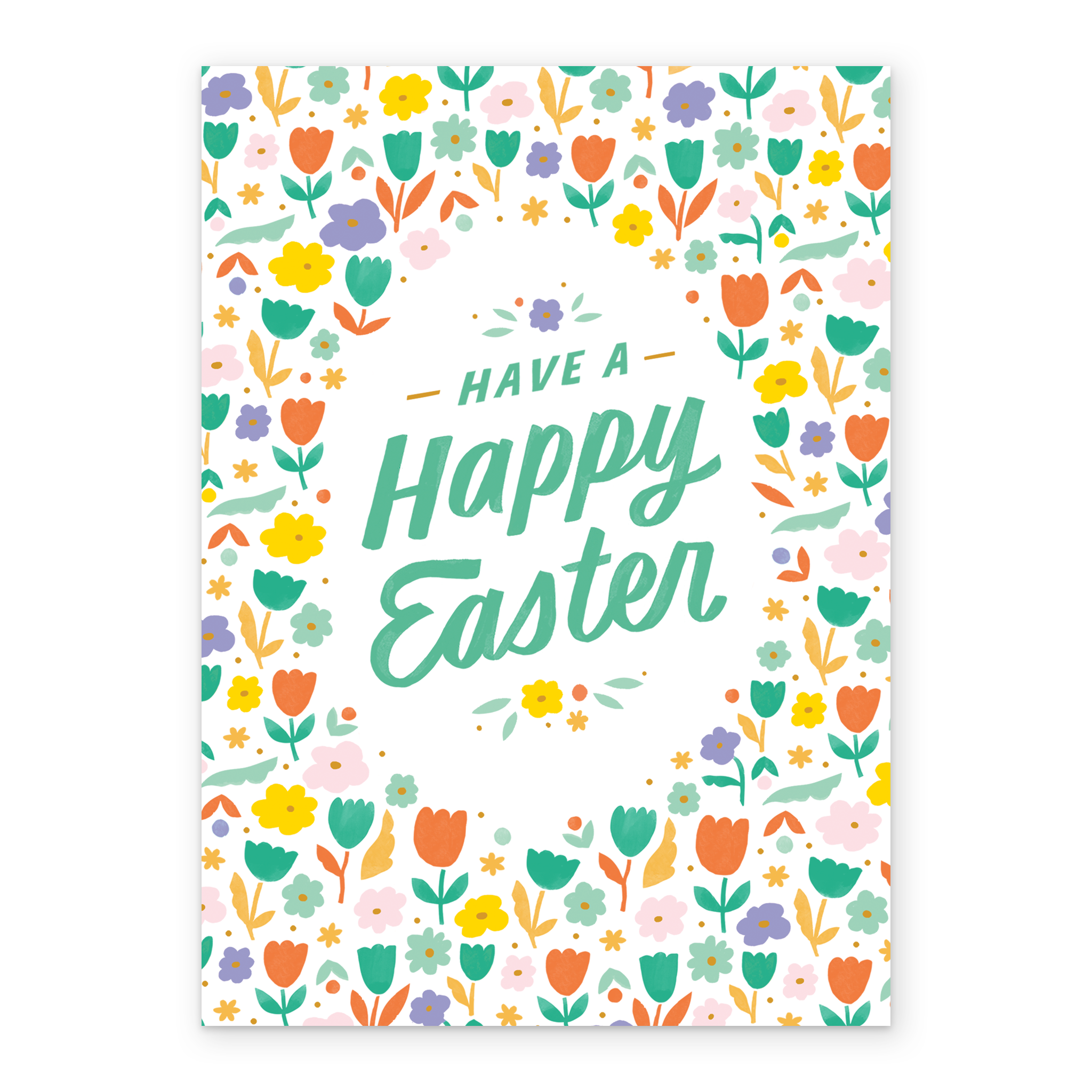Printed on premium-quality board, this card features a frame of colourful stylised flowers surrounding a white, egg-shaped central panel containing script-style turquoise lettering, with the message 'Have A Happy Easter', and comes complete with a co-ordinating white envelope.
