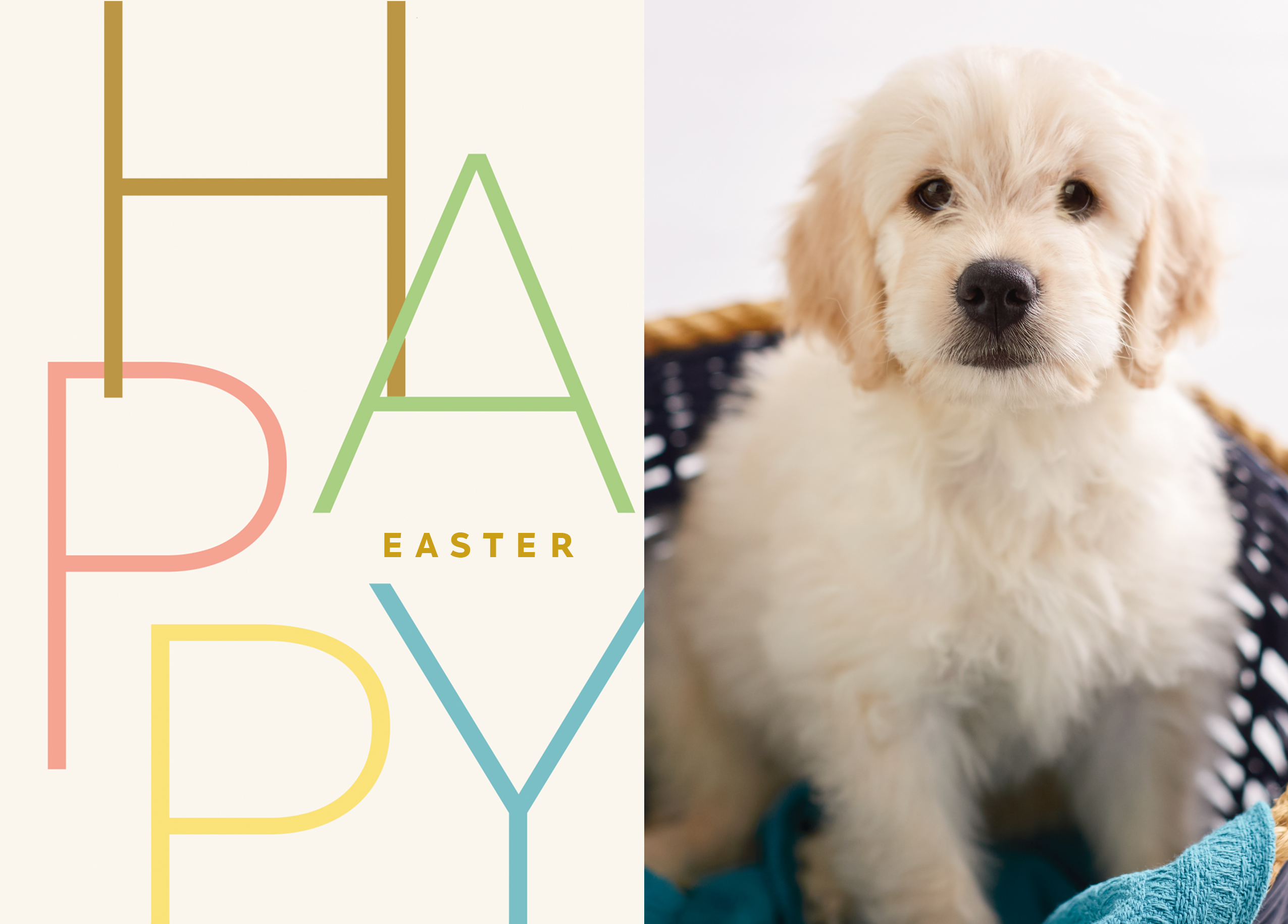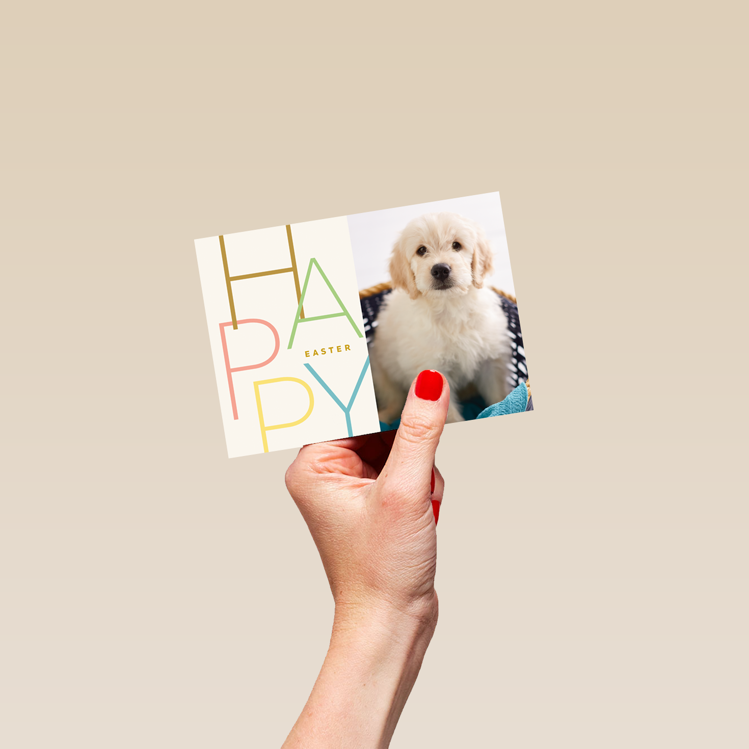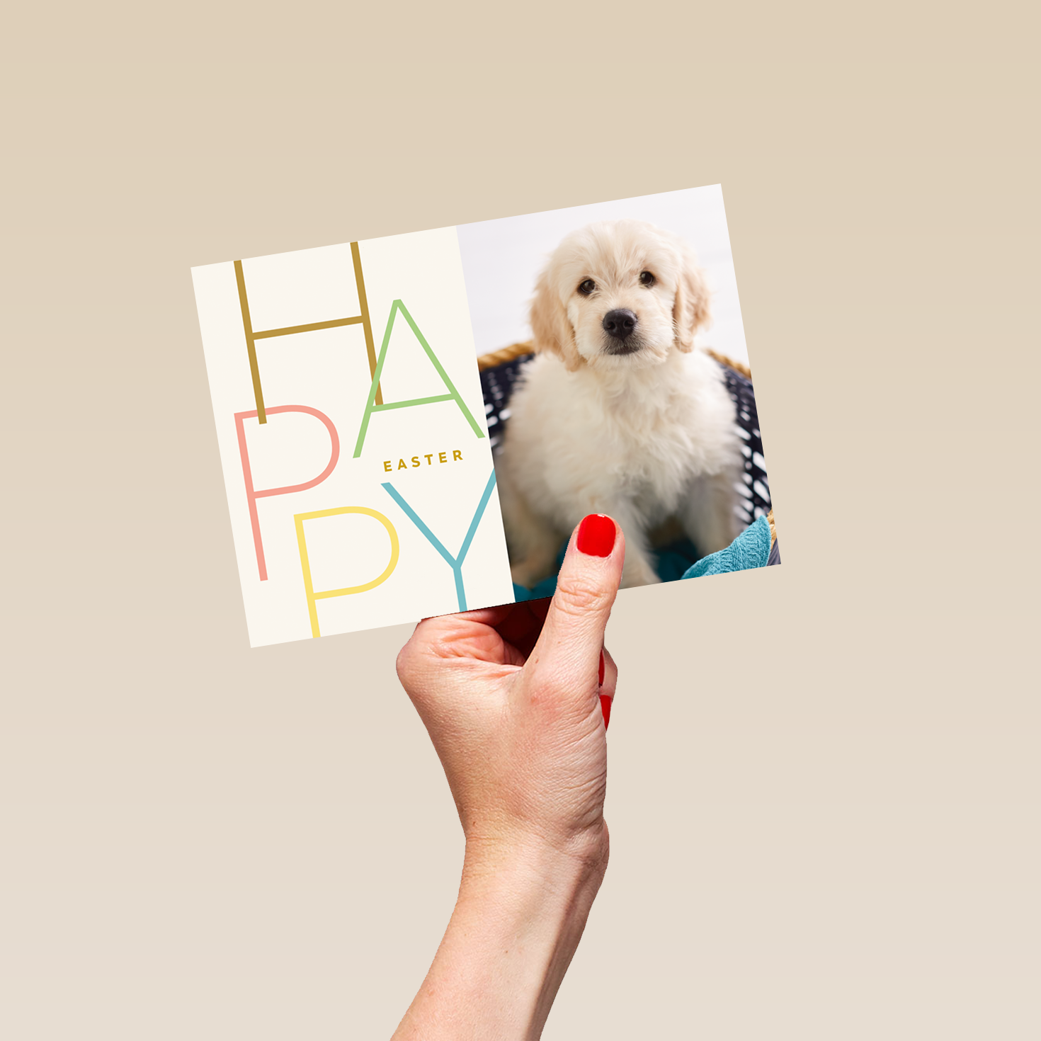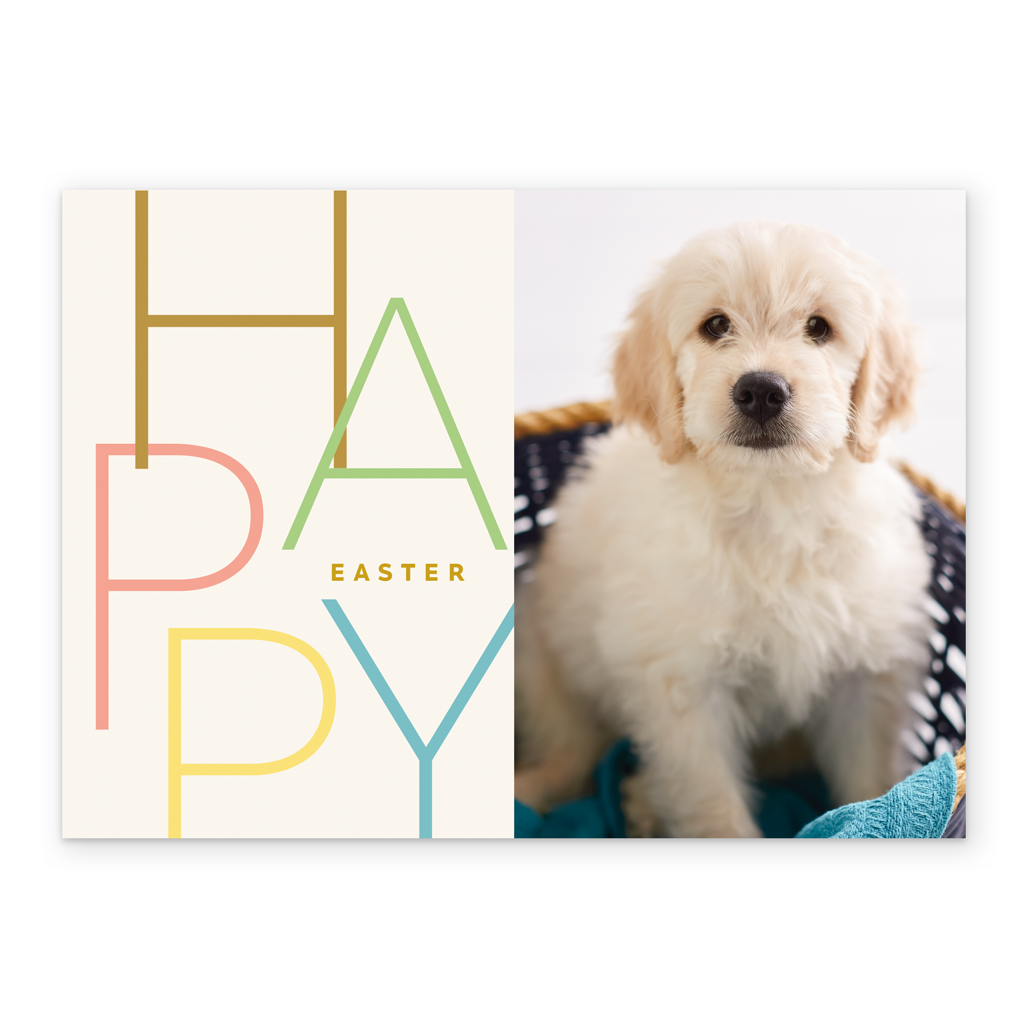 Printed on premium-quality board, this card features a colourful text-led design with randomly set multi-coloured lettering, with the message 'Happy Easter', space to upload a photo, and comes complete with a co-ordinating white envelope.