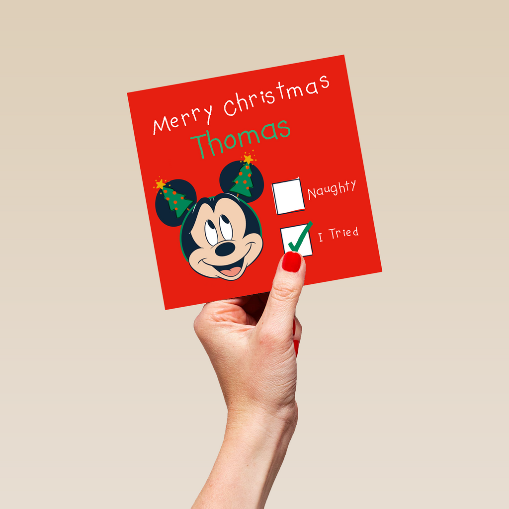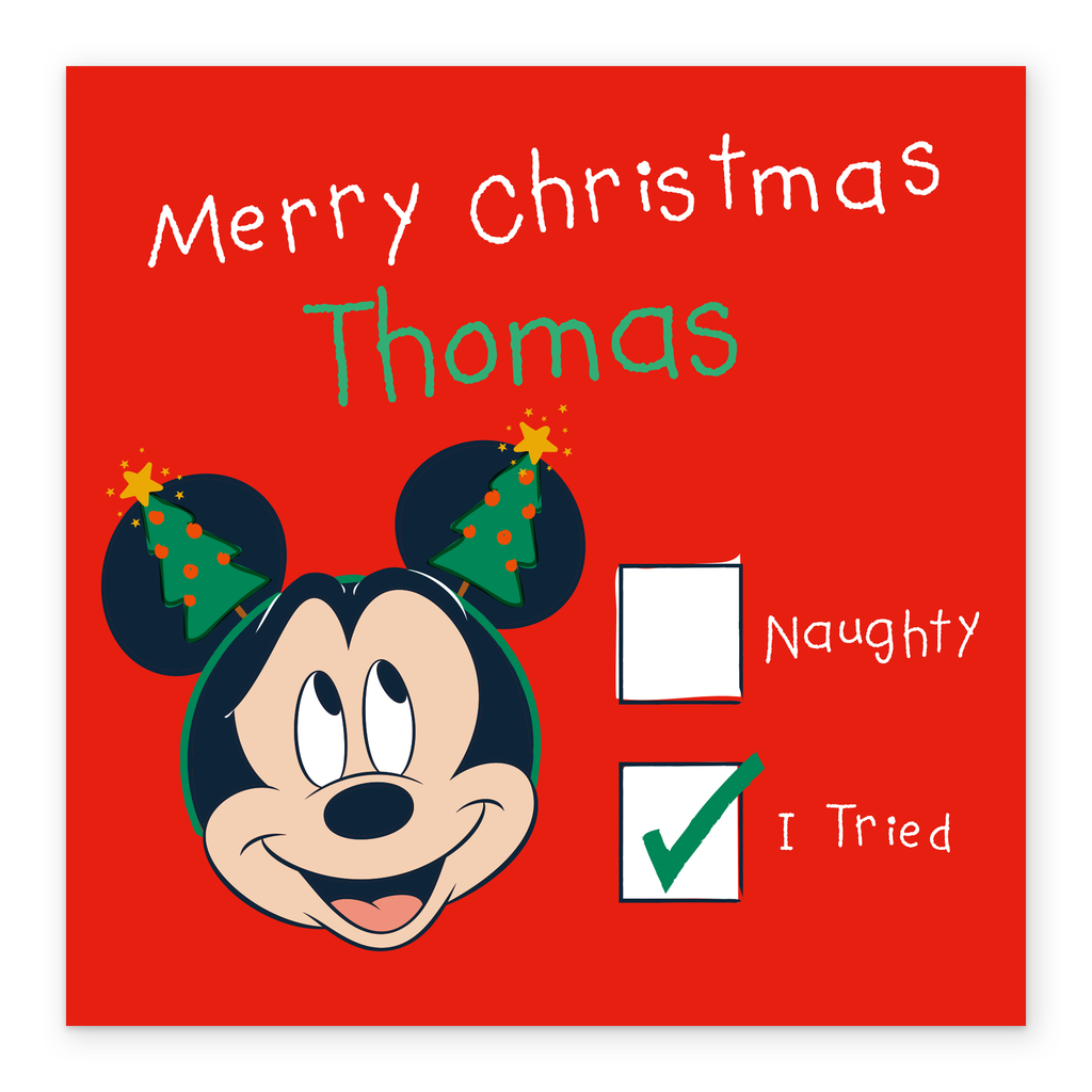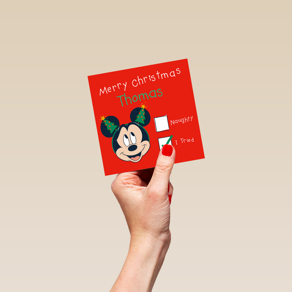 Printed on premium-quality board, this card features Mickey Mouse wearing a festive headband with a 'Naughty' or 'I Tried' tick box, with the message 'You're on the cute list!', space to personalise a name, and comes complete with a co-ordinating white envelope.