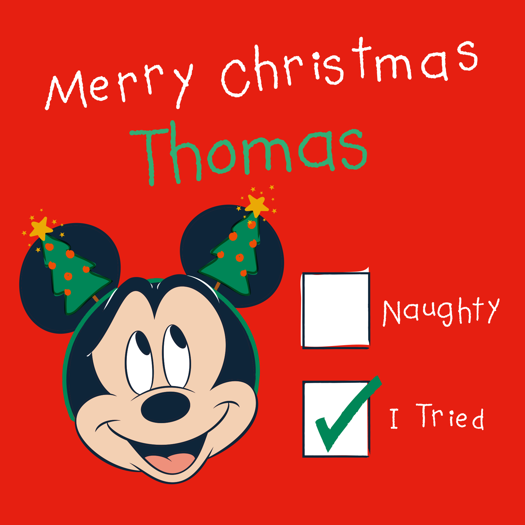 Whether they're on the Naughty or Nice list (or they at least tried!), celebrate Christmas with your mischief maker, with this fun personalised and editable Christmas card, inspired by Disney's Mickey Mouse.