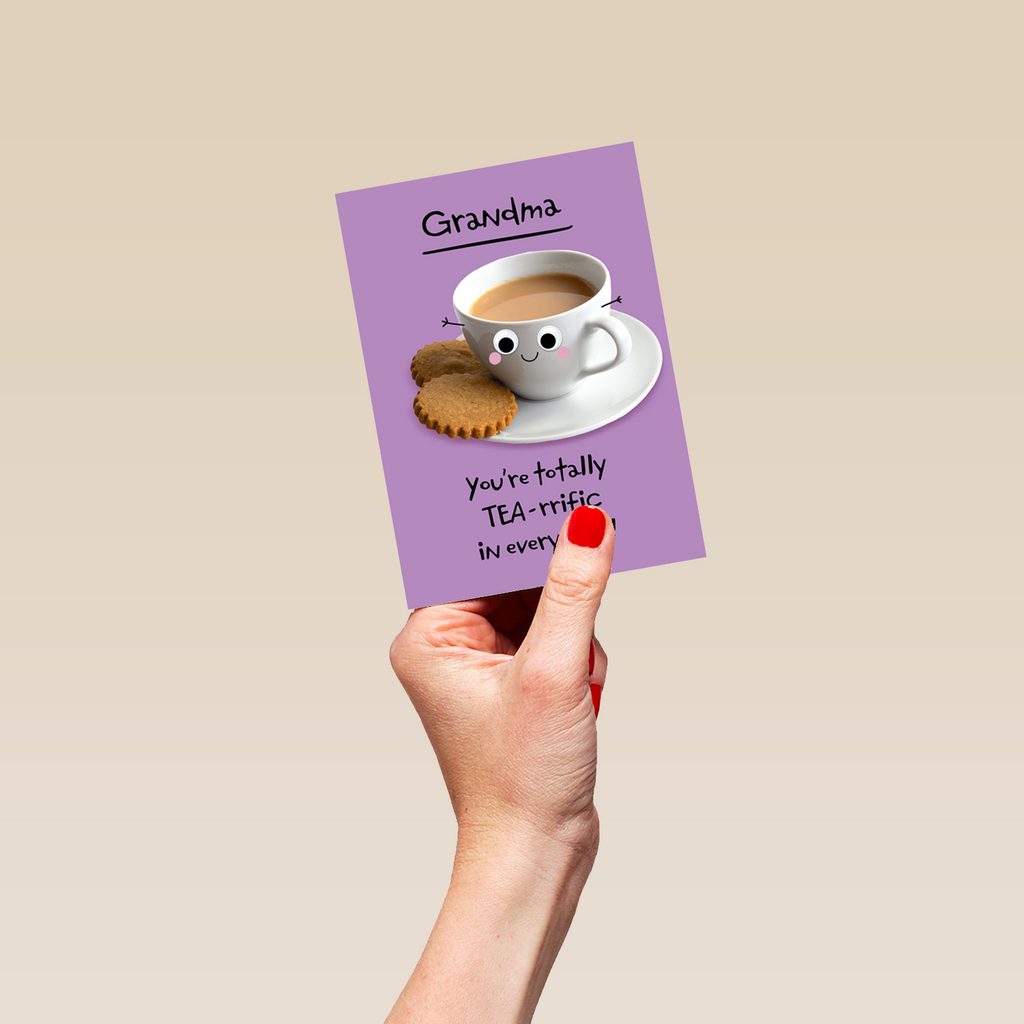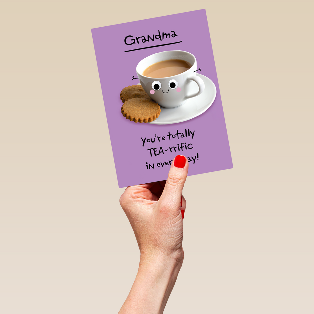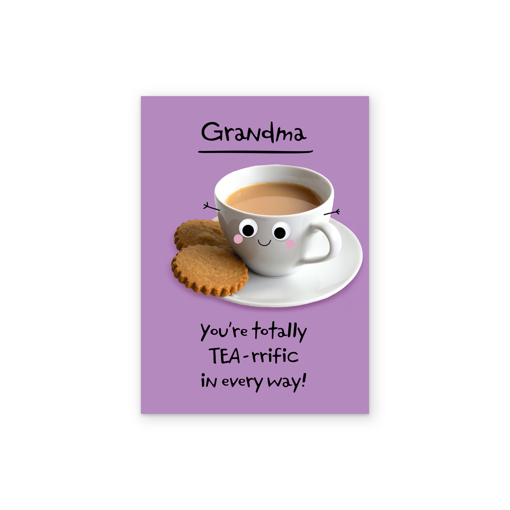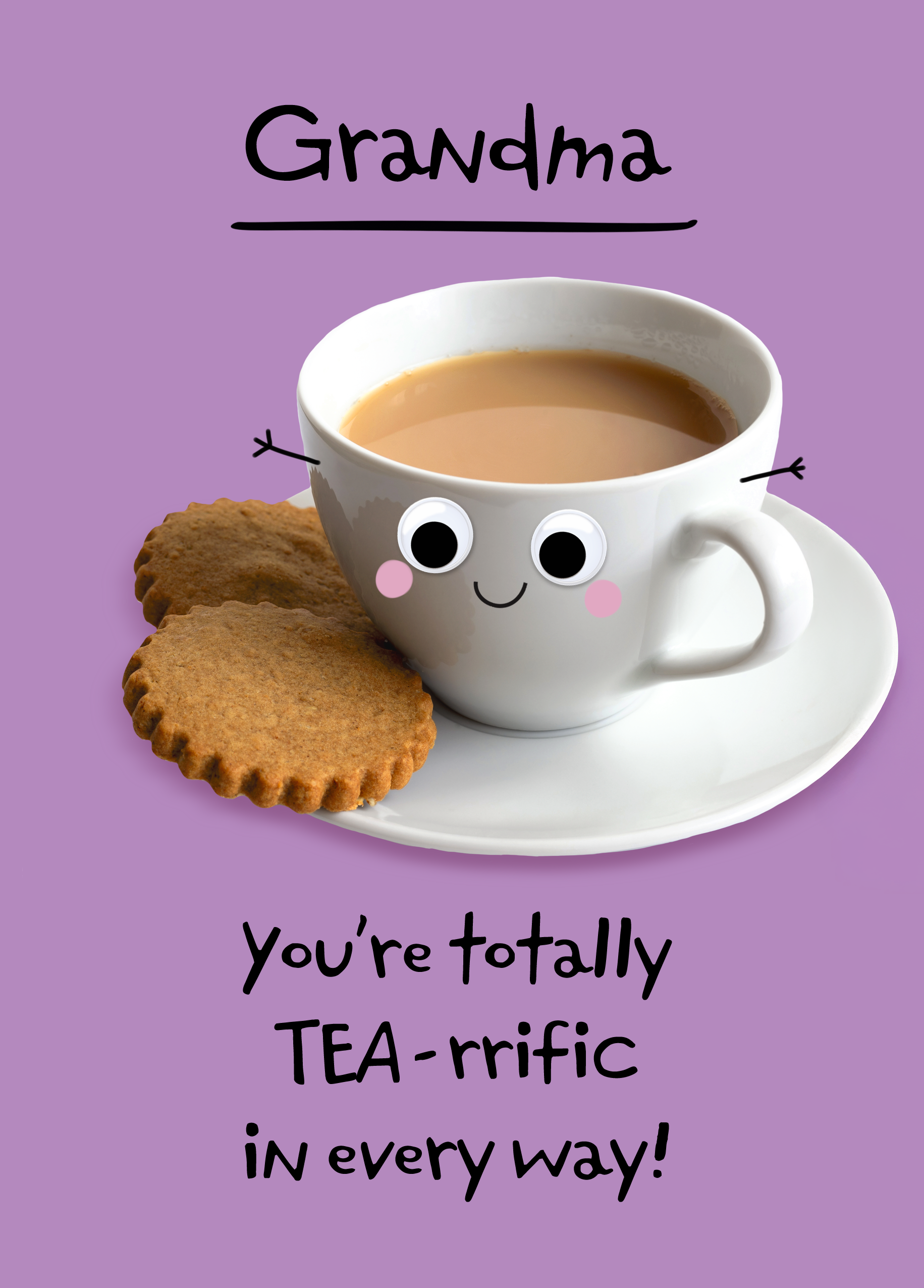 Printed on premium-quality board, this card features a photographic cup of tea, complete with biscuits and saucer, embellished with an illustrated smile, rosy pink cheeks and 'googly' eyes, set against a bright purple background with black lettering above and below the image, with the message 'Grandma you're totally TEA-riffic in every way!', space to personalise a name, and comes complete with a co-ordinating white envelope.