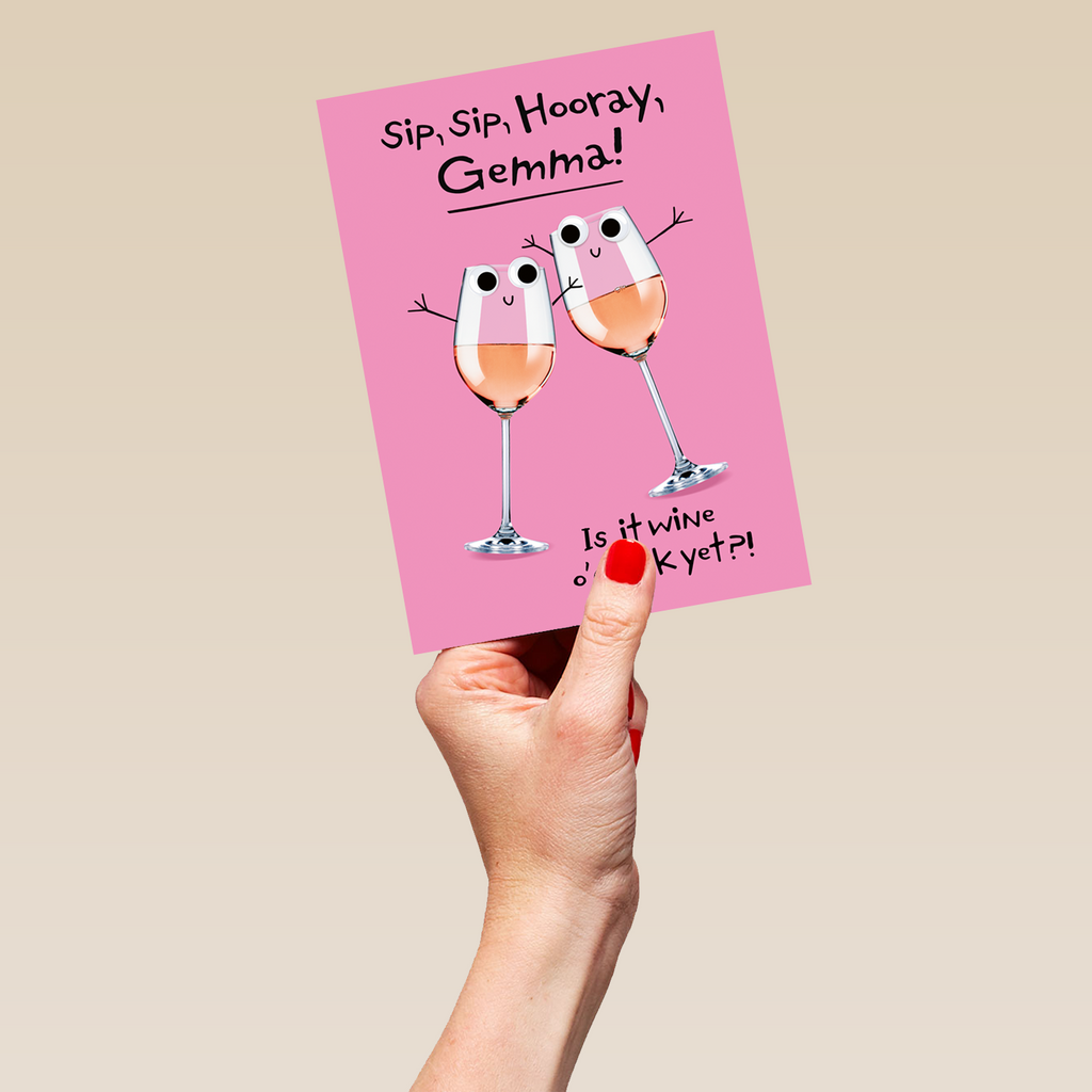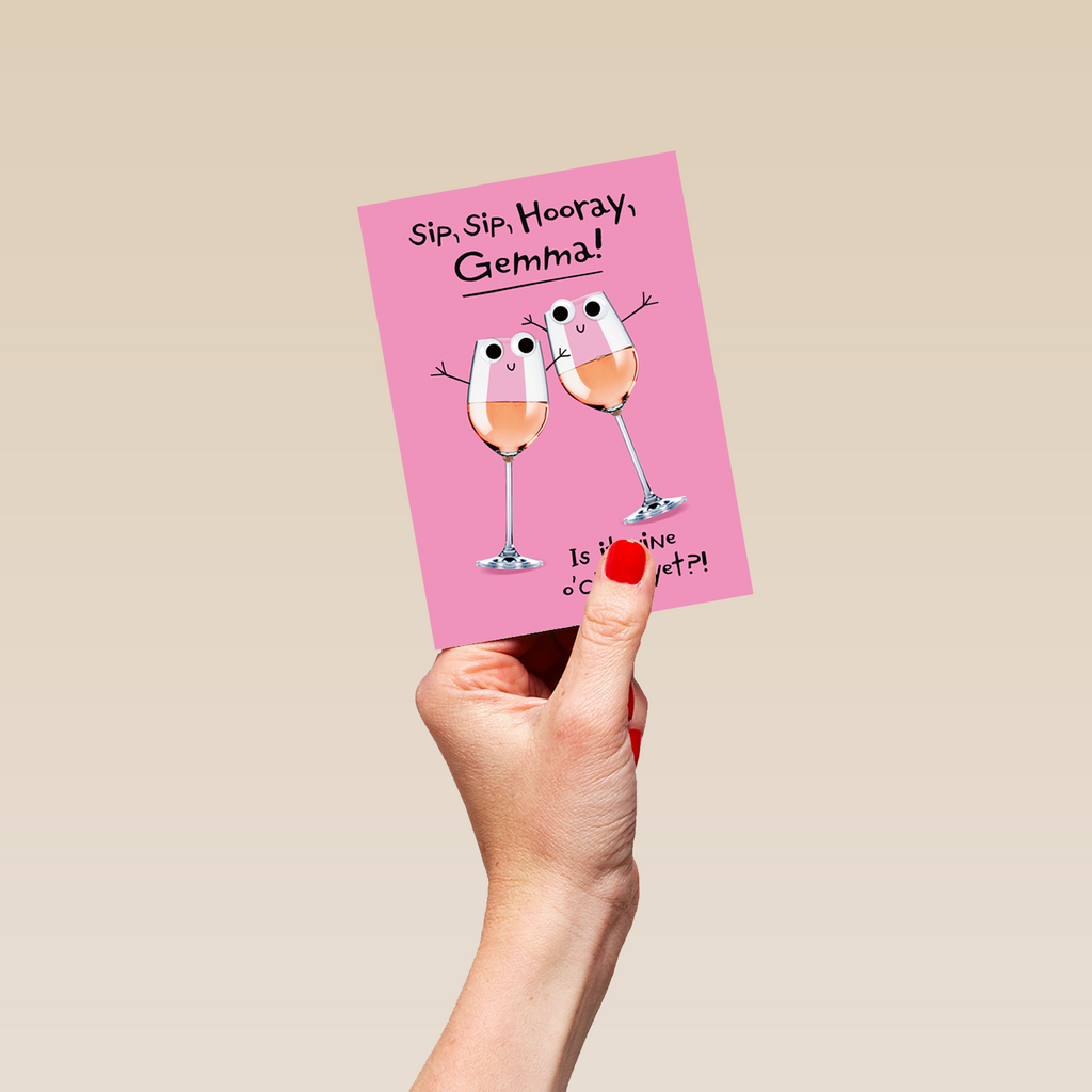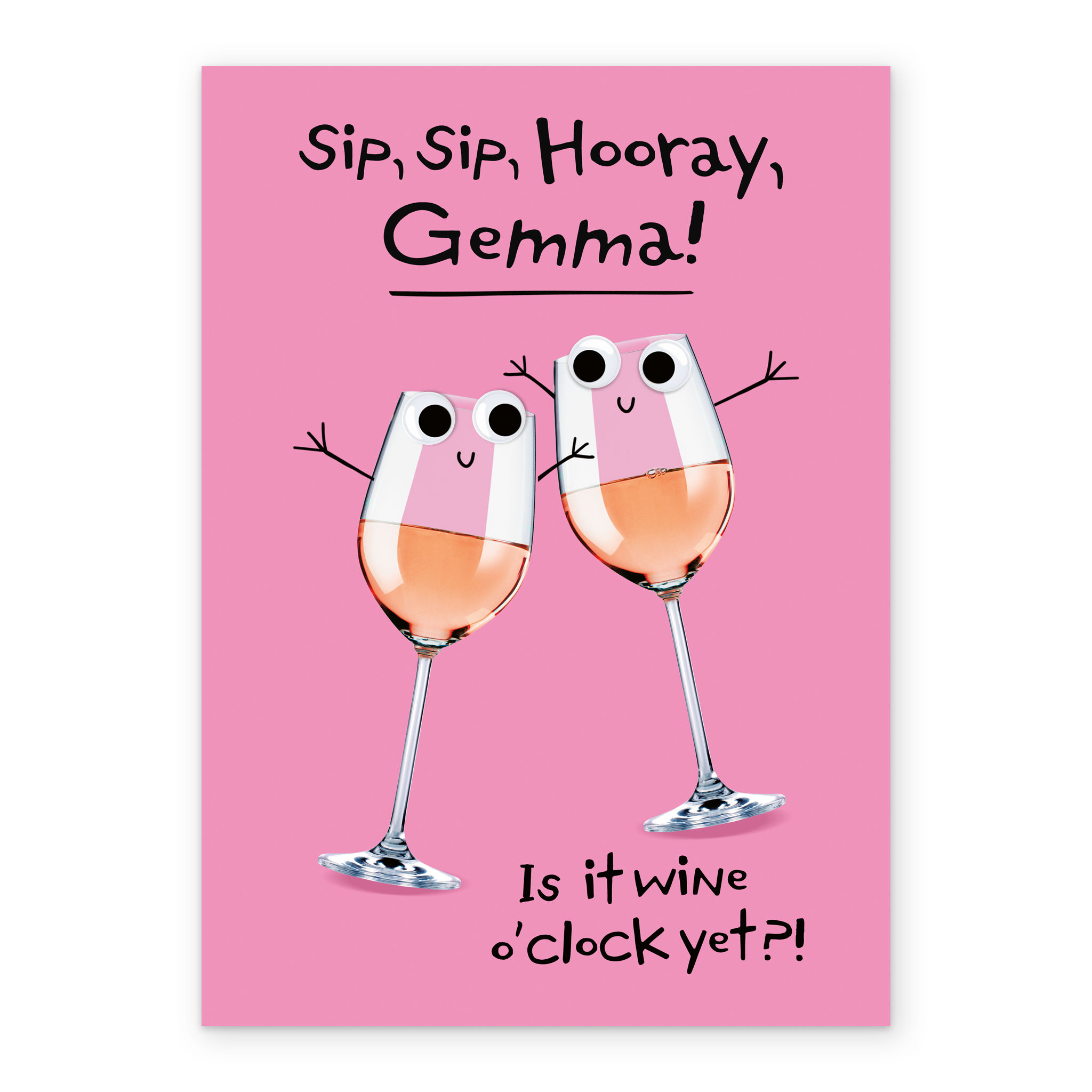 Printed on premium-quality board, this card features two photographic wine glasses, complete with rosé wine, embellished with illustrated arms, smiles and 'googly' eyes, set against a bright pink background with black lettering above and below the image, with the message 'Sip, sip hooray [NAME]! Is it wine o'clock yet?!', space to personalise a name, and comes complete with a co-ordinating white envelope.