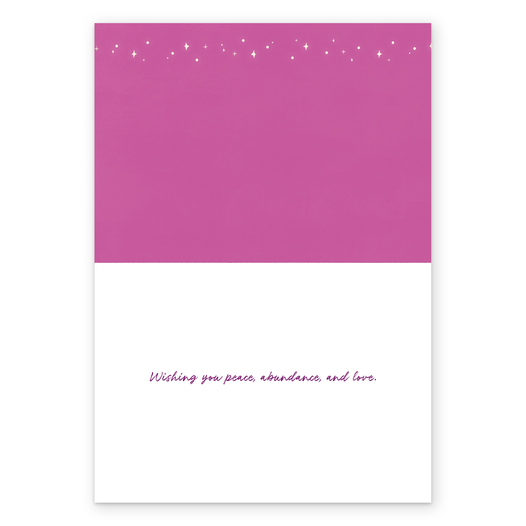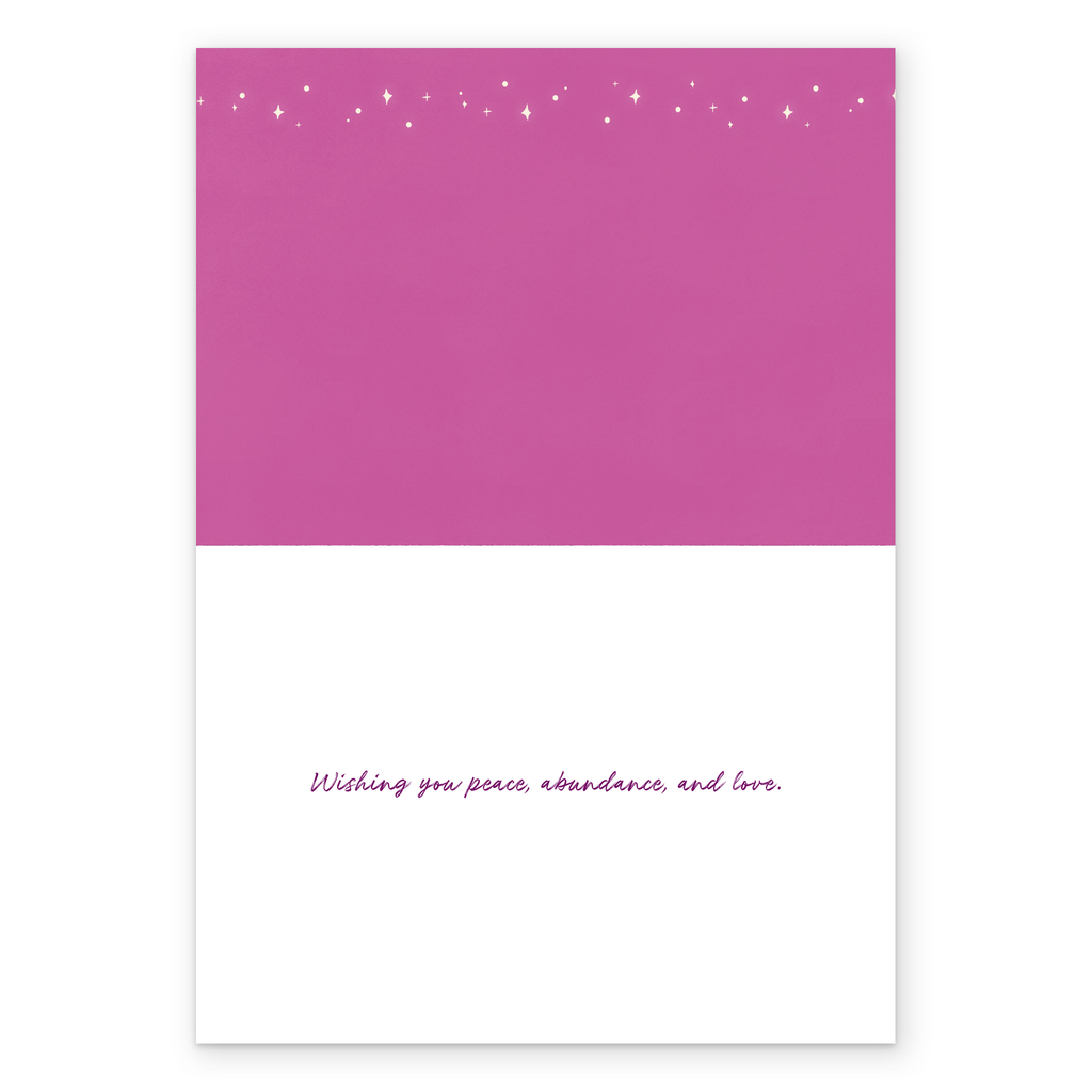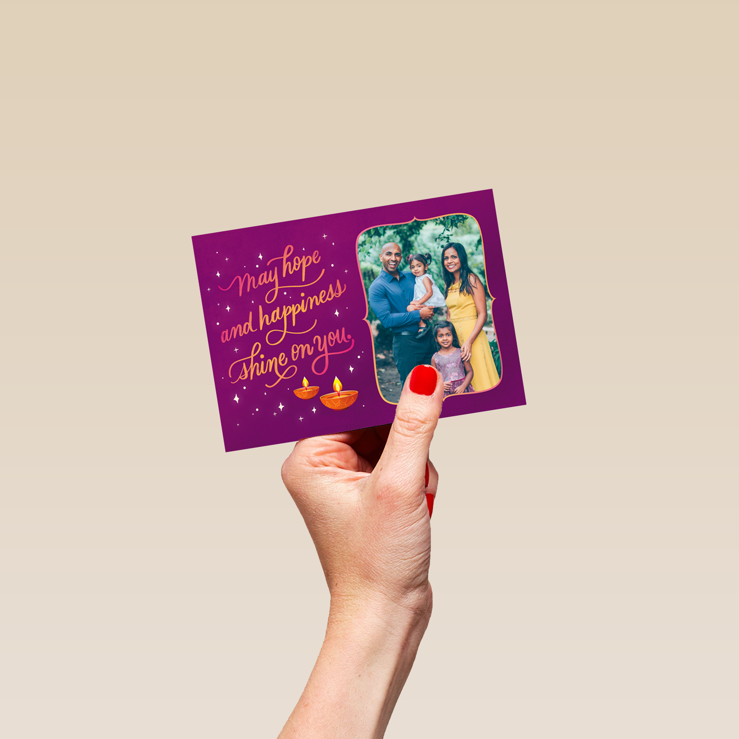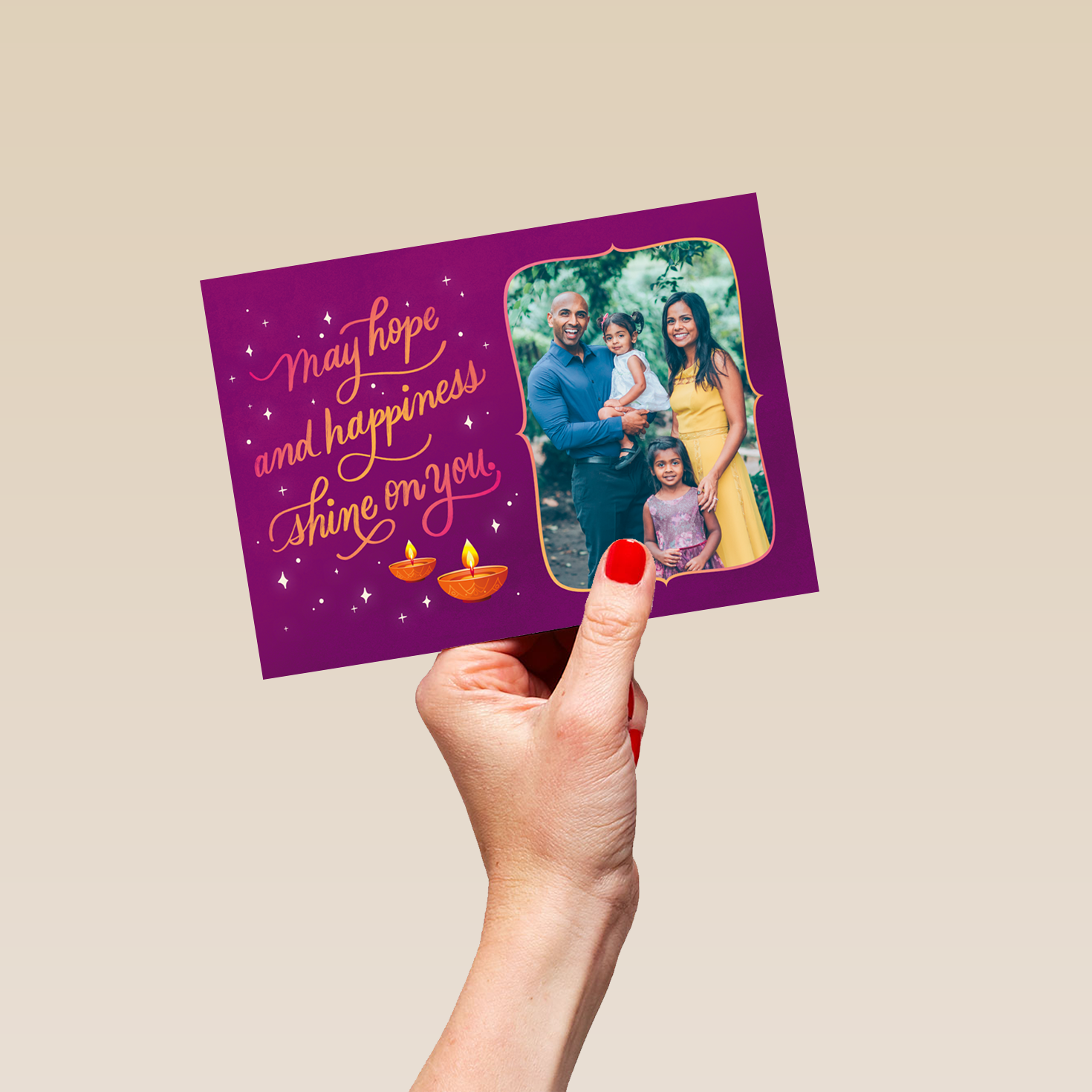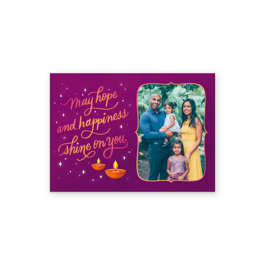 Printed on premium-quality board, this card features a delicately shaped gold frame set against a vibrant purple, 'star dusted' background alongside illustrations of Diyas and ombre effect orange/yellow/pink script-style lettering, with the message 'May hope and happiness shine on you.', space to upload a photo, and comes complete with a co-ordinating white envelope.