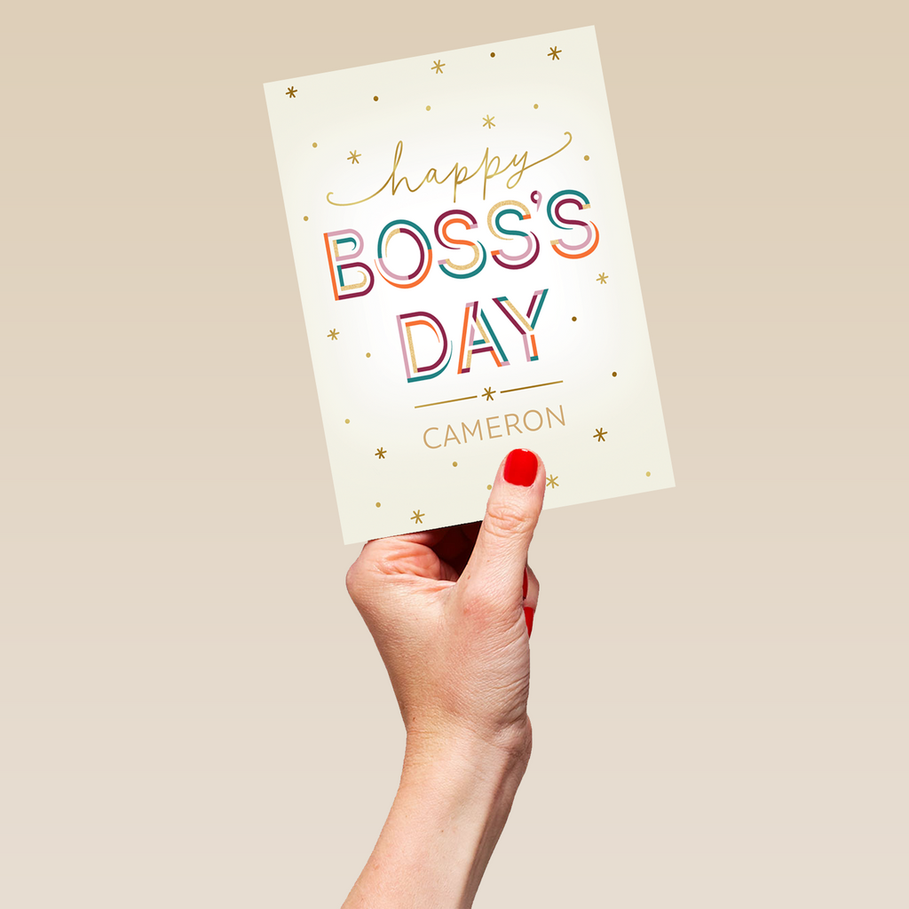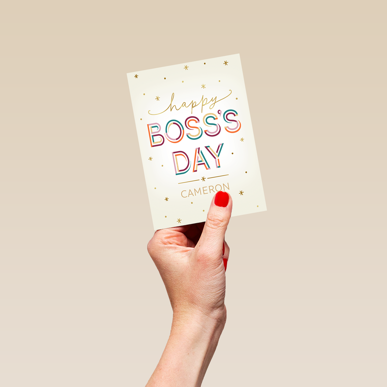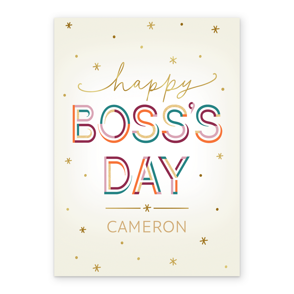 Printed on premium-quality board, this card features an off white background dotted with gold star shapes surrounding stylish multi-coloured, outline style, lettering, with the message 'happy Boss's Day [NAME]', space to personalise a name, and comes complete with a co-ordinating white envelope.