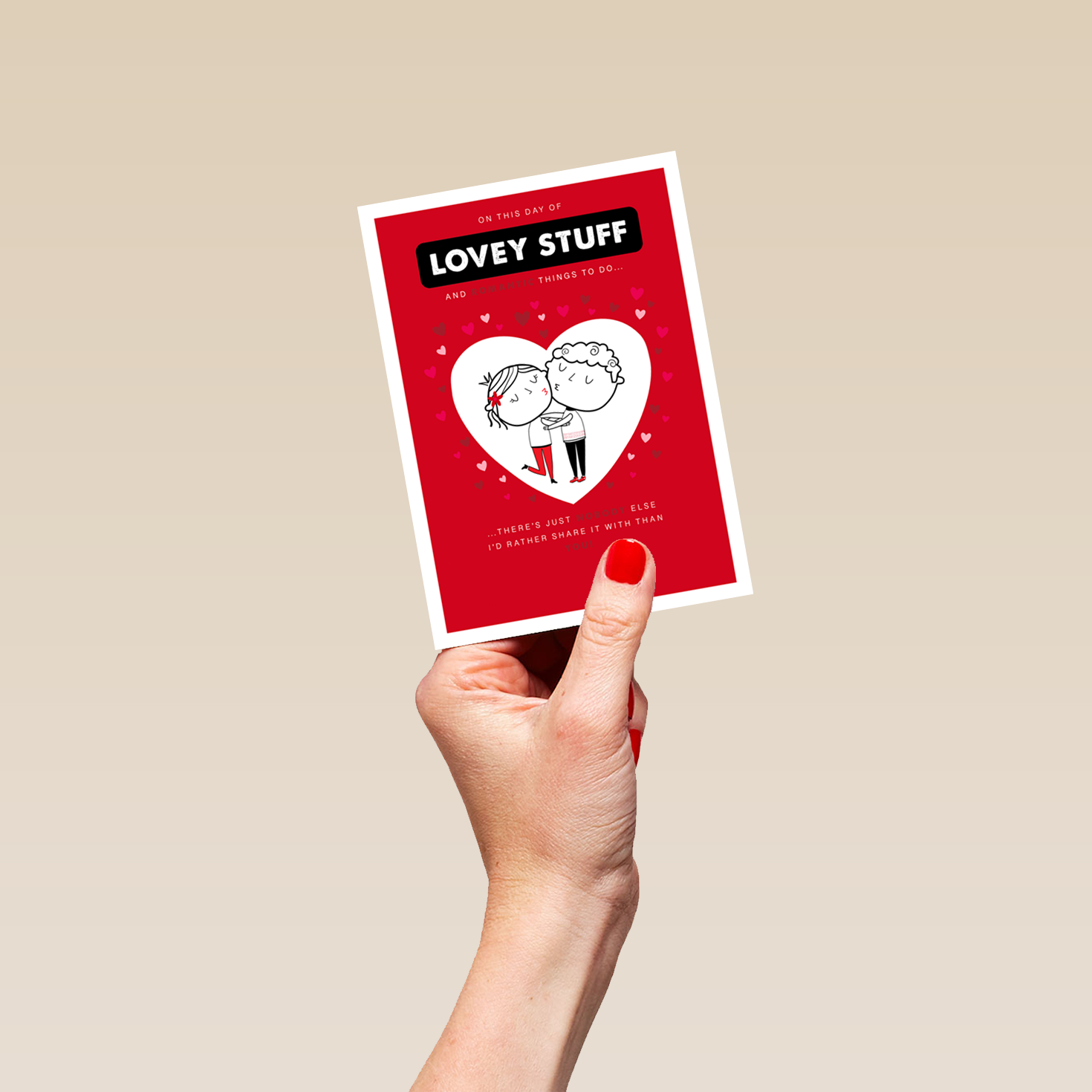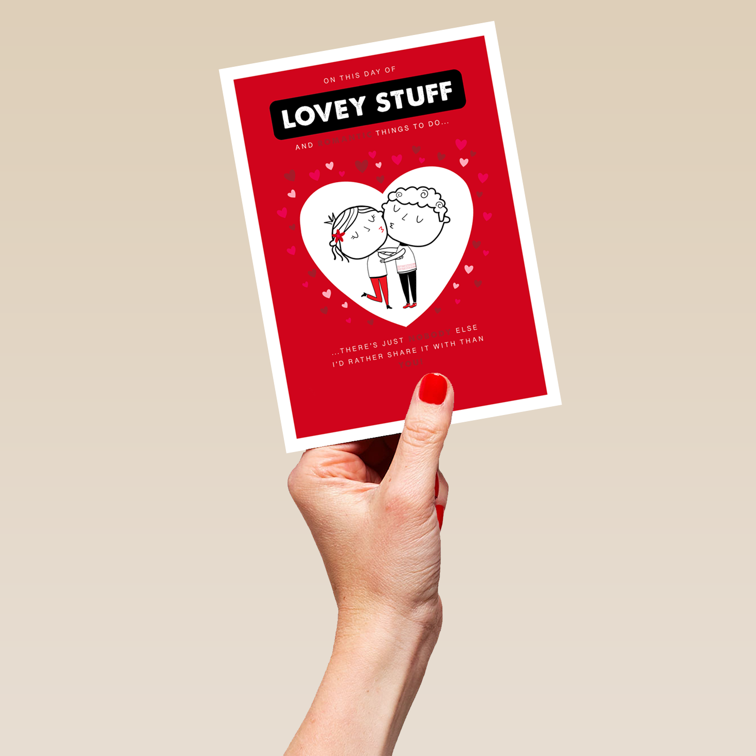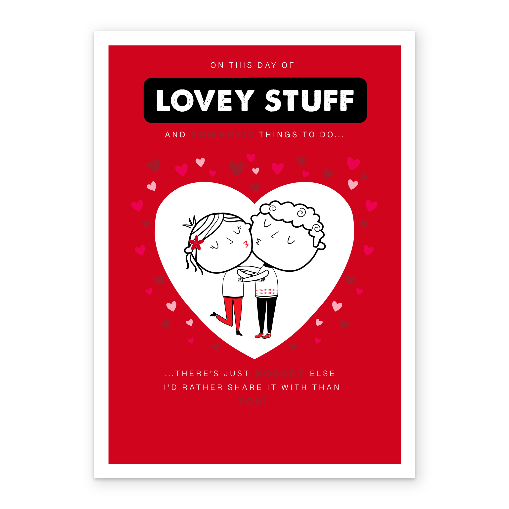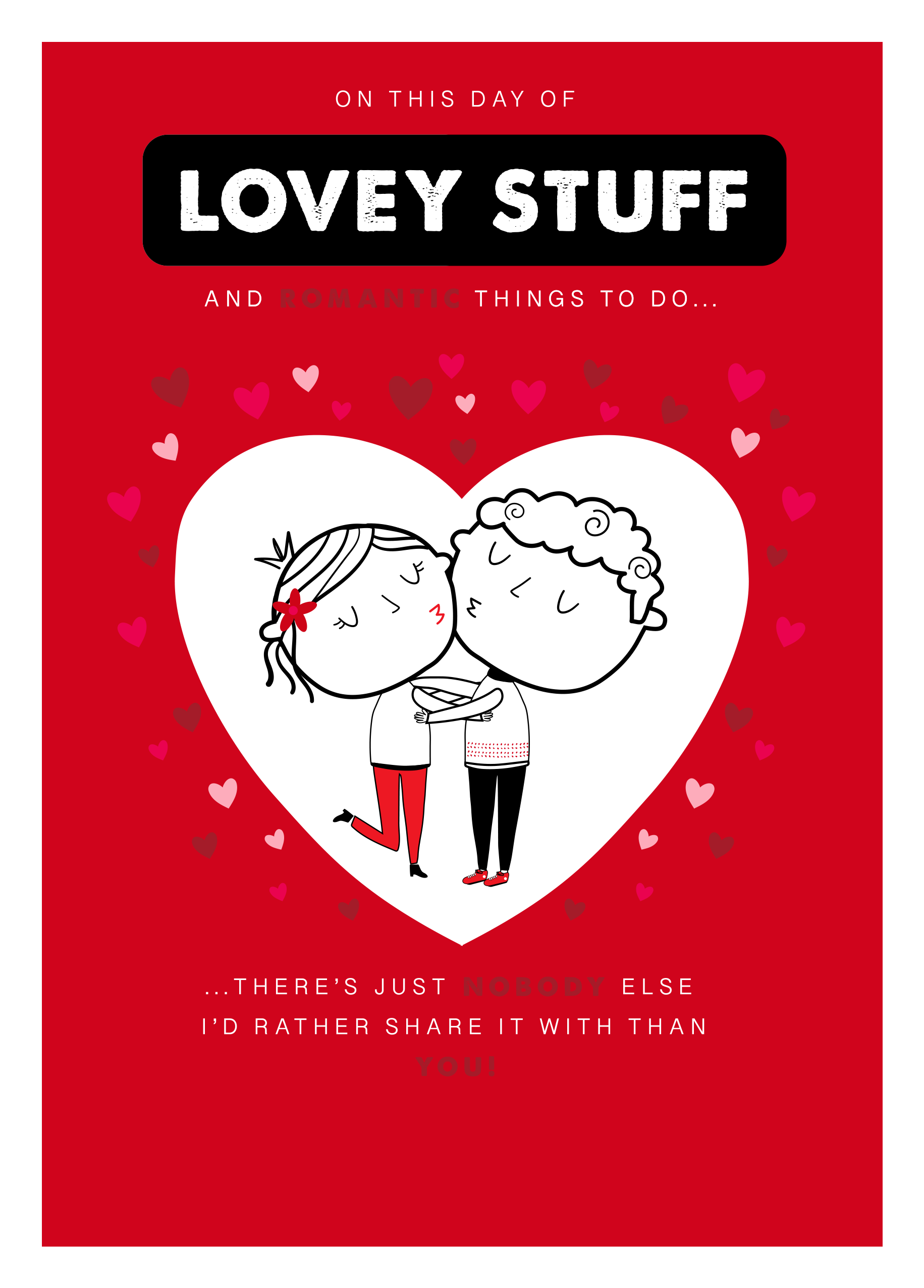 Printed on premium-quality board, this card features a cute cartoon couple cuddling, framed by a large heart shape on a red background with small red and white hearts around the edge and white lettering, with the message 'On this day of lovey stuff and romantic things to do, there's just nobody else I'd rather share it with than you!', and comes complete with a co-ordinating white envelope.