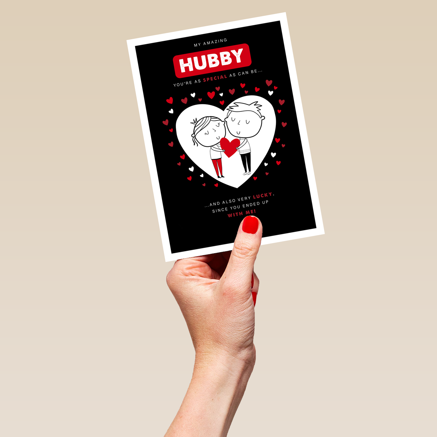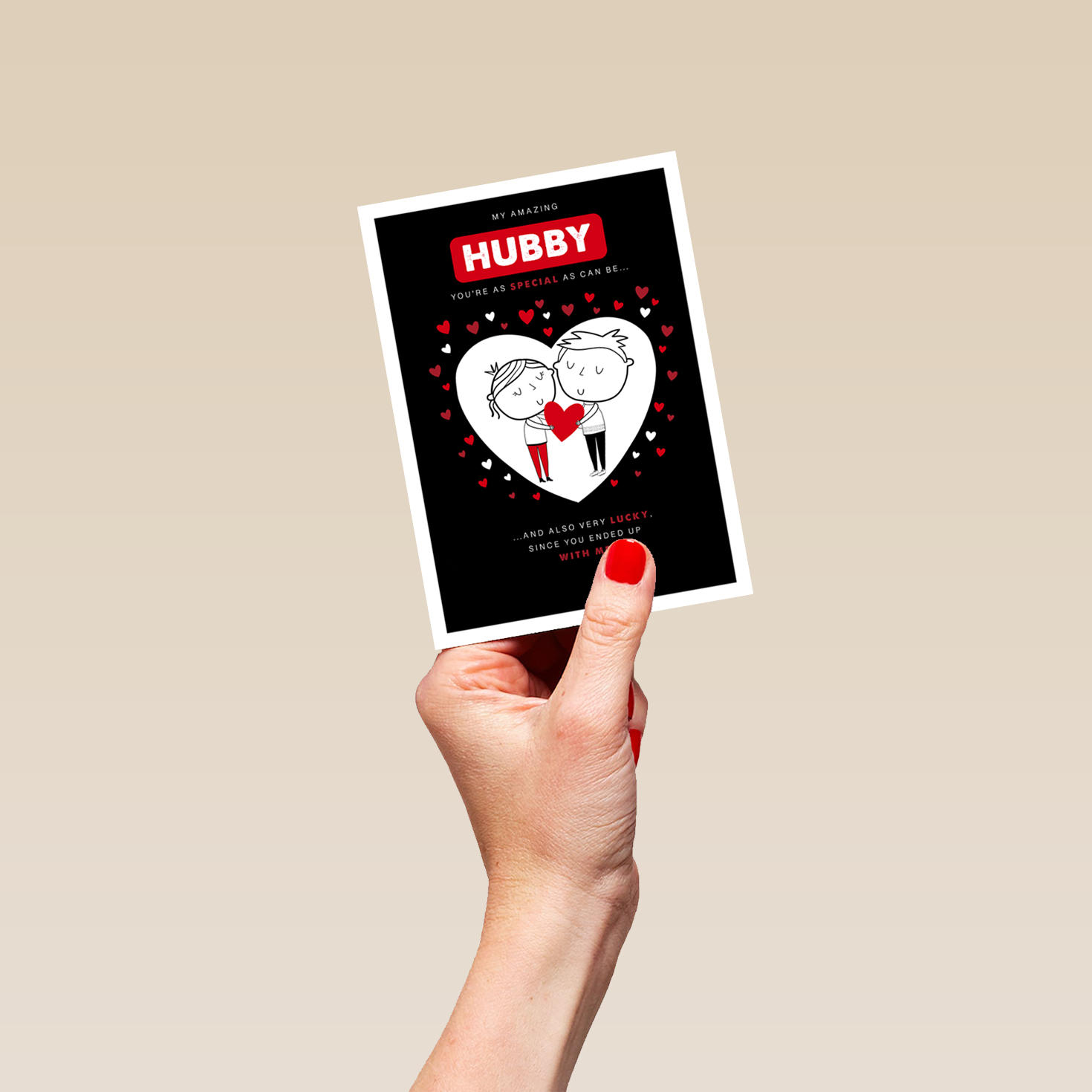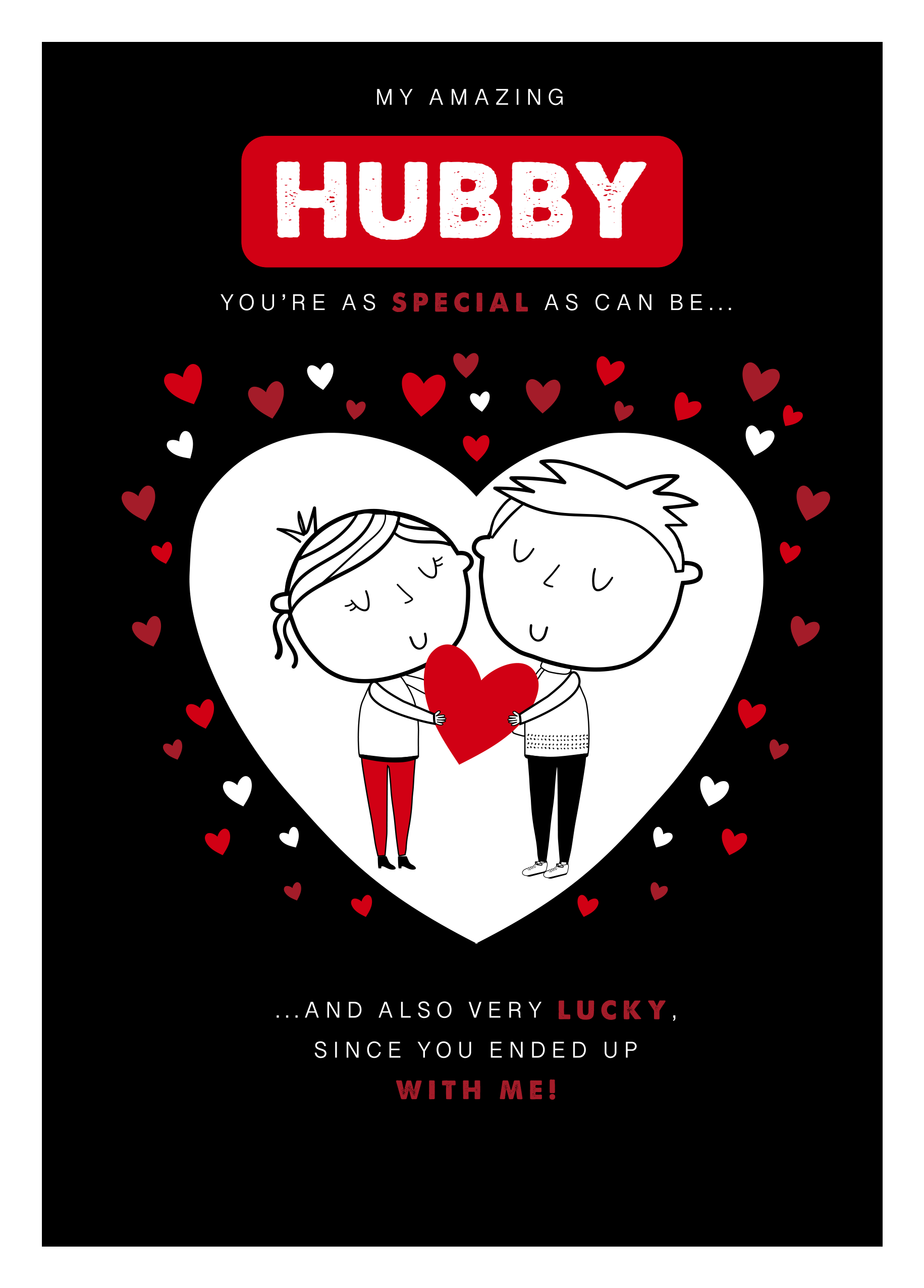 Printed on premium-quality board, this card features a cute cartoon couple holding a red heart and framed by a large heart shape on a black background, with small red and white hearts around the edge, and red and white lettering, with the message 'My amazing HUBBY you're as special as can be... and also very lucky, since you ended up with me!', and comes complete with a co-ordinating white envelope.