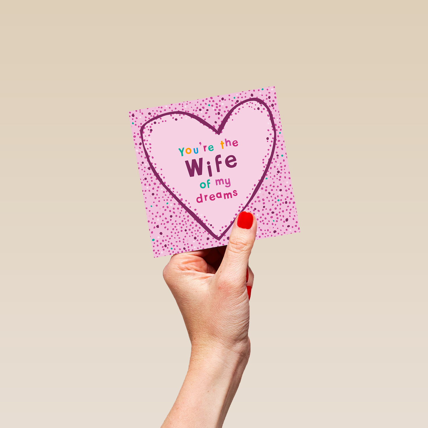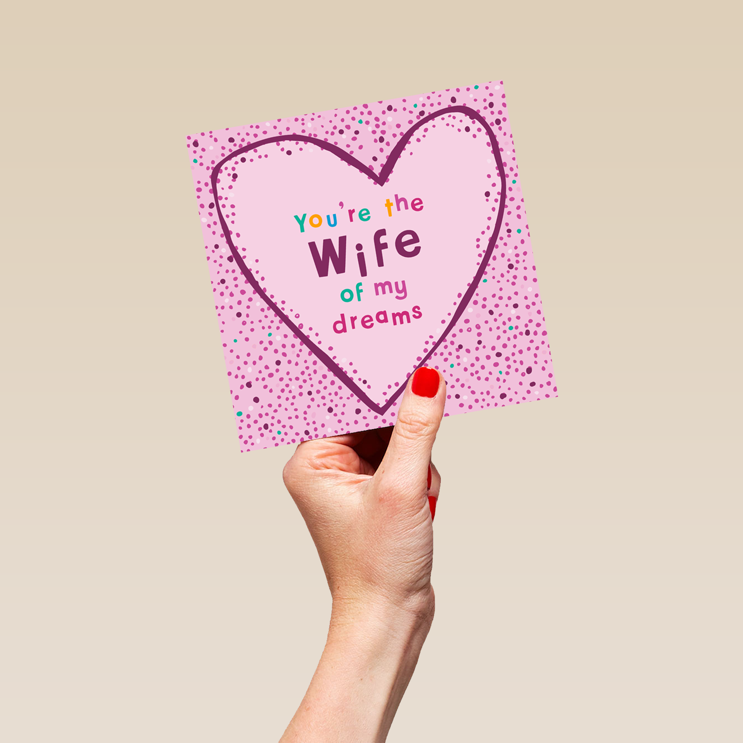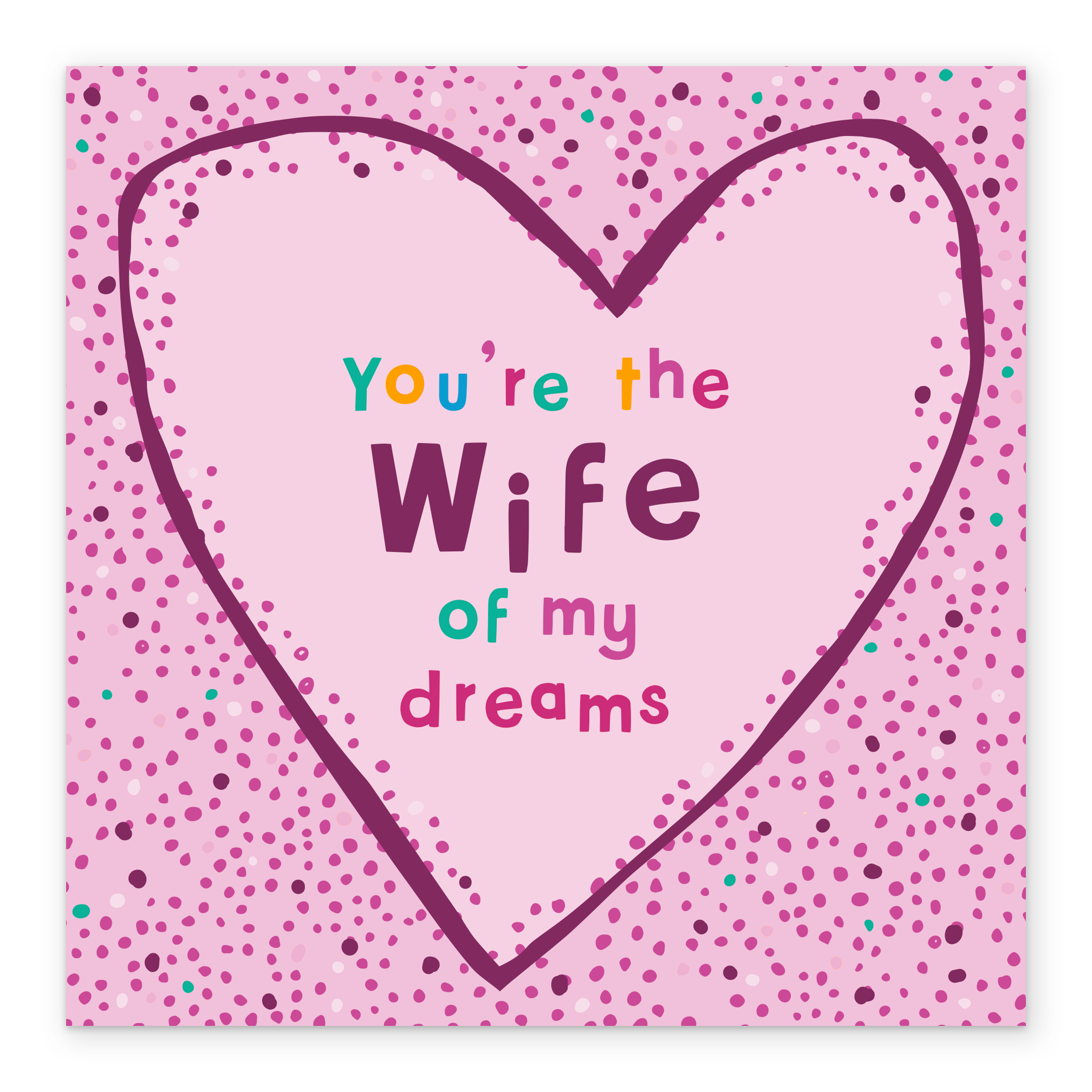 Printed on premium-quality board, this card features a pink and purple speckled background with a purple outline heart shape surrounding purple and multi-coloured lettering, with the message 'You're the wife of my dreams', and comes complete with a co-ordinating white envelope.
