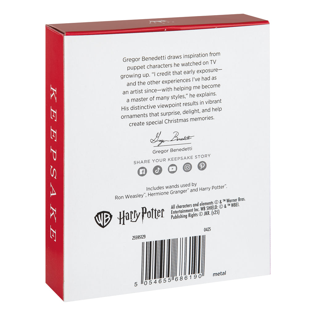 This pack of 3 hanging ornaments are made from premium painted metal and feature exquisite details of Harry Potter's, Ron Weasley's and Hermione Granger's wands from the Harry Potter™ series.