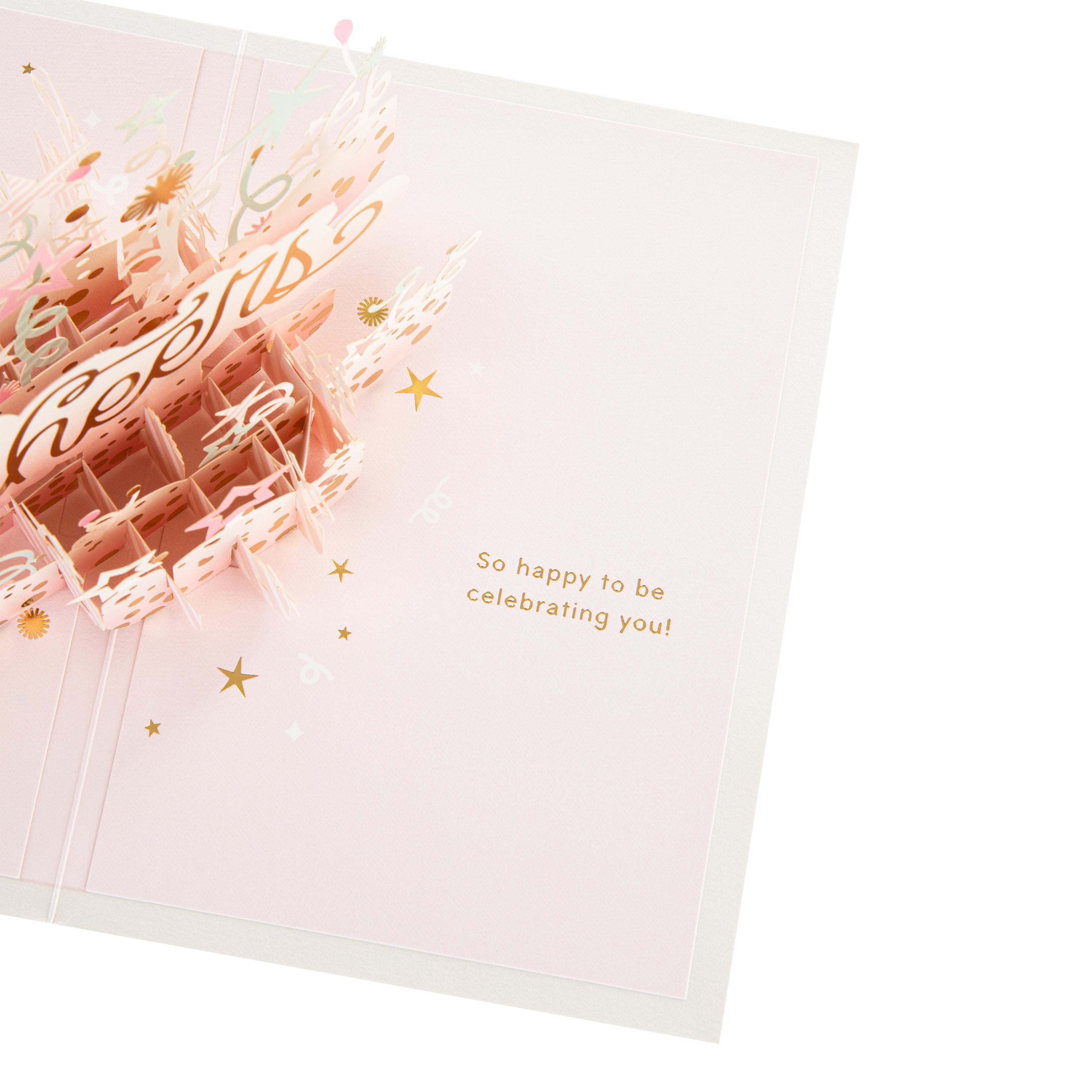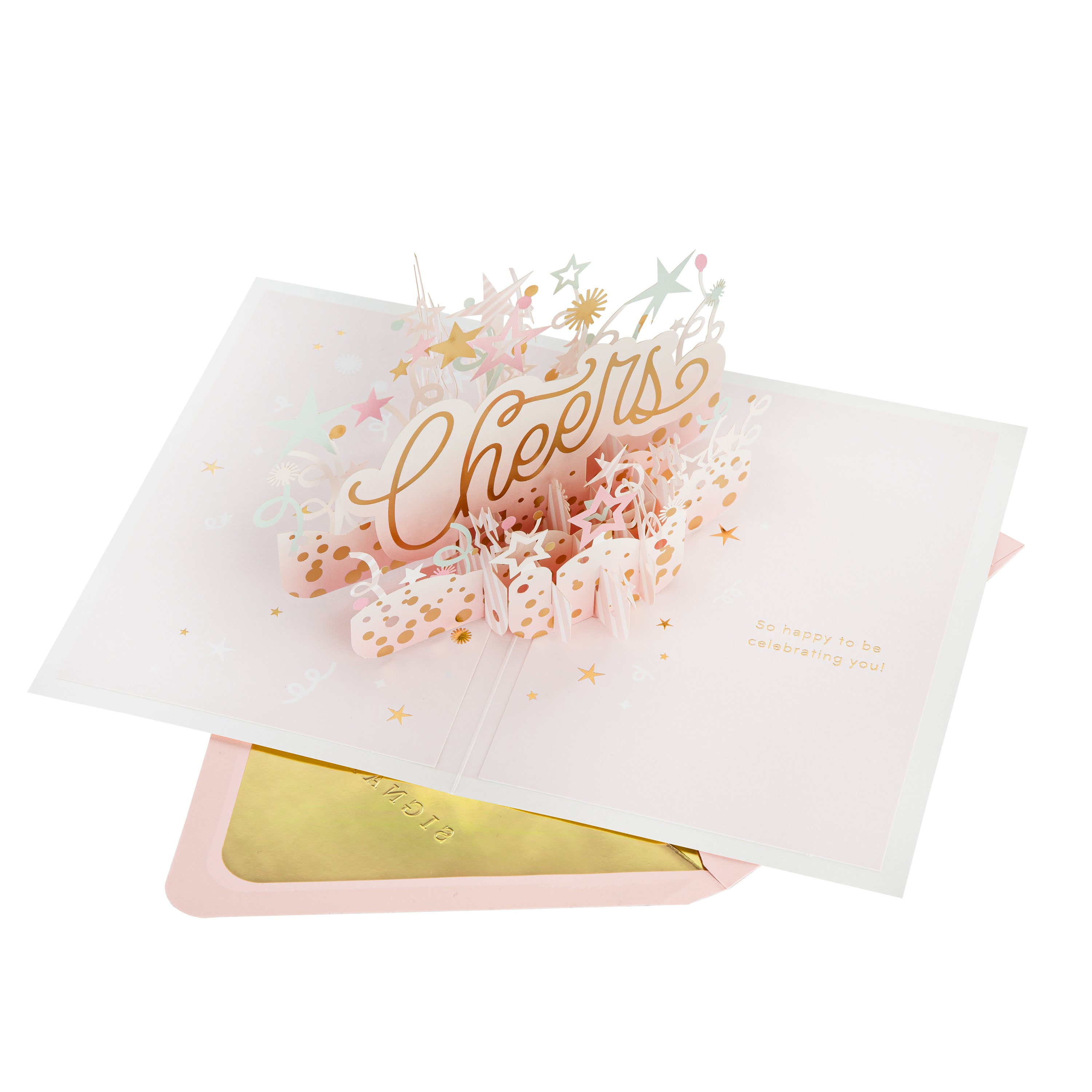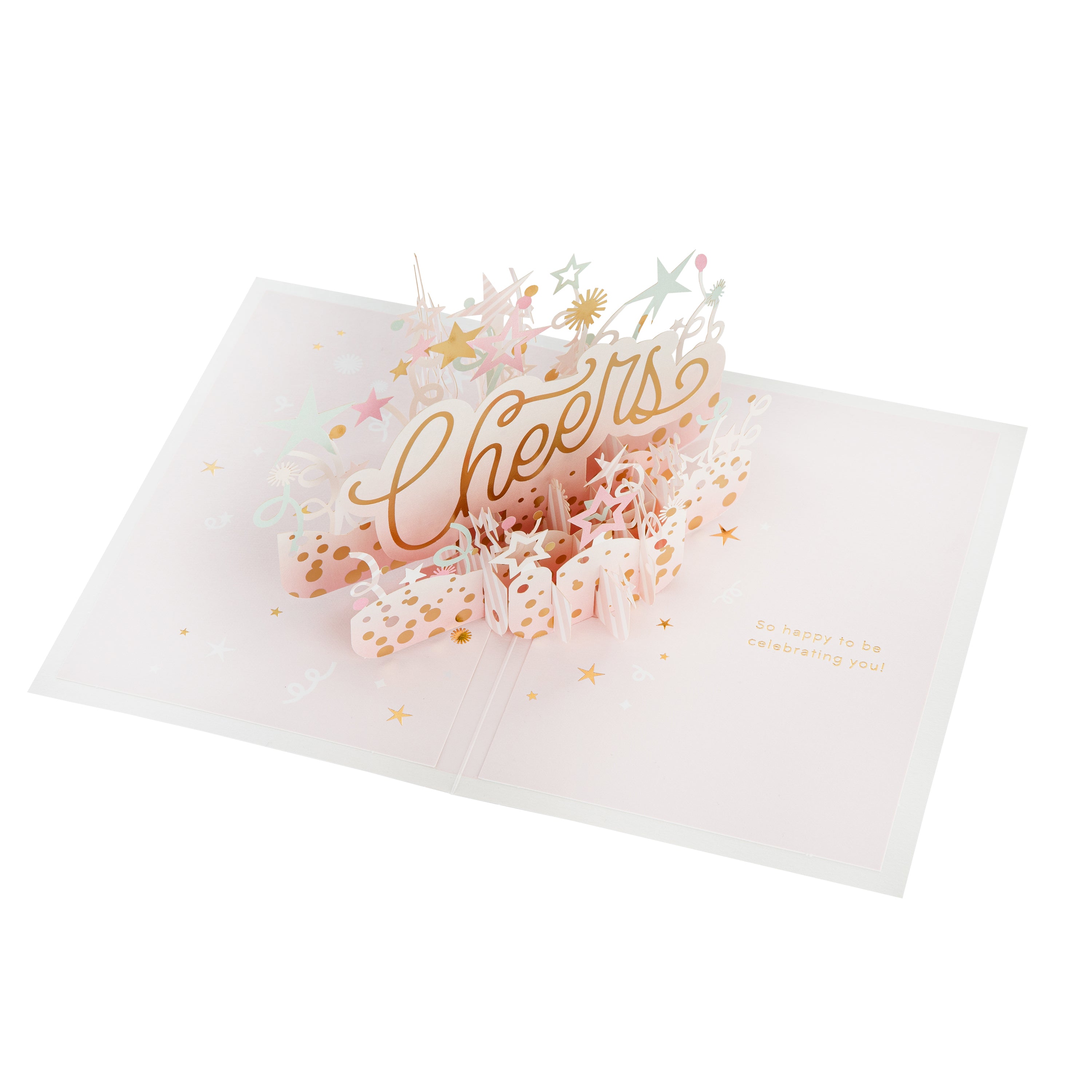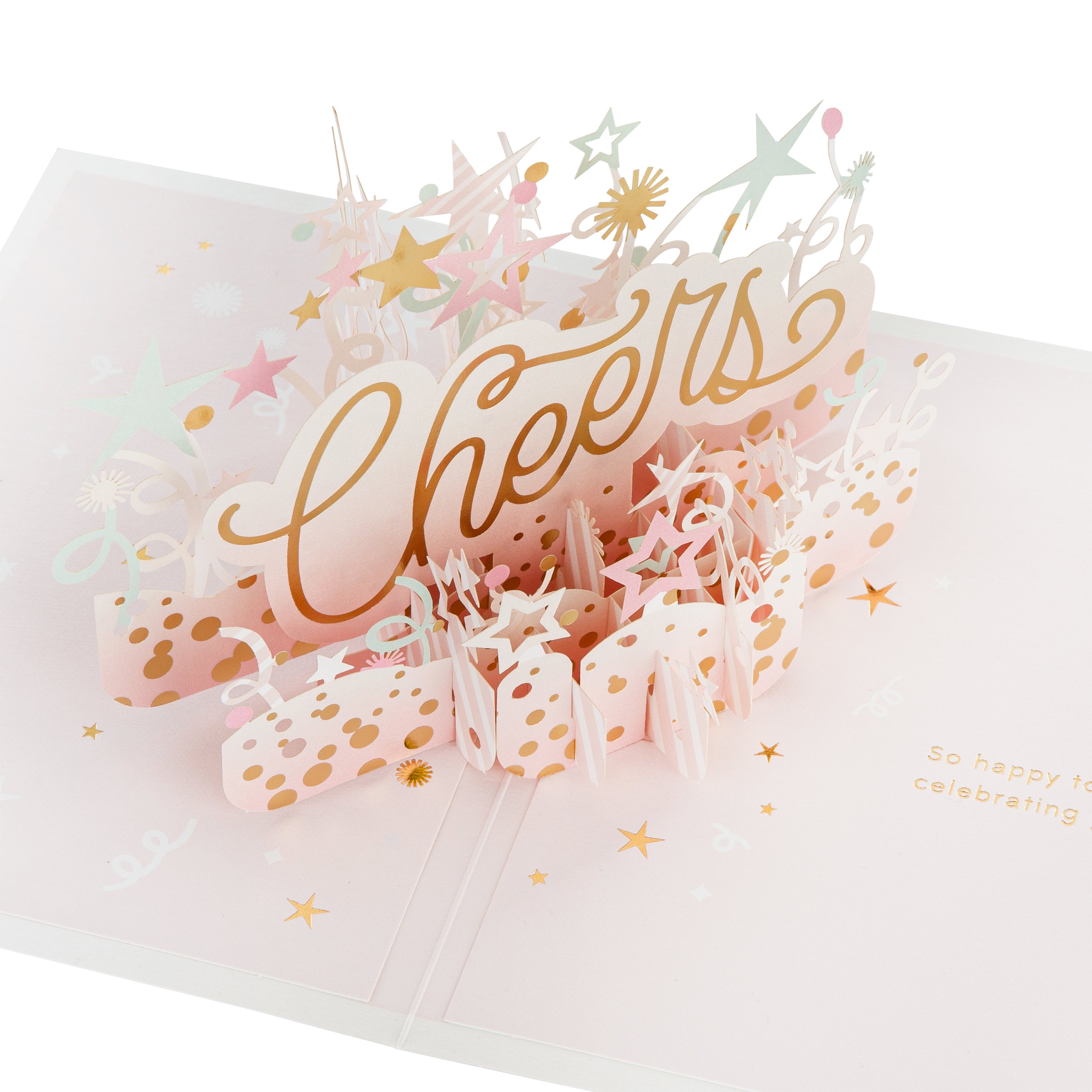 Printed on high-quality board, simply open this card up to reveal a 3D and pop-up display of stars and streamers, with the message 'Cheers'. This card features ombre pearlescent pink and white foil and metallic gold foil details, and laser cut details. This card comes complete with a Hallmark branded, pink envelope with gold foil lining.