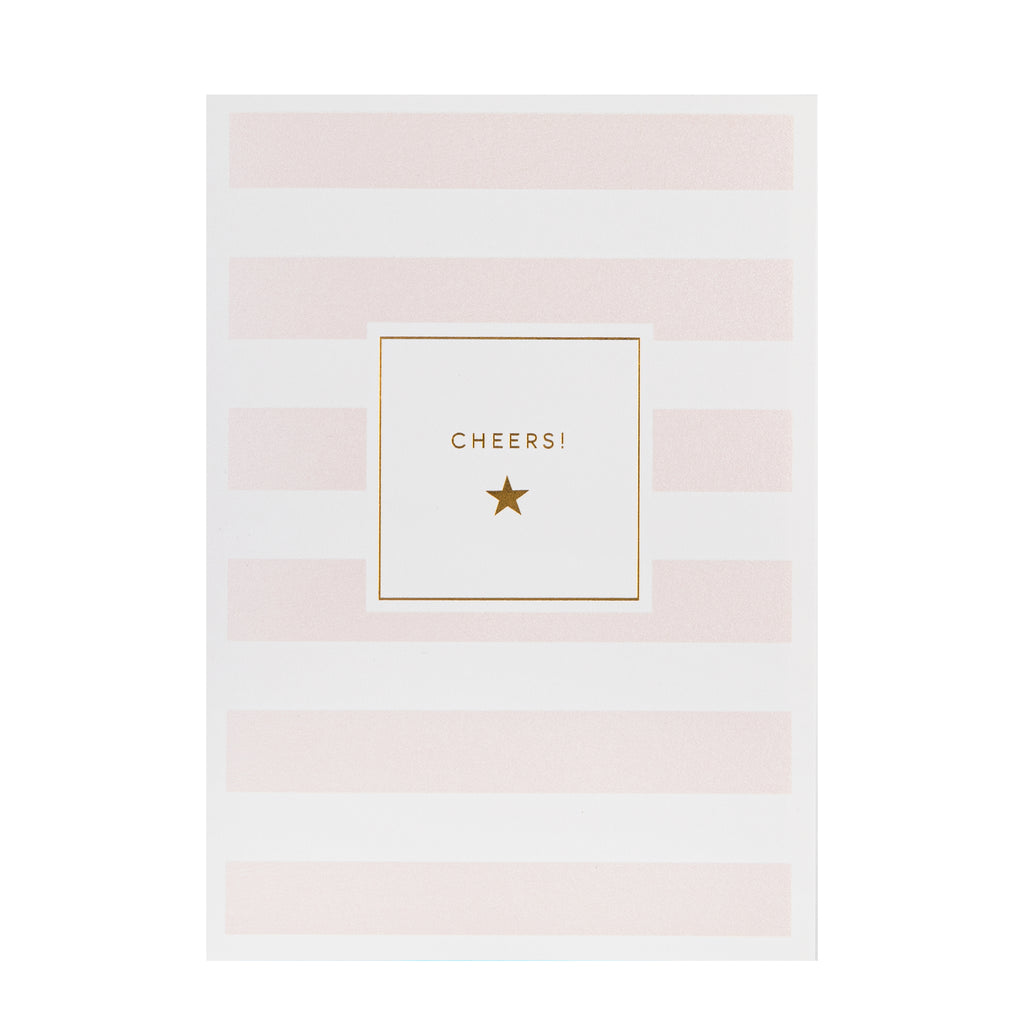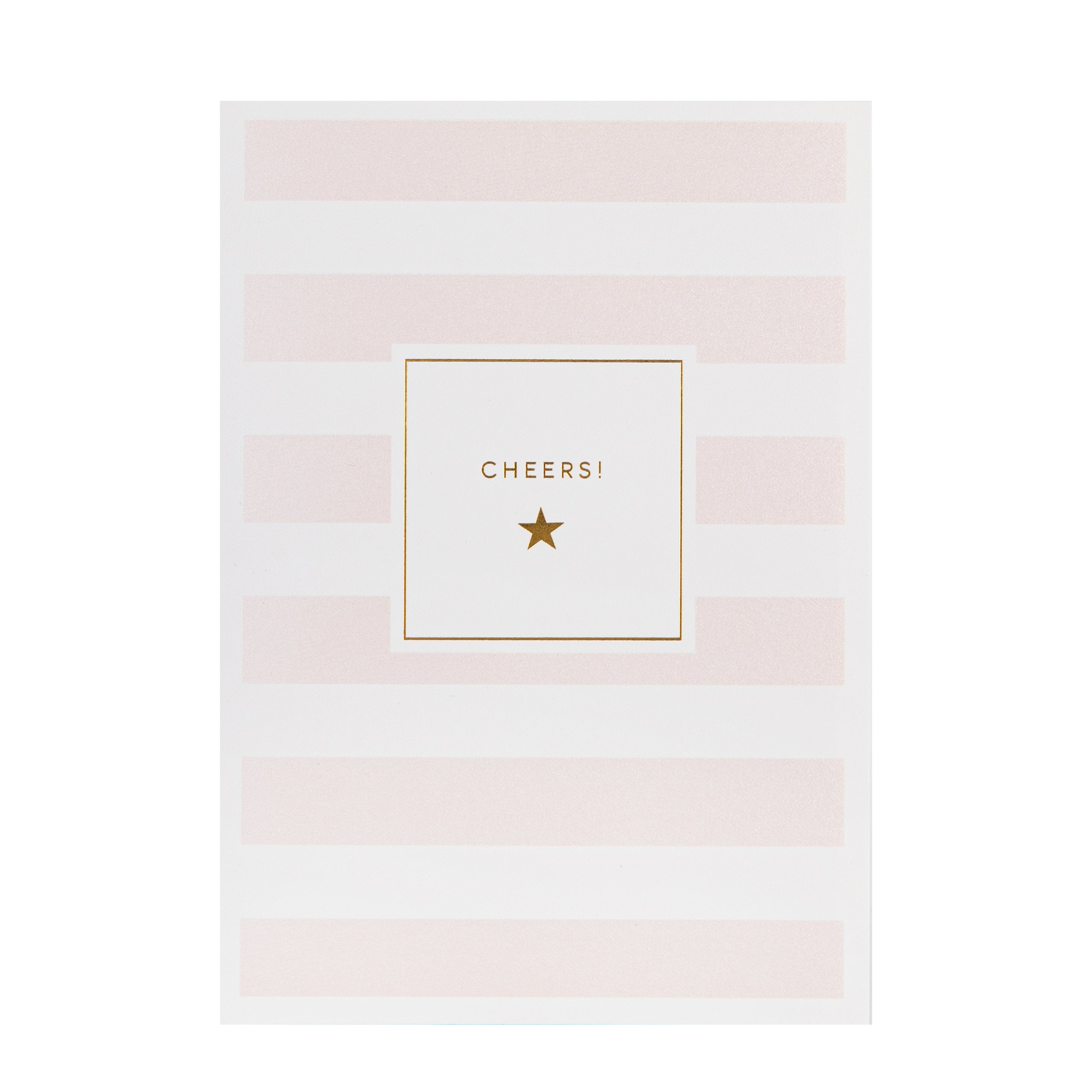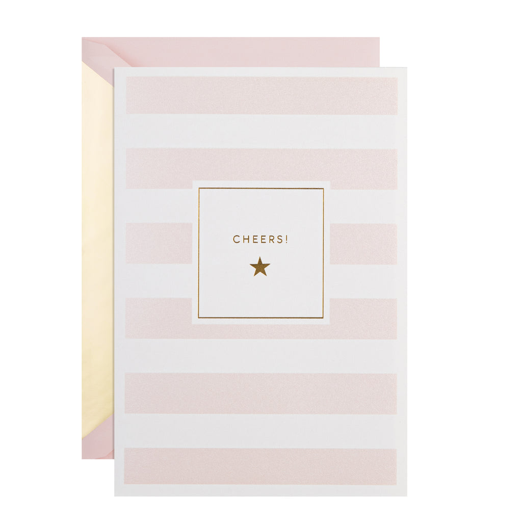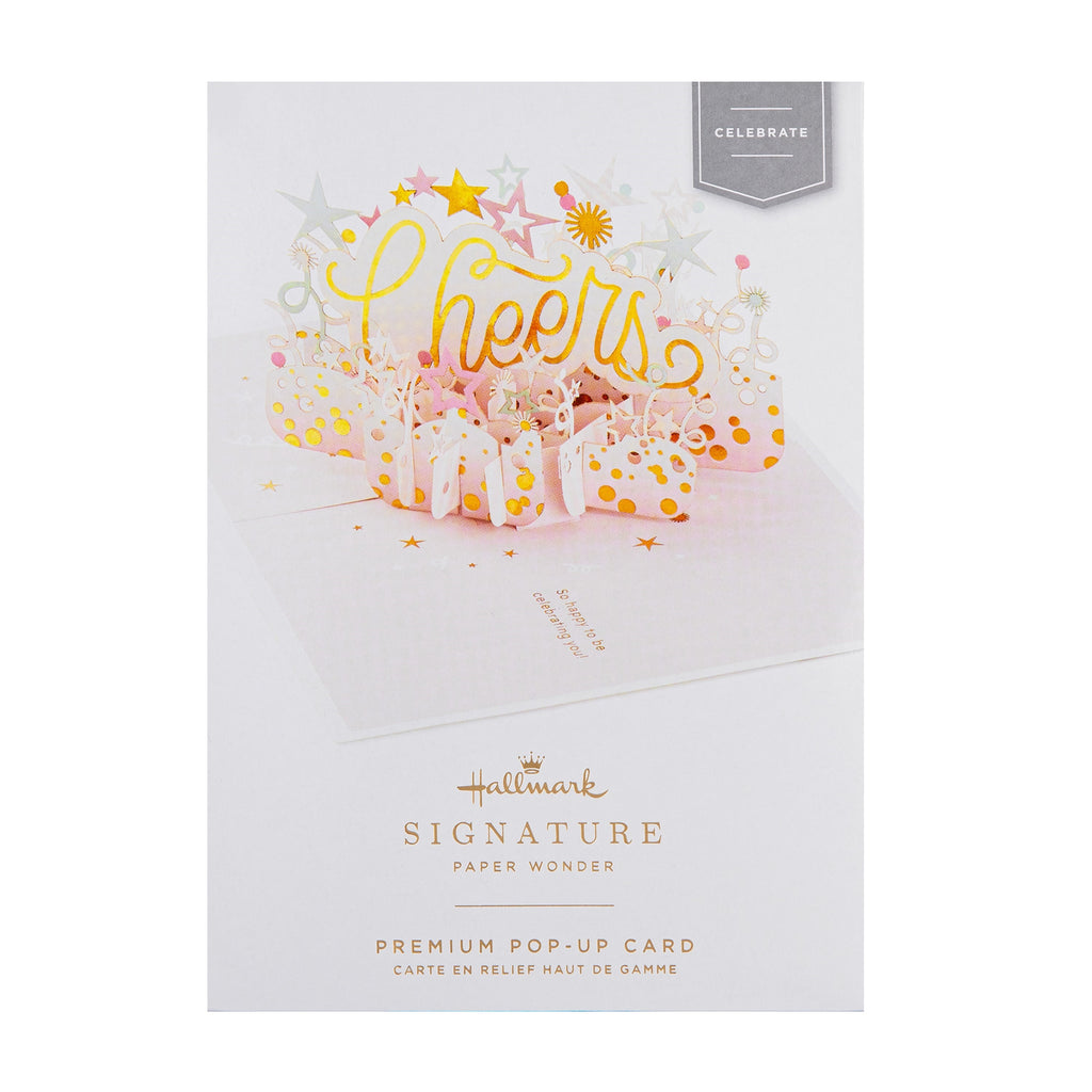 Printed on high-quality board, simply open this card up to reveal a 3D and pop-up display of stars and streamers, with the message 'Cheers'. This card features ombre pearlescent pink and white foil and metallic gold foil details, and laser cut details. This card comes complete with a Hallmark branded, pink envelope with gold foil lining.