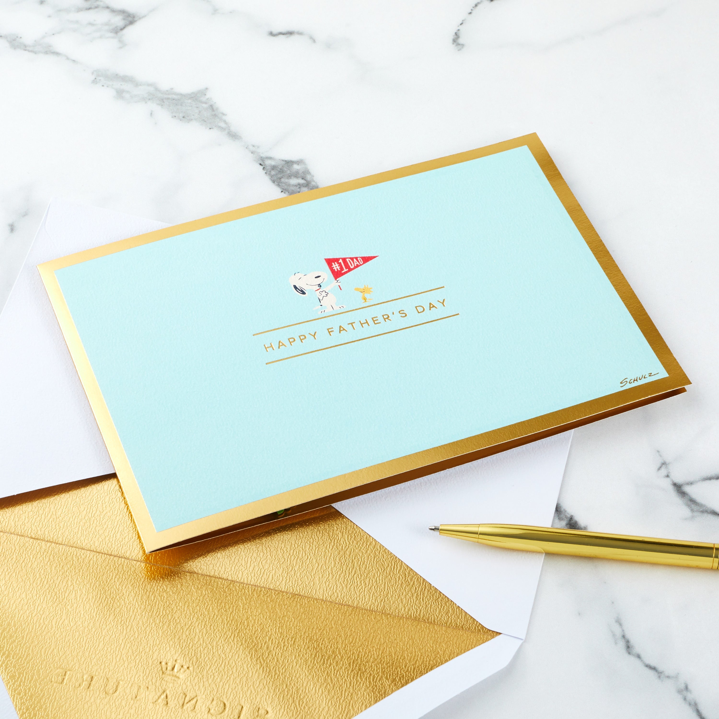 Printed on high-quality board, simply open the card up to reveal a 3D and pop-up surprise of SNOOPY and WOODSTOCK stood on top of SNOOPY's dog house with 'HOORAY' and '#1 Dad' pennants, and a 'Dad of the Year' banner. The card features gold foil details, die-cut details and the message 'Happy Father's Day' on the front of the card with SNOOPY and WOODSTOCK holding a '#1 Dad' pennant. This card comes complete with a co-ordinating Hallmark Signature branded, white envelope with a gold foil lining inside.