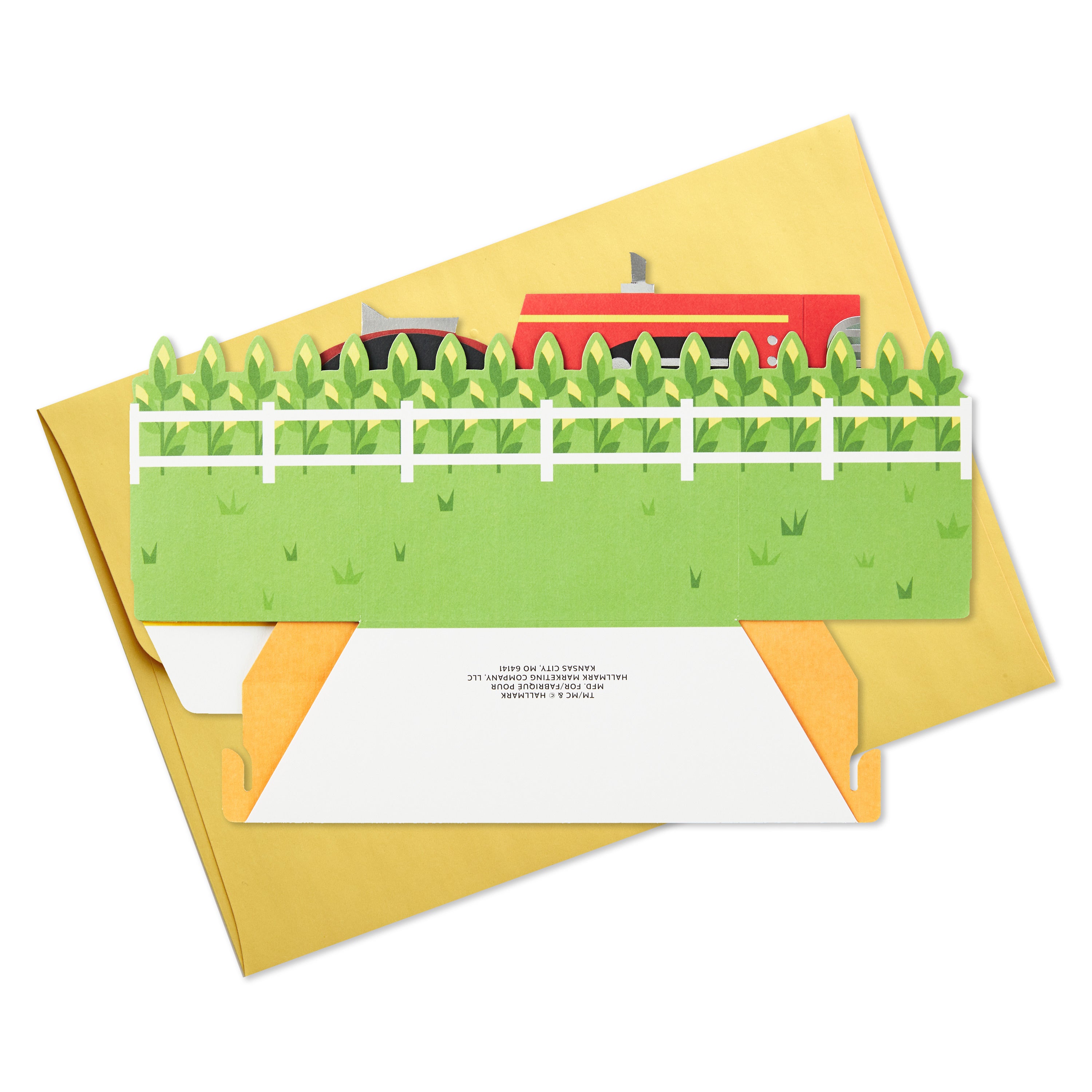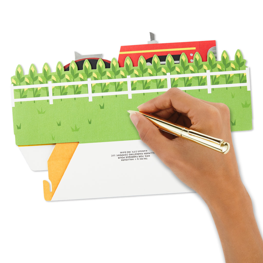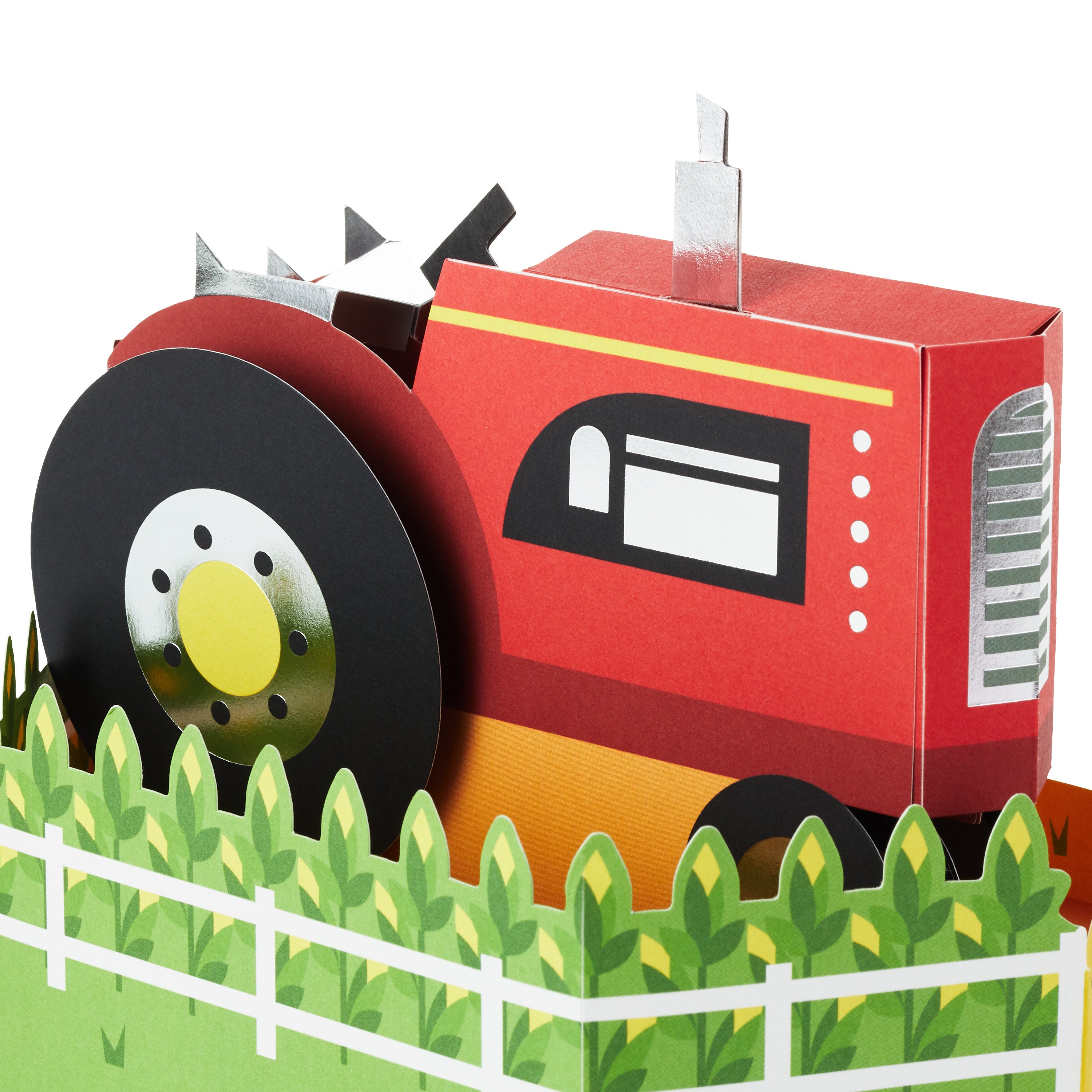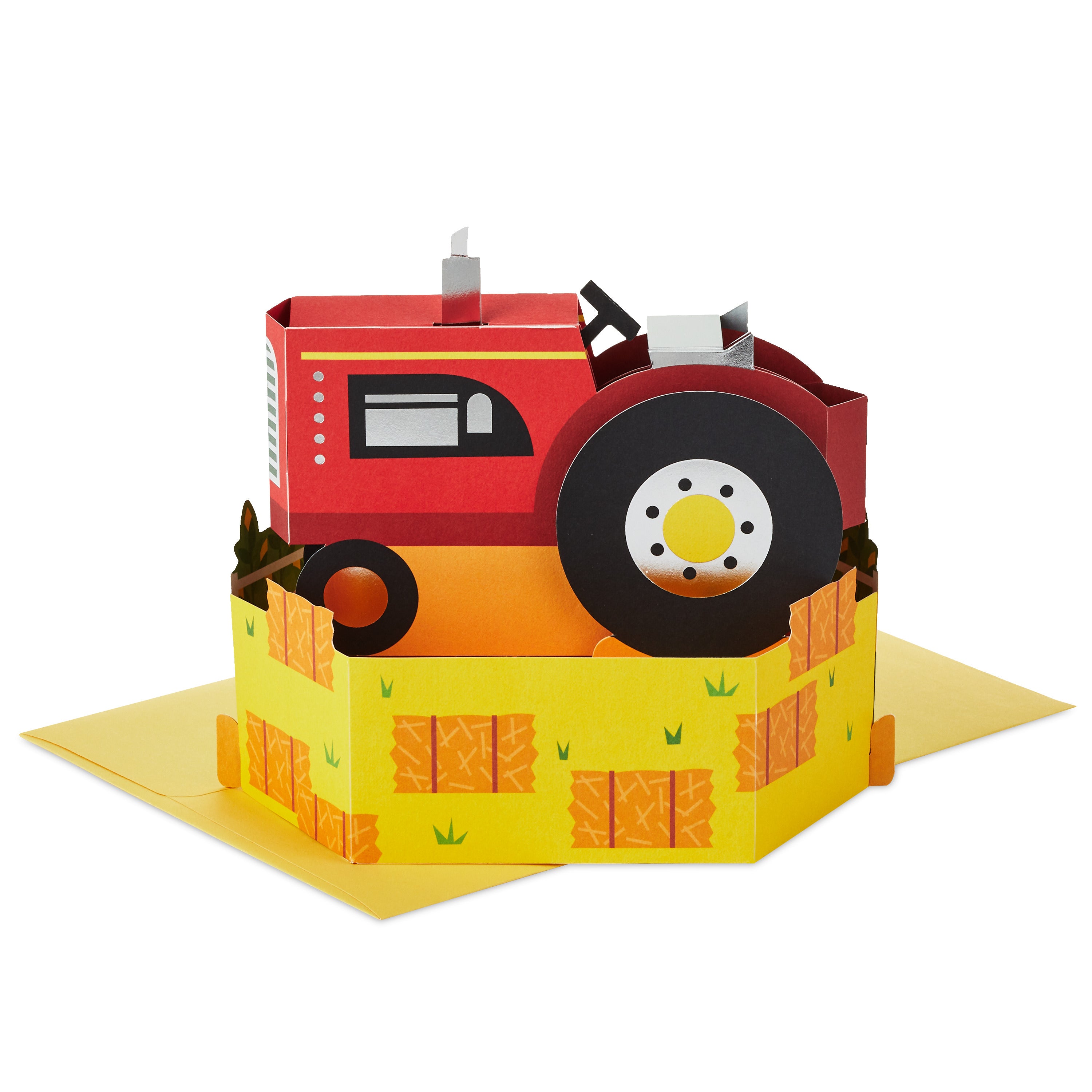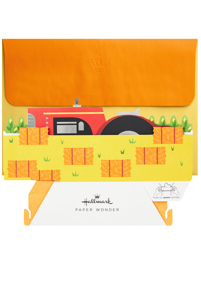 Printed on high-quality board, this card pops-up into a 3D display of a red tractor with hay bales, features metallic silver foil details, and comes complete with a Hallmark branded, yellow envelope.