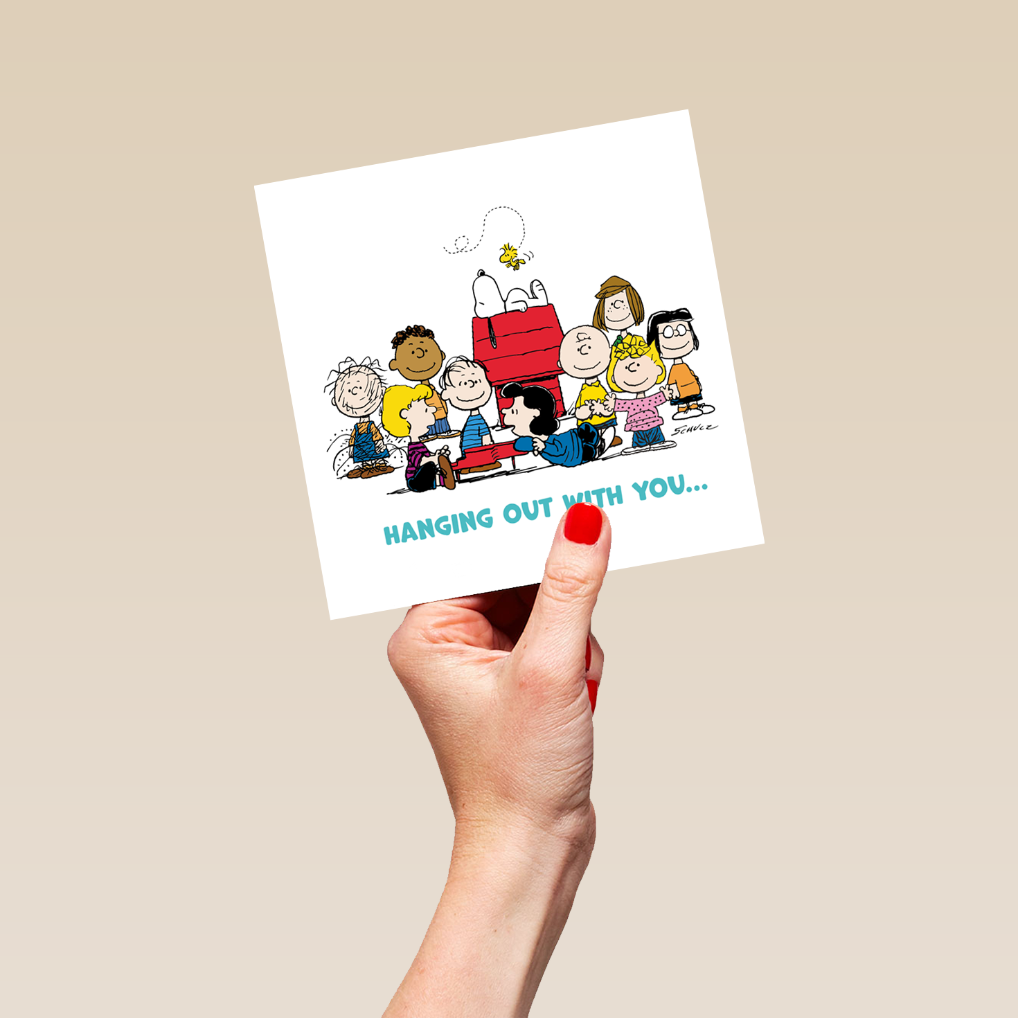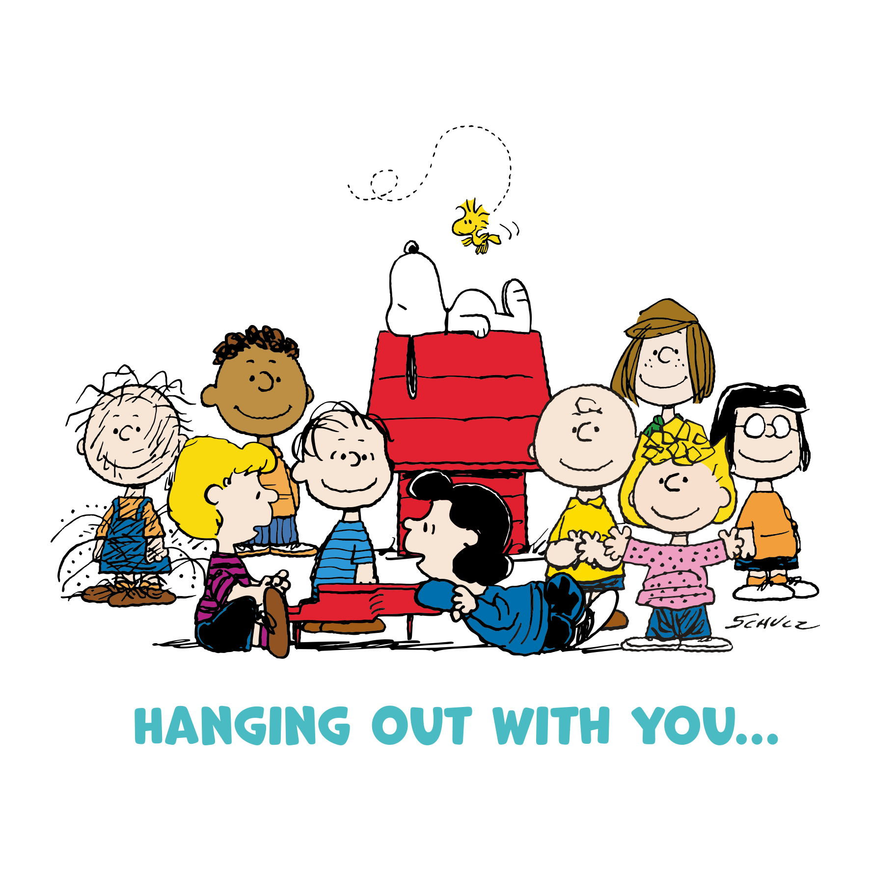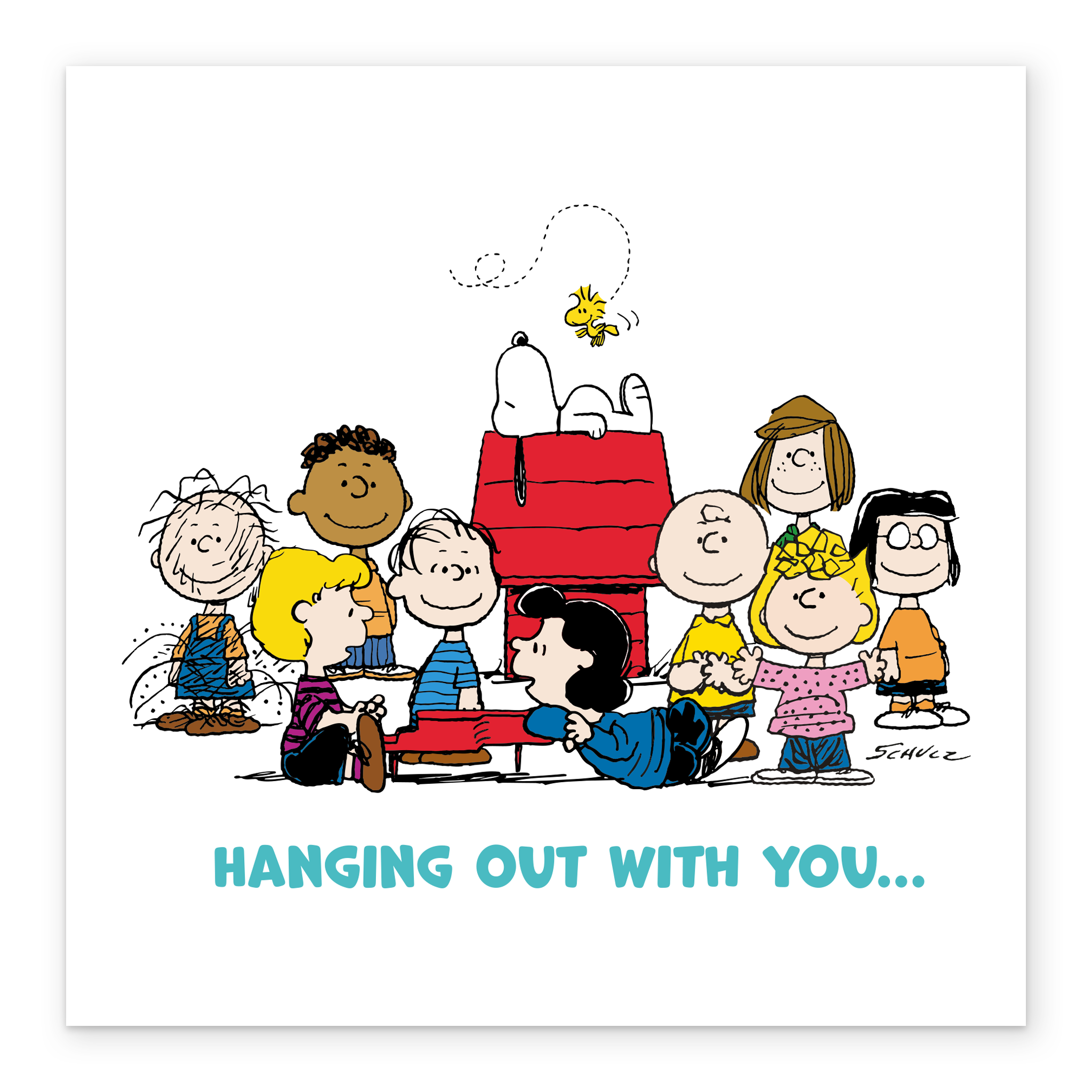Printed on premium-quality board, this card features an illustration of the entire PEANUTS™️ gang surrounding SNOOPY's kennel, set against a plain white background above bright turquoise lettering, with the message 'Hanging out with you…', and comes complete with a co-ordinating white envelope.