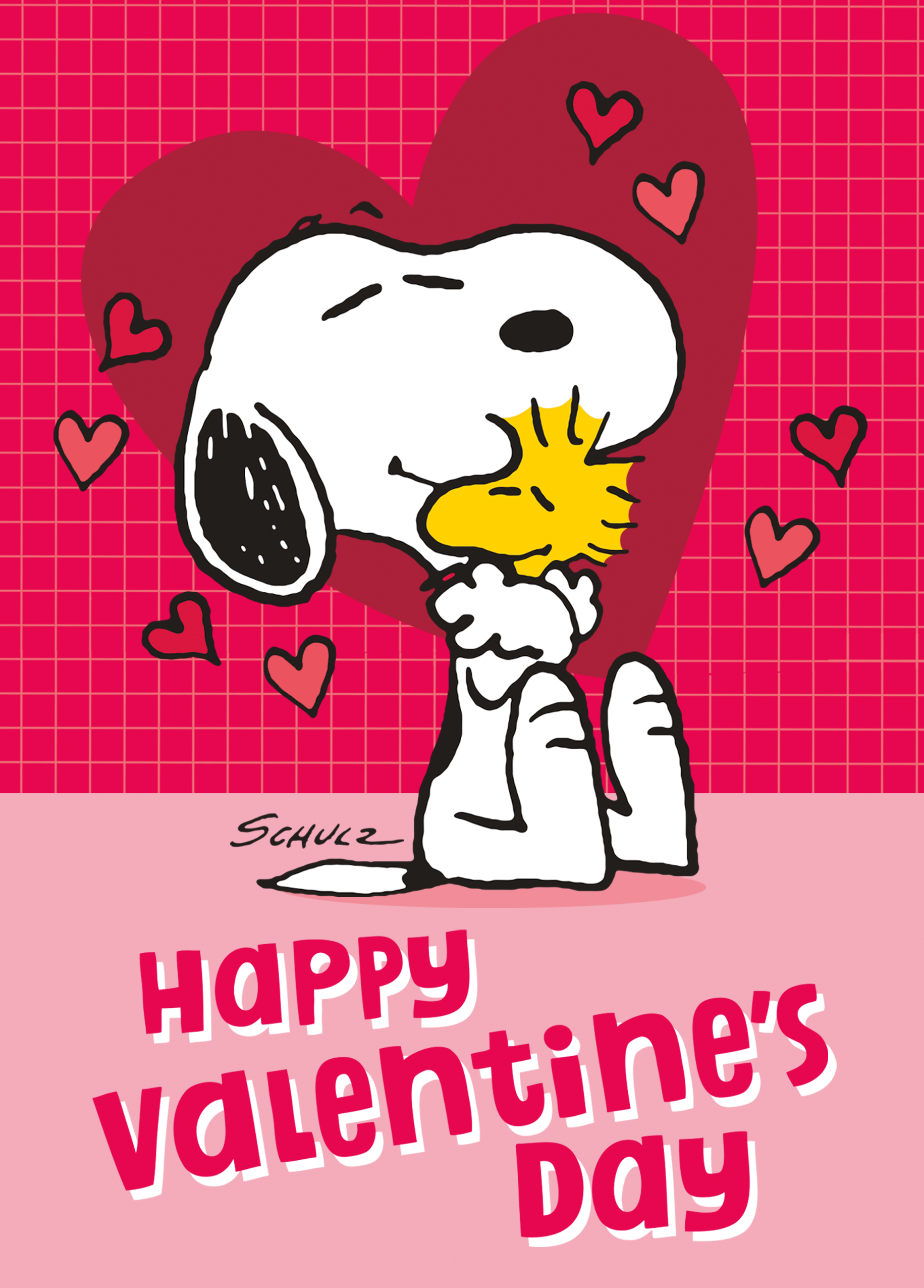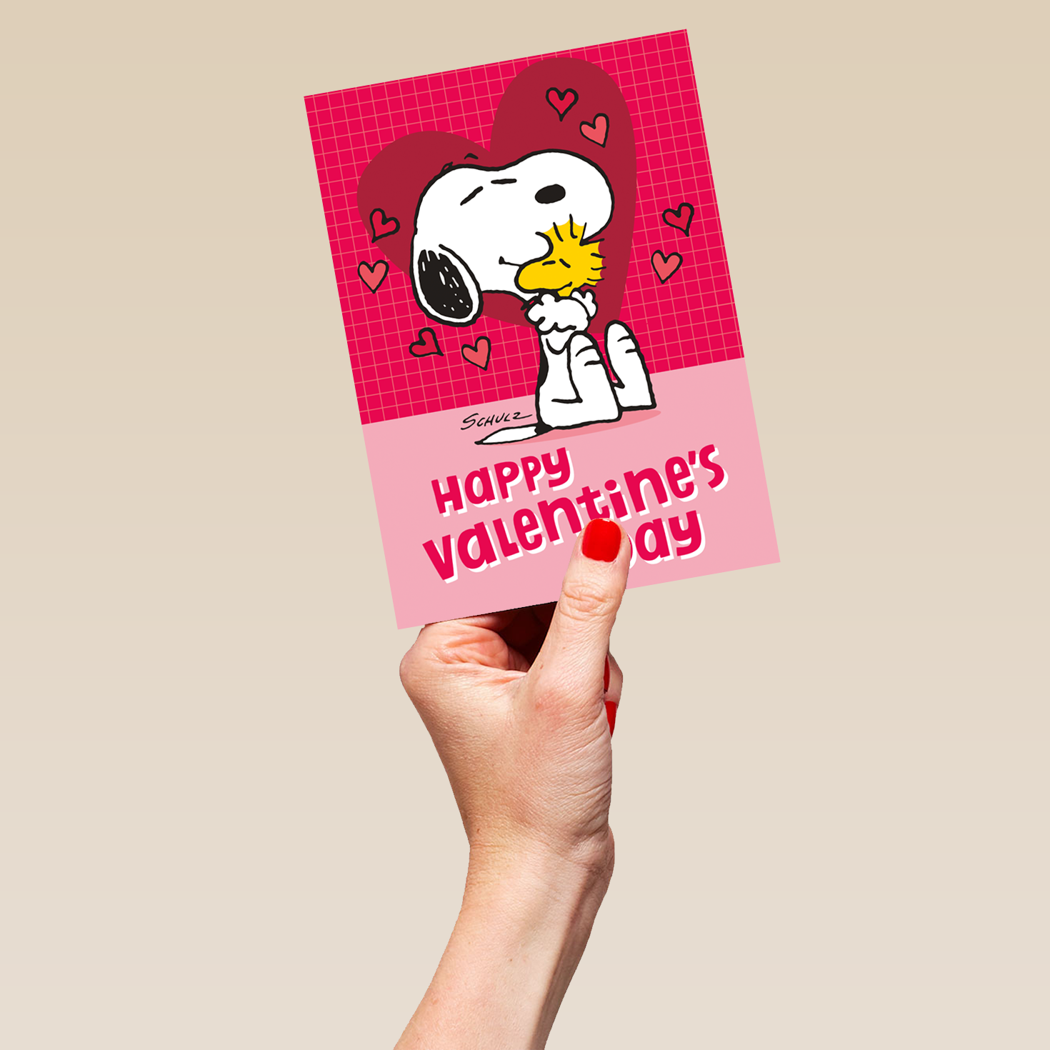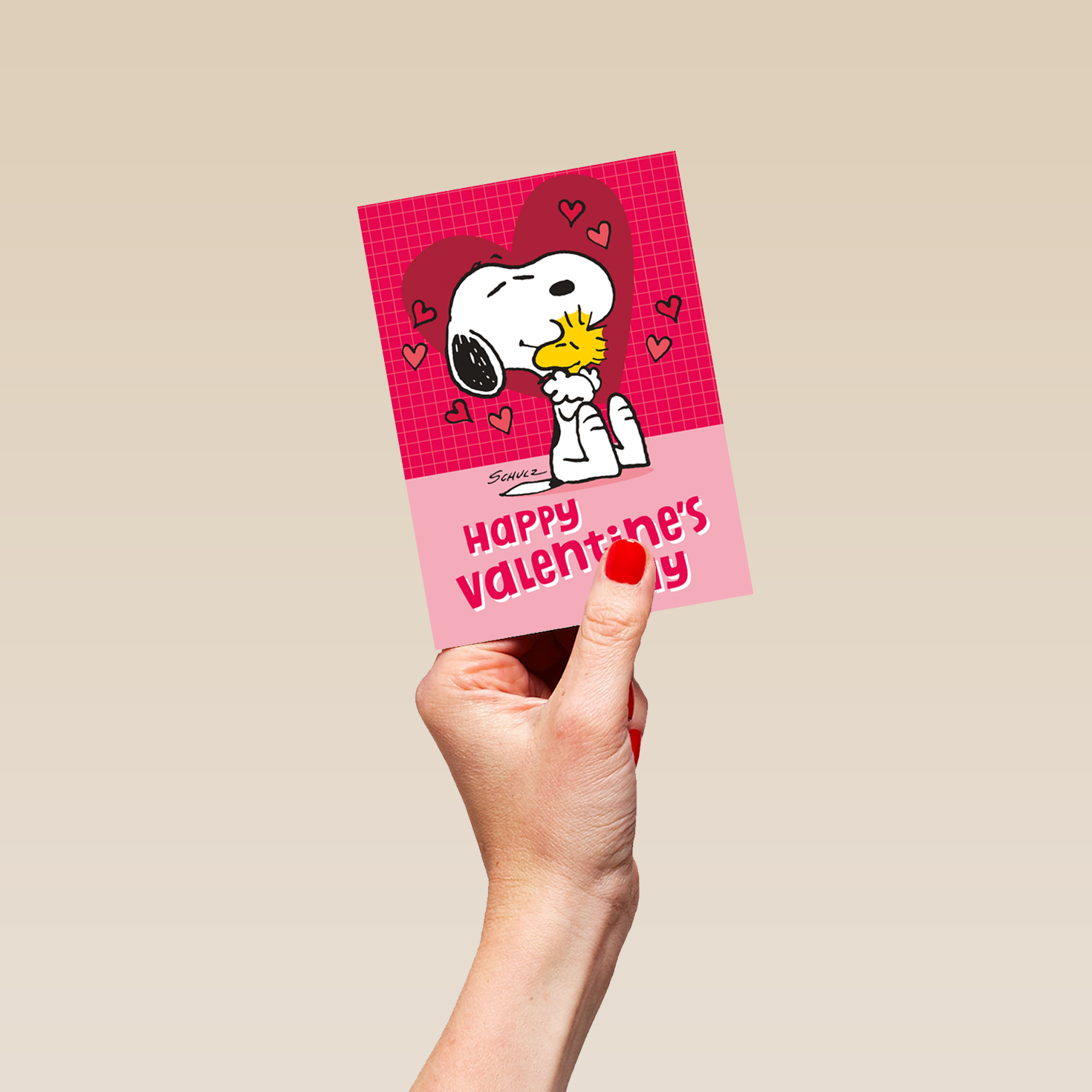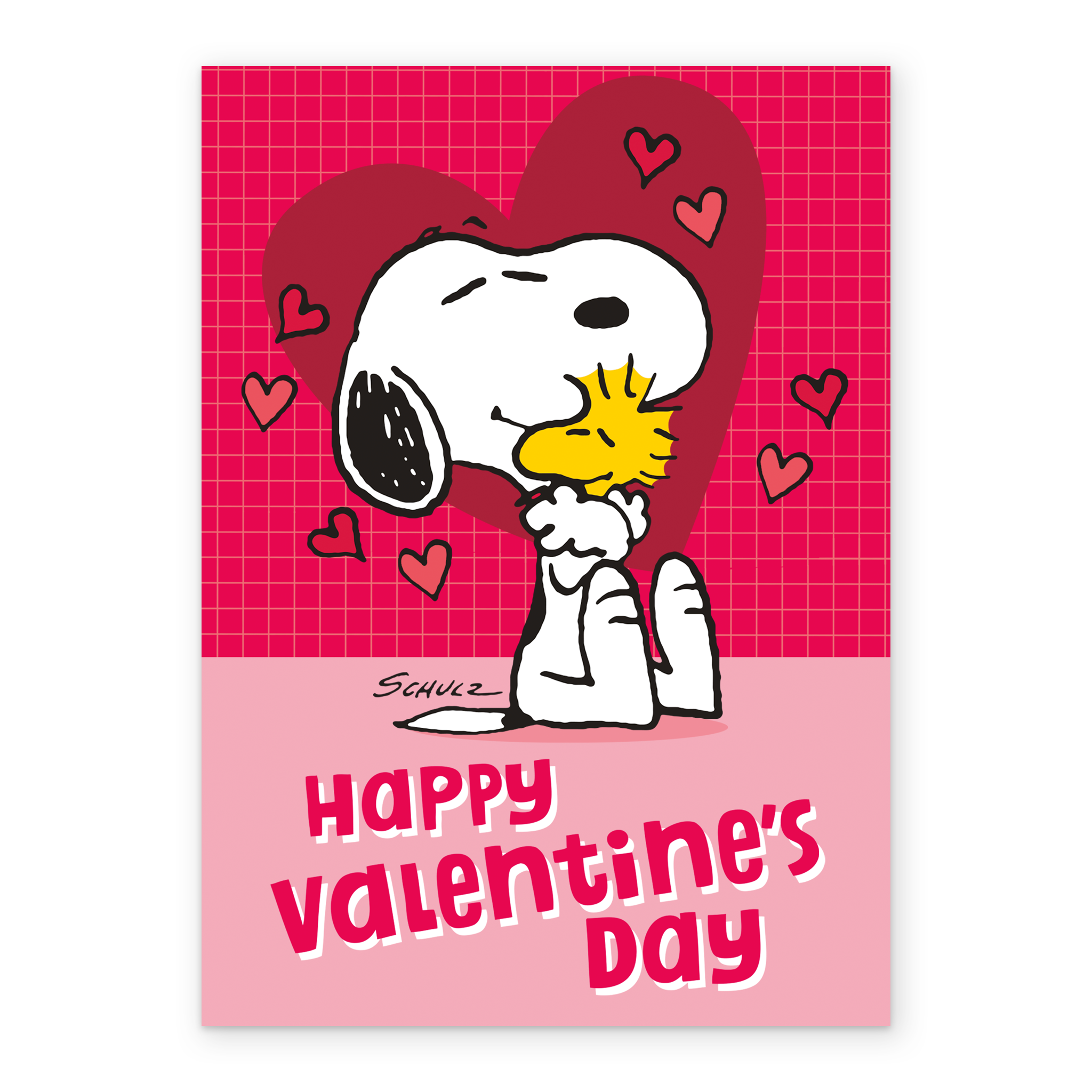 Printed on premium-quality board, this card features SNOOPY and Woodstock sharing a big cuddle, against a half pale, half bright pink background, surrounded by small pink and red hearts, above bright pink and white, 3D effect lettering , with the message 'Happy Valentine's Day', and comes complete with a co-ordinating white envelope.