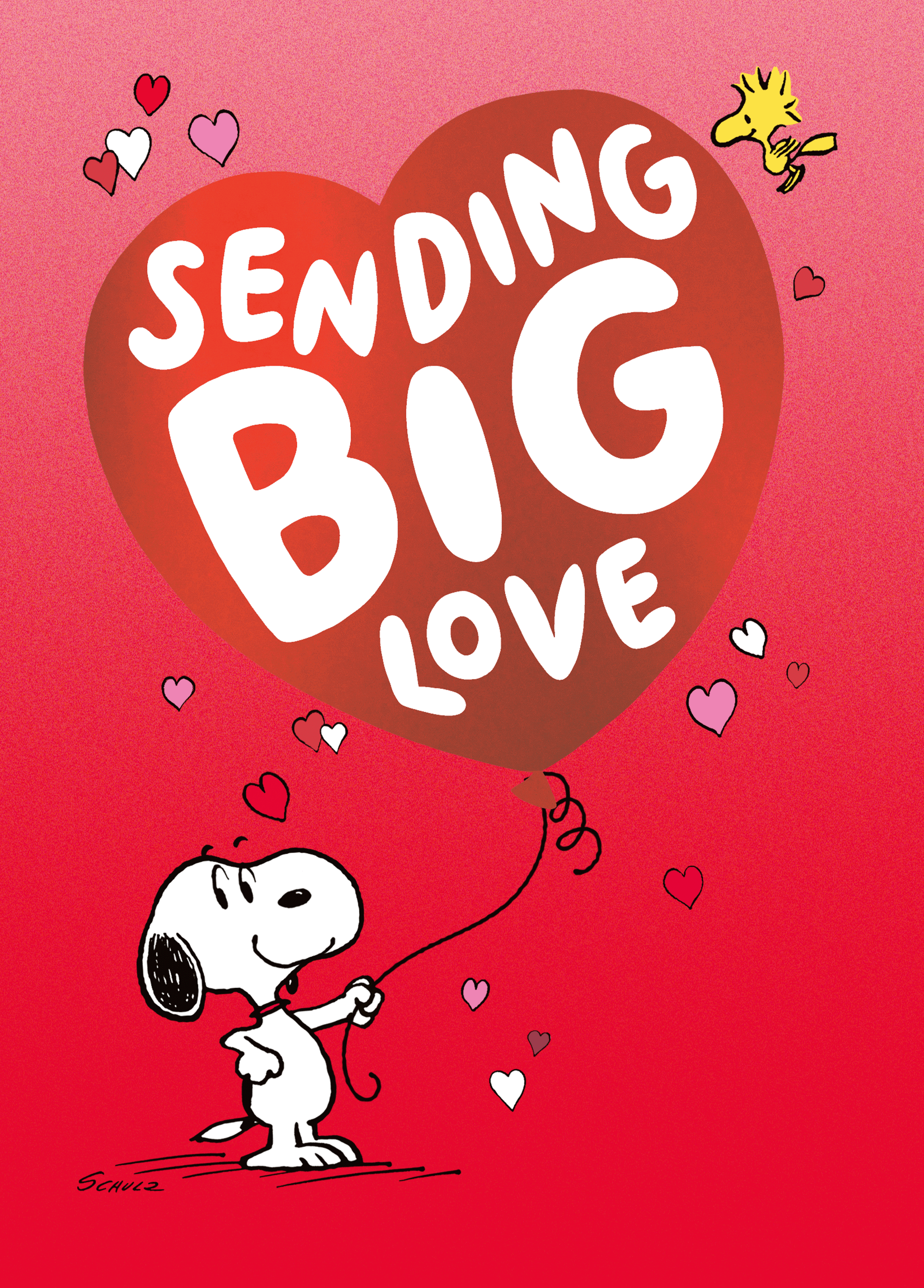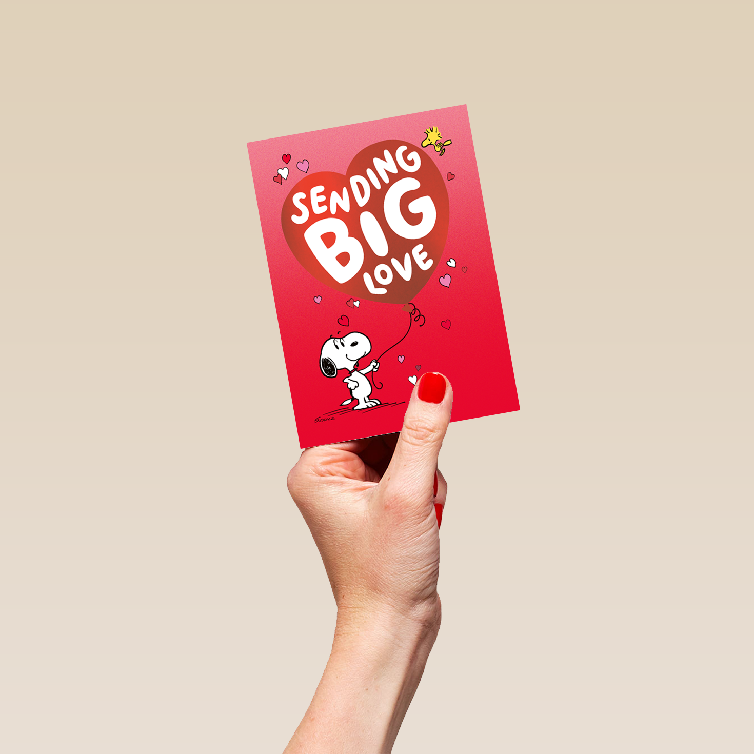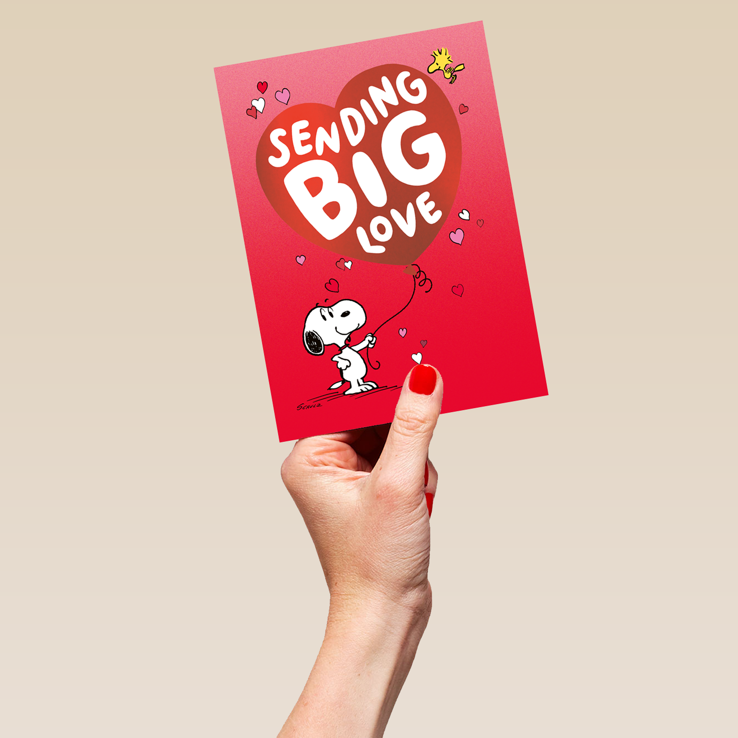Printed on premium-quality board, this card features an ombre pink/red background, dotted with small red and white heart shapes, with Woodstock fluttering in the top right corner and a smiling SNOOPY holding a large, red, heart shaped balloon filled with white lettering, with the message 'Sending BIG Love', and comes complete with a co-ordinating white envelope.